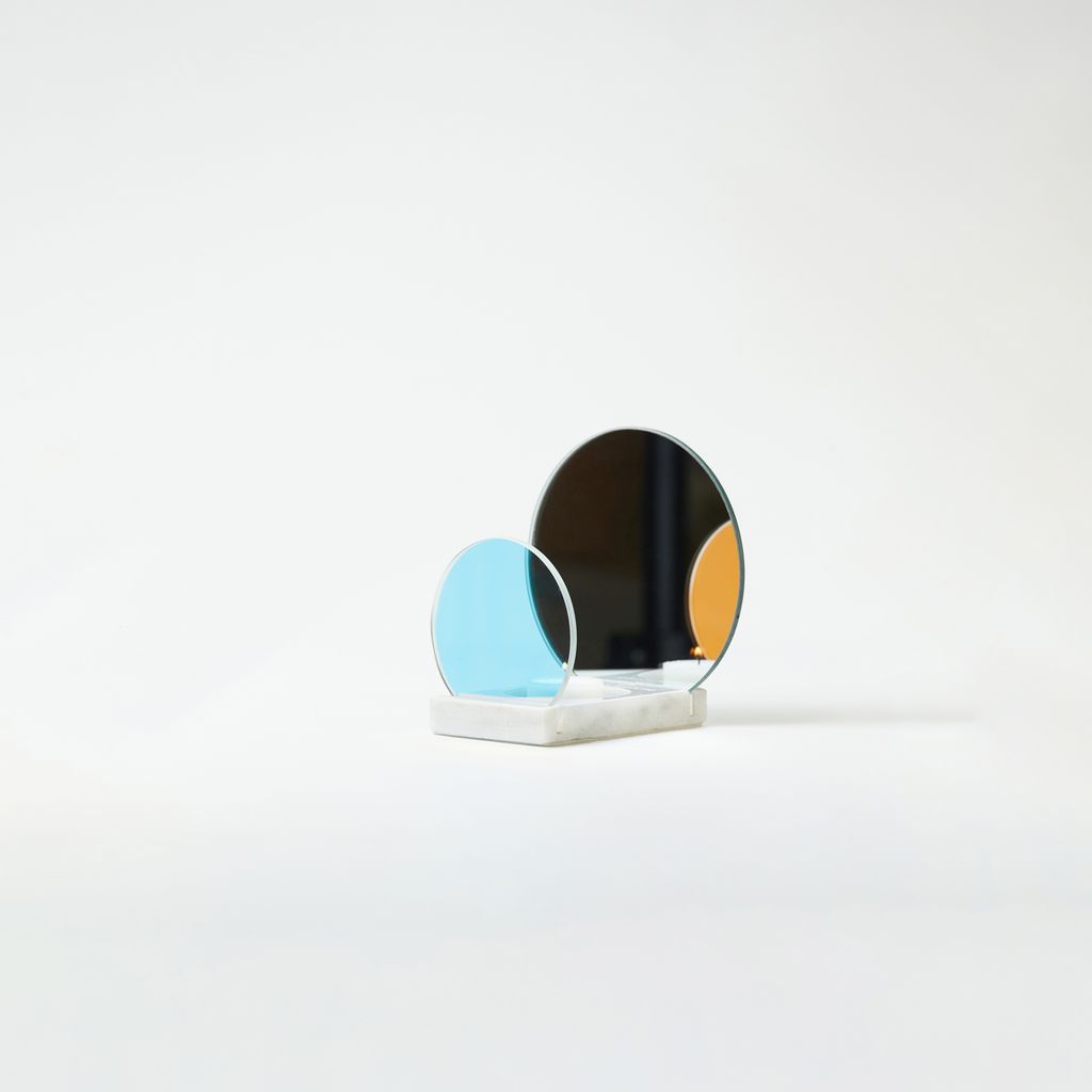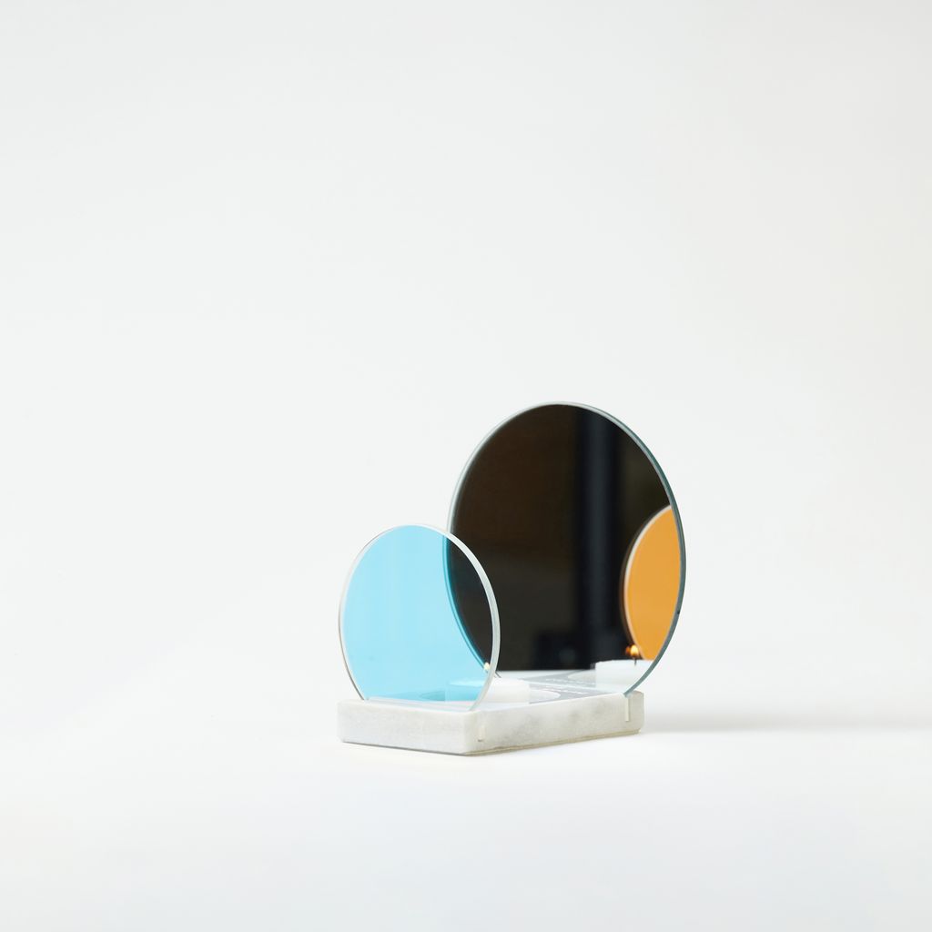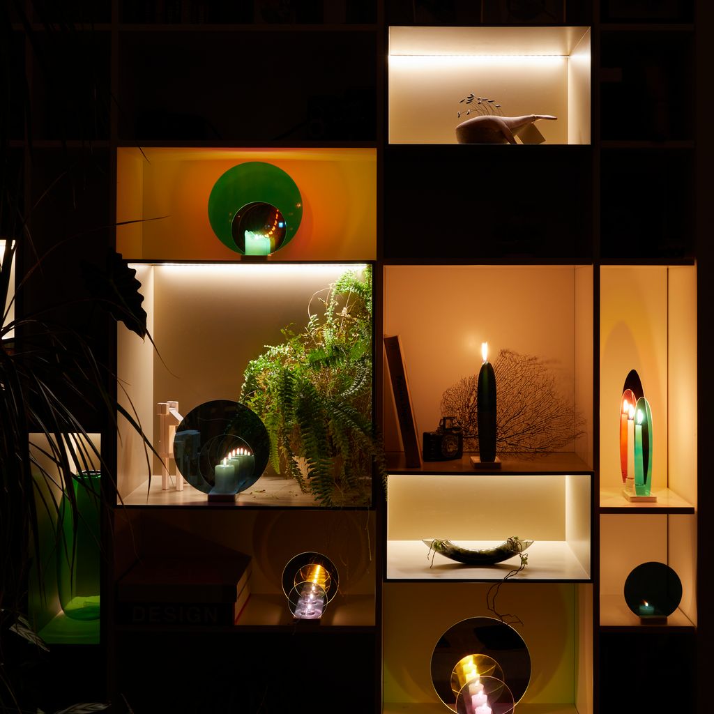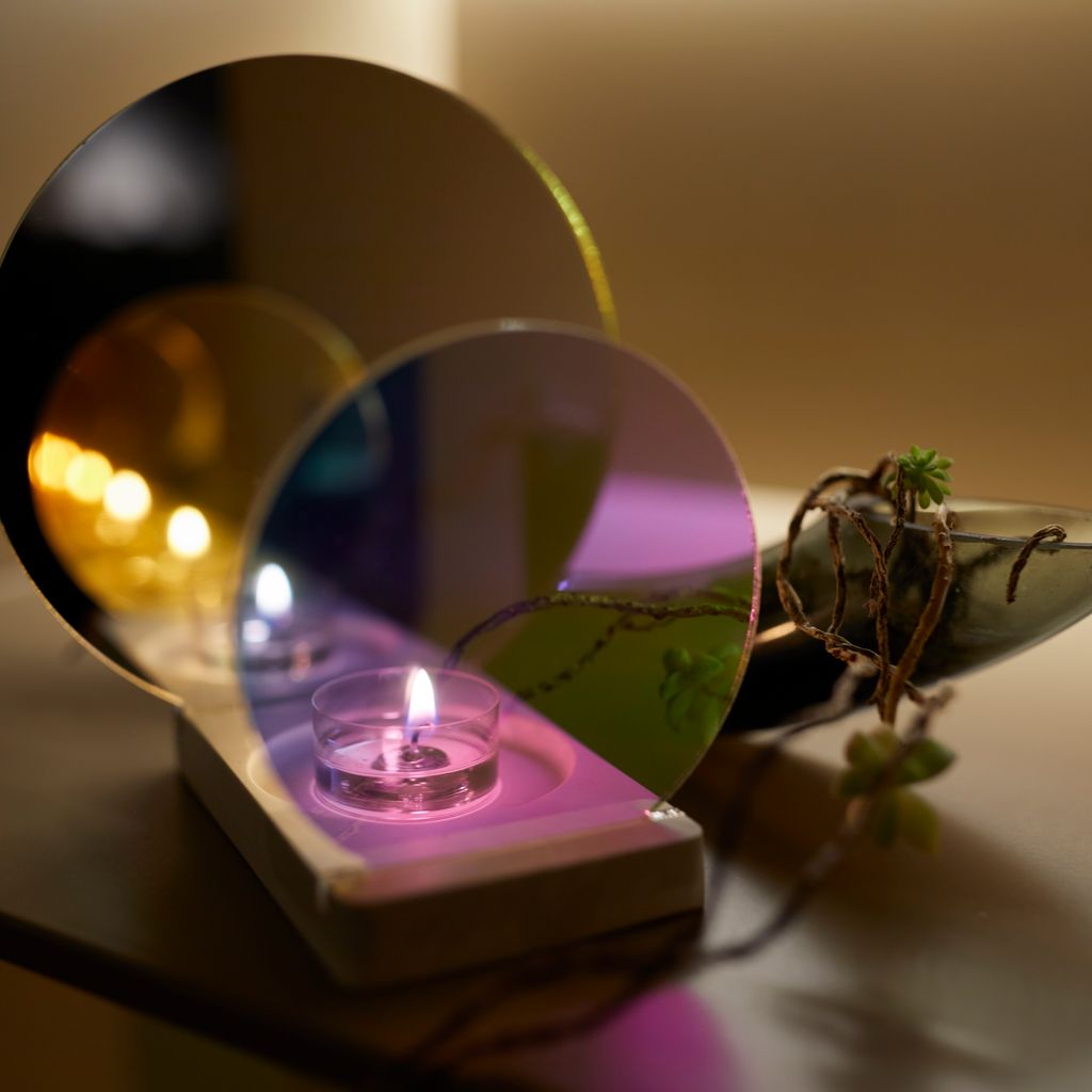 Its dichroic glass disks create a mesmerizing dance of color, light, and infinitely mirrored flames that shift with every viewpoint. Resting on a marble base, it is designed for tealights. The piece transforms ordinary candlelight into a spectrum of reflections and shadows.