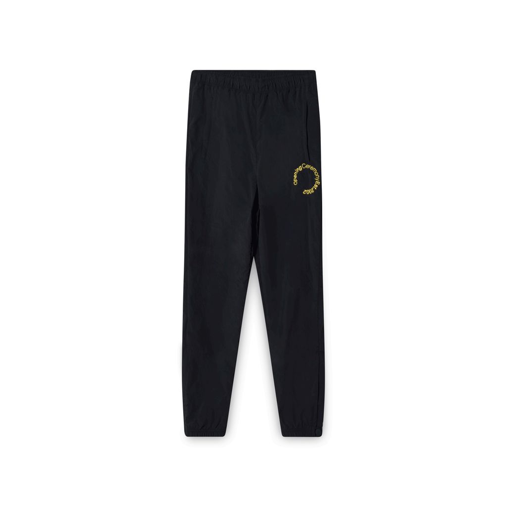Opening Ceremony black pants features yellow logo and mesh lining.
