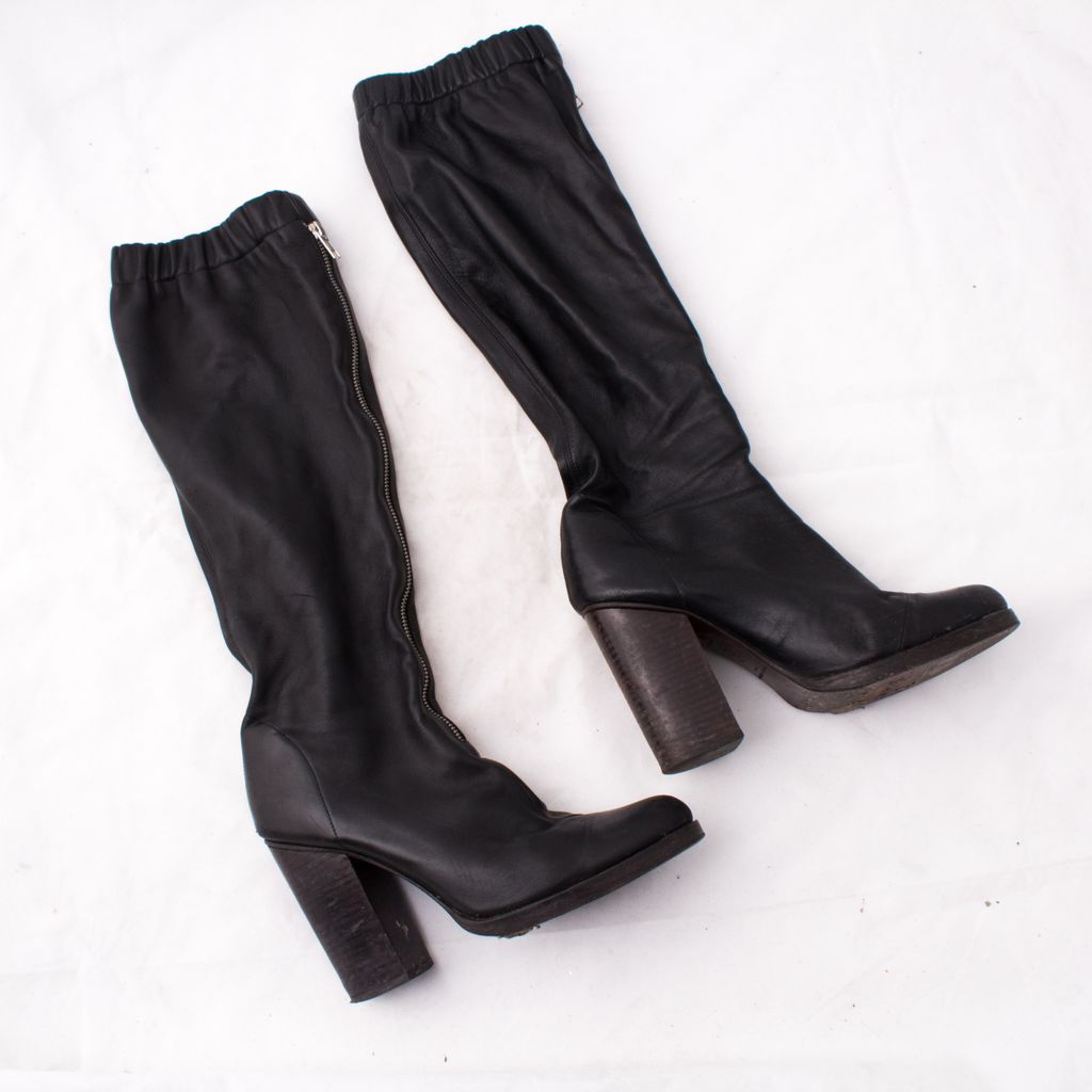 Gently worn, no appliqués, solid color, zip closure, round toeline, leather sole, square heel.