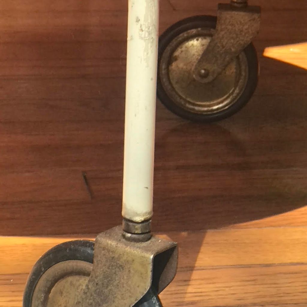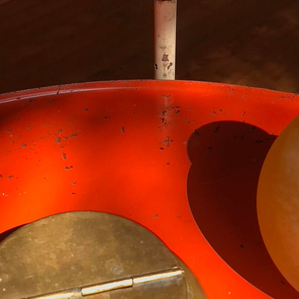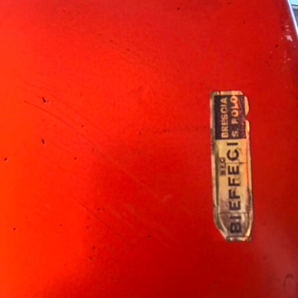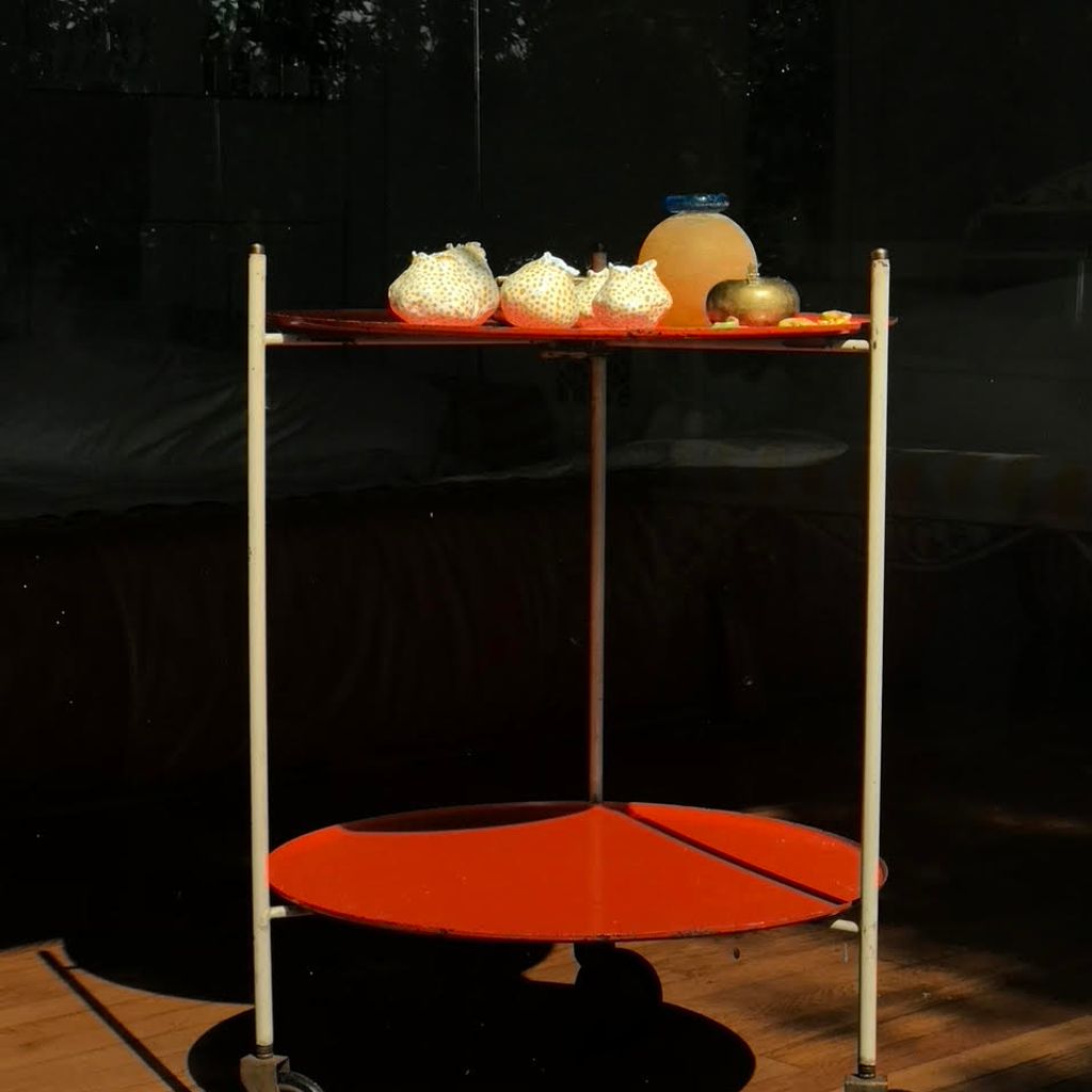 Beautiful minimalistic orange Bieffeci collapsible trolley designed in the 1960s. Attributed to martin Eisler and Carlo Hauner who designed an orange collection for Bieffeci. Trays clamp to the base, quality and strong construction, and wheels run well. In very used vintage condition with scratches and loss of paint to the trays and base.