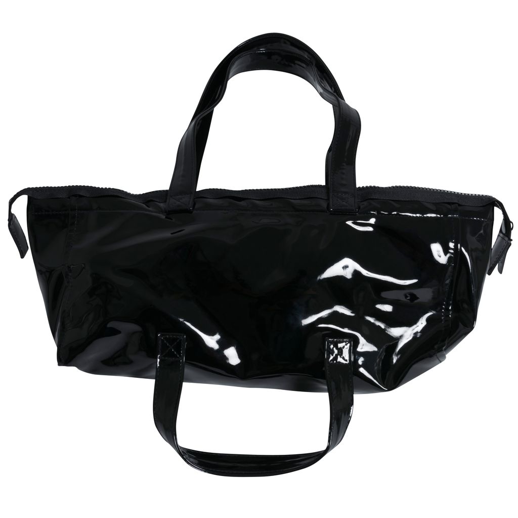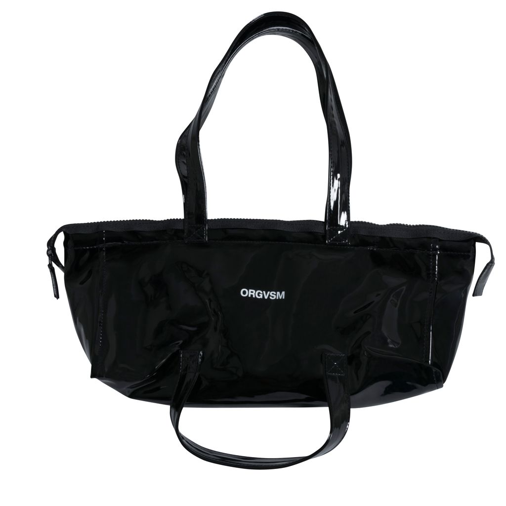 This tote bag from ORGVSM is crafted from black glossy vinyl fabrication, lined with faux-leather, zipper closure at top, top handles and bottom handles with logo on the front. In good condition. Minor scratching.