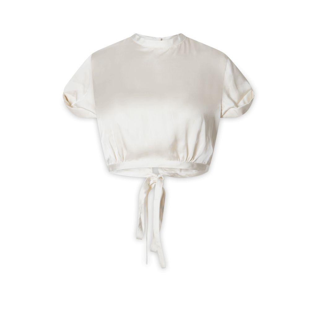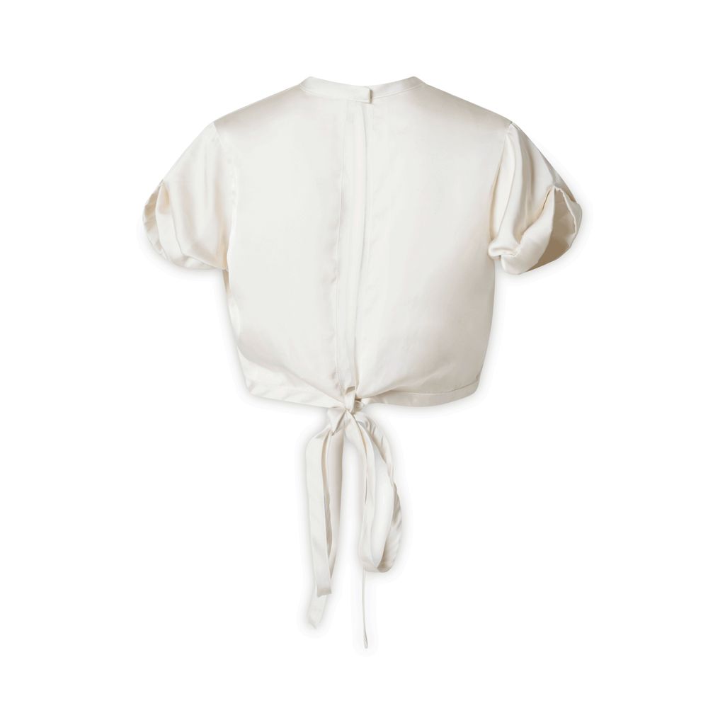 This soft and creamy blouse features an open back that ties with a ribbon at the waist.