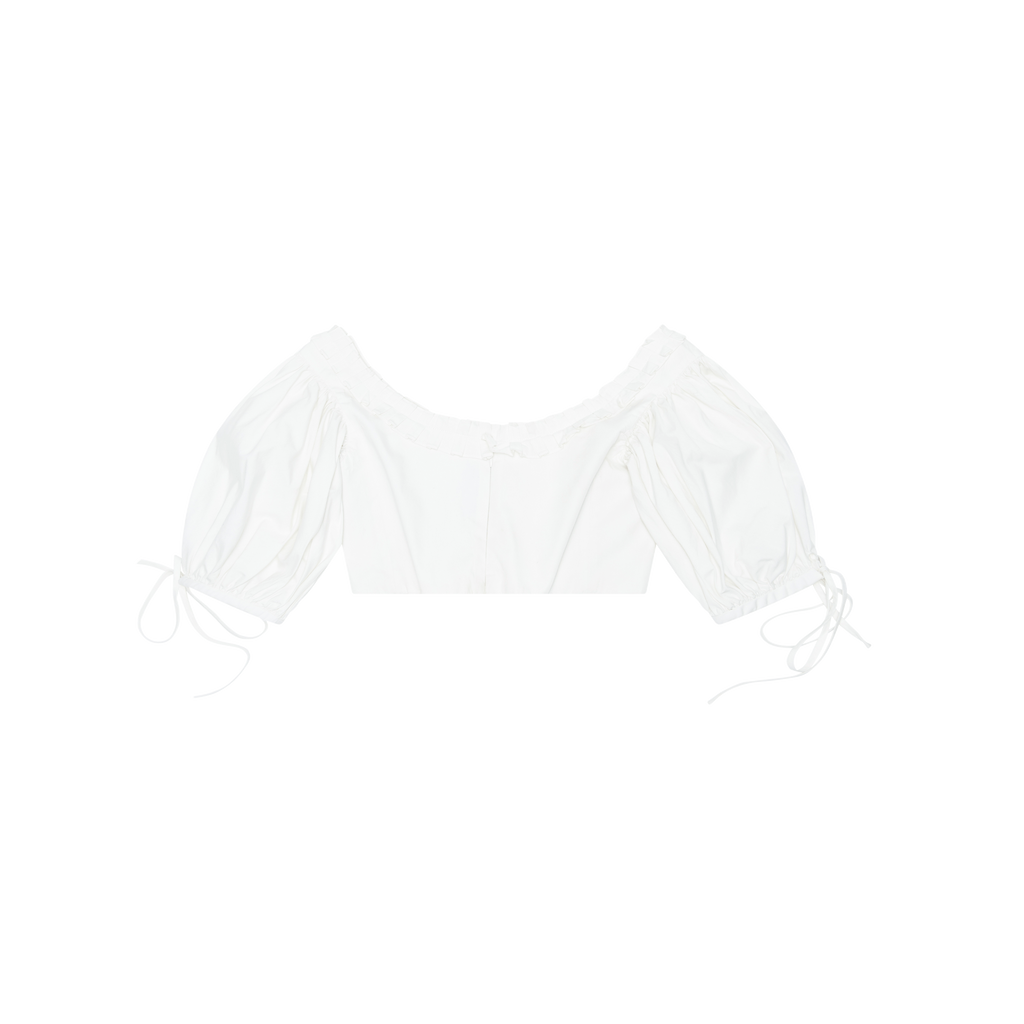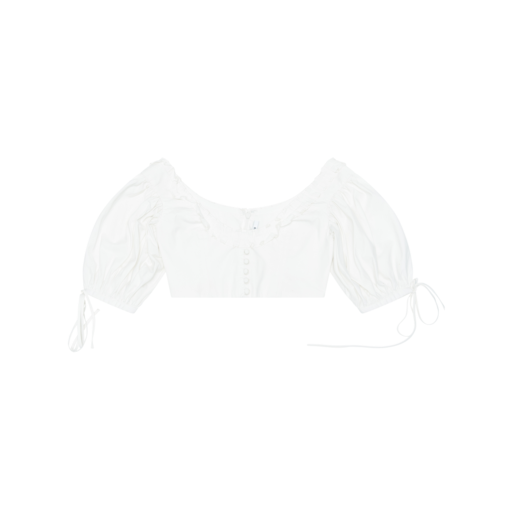Orseund Iris Princess Top features cropped length, puffed sleeves with ties, hidden back zipper, ruffled scoop neck collar, and inner boning.
