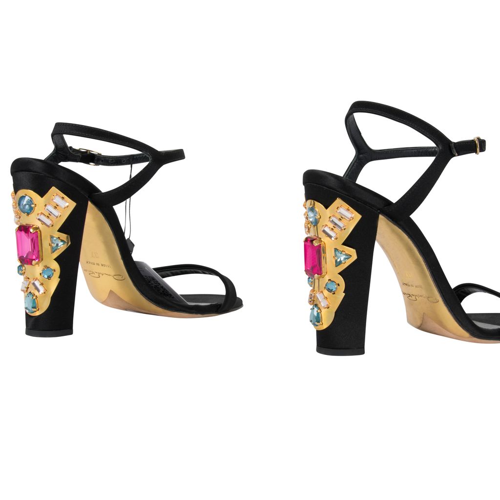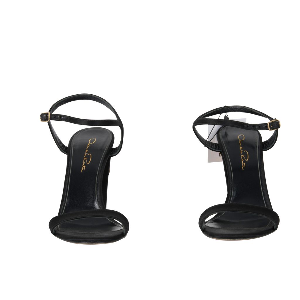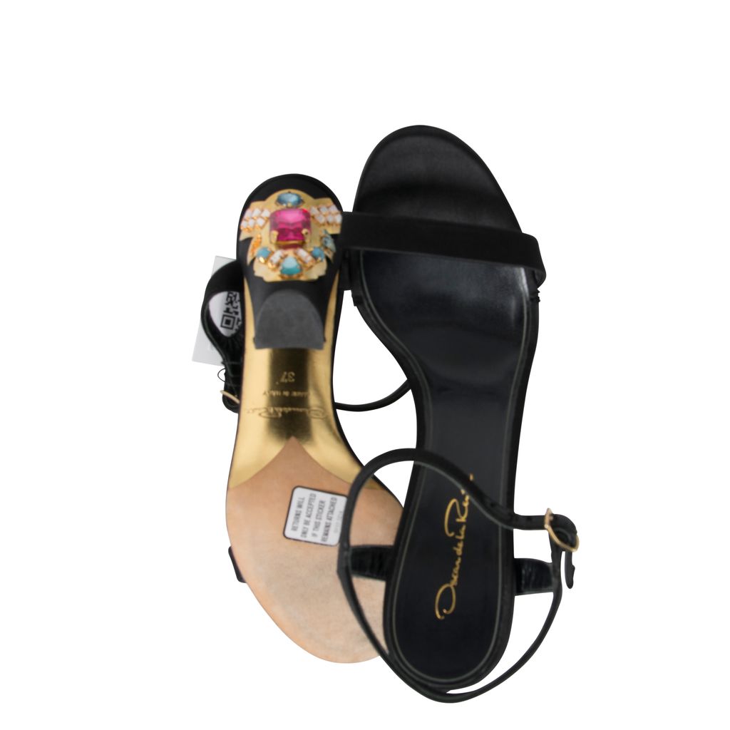 Feel like you're on a never-ending Roman holiday in these stunning heeled sandals from Oscar de la Renta. These heels have a 4 inch block heel, satin fabrication, crystal embellished heels, skinny toe strap, and adjustable ankle closure. Gently worn, all marks and scuffs as pictured.