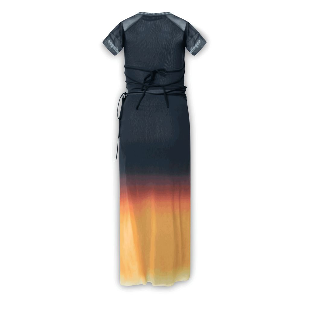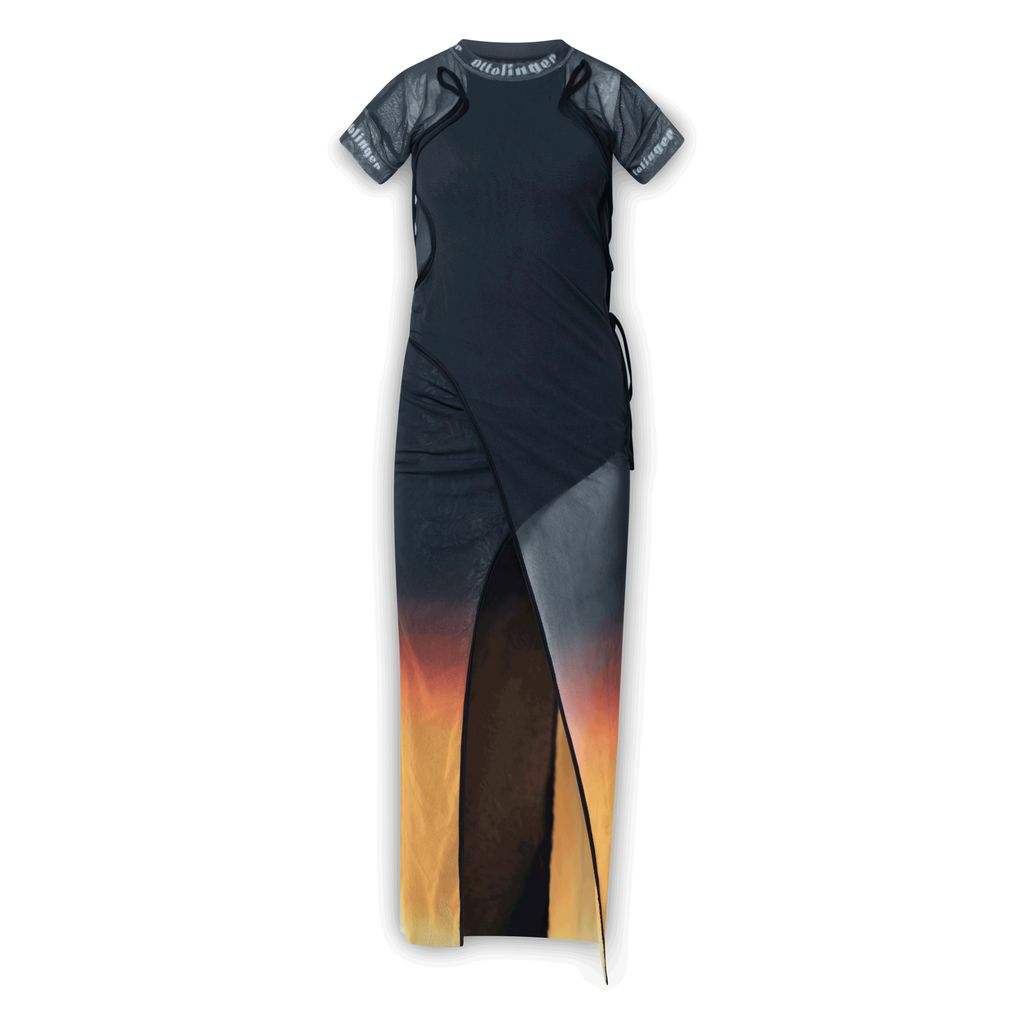 Ottolinger Black and Orange Mesh Dress features wrap construction, drawstrings and raw edges throughout, logo printed in white at crewneck collar and cuffs, and raglan sleeves.