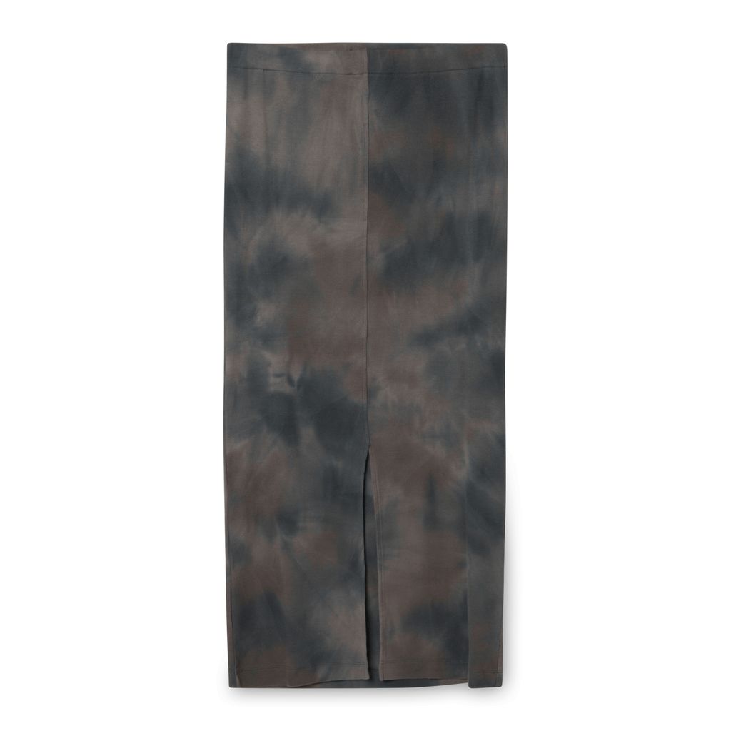 Our Legacy Olive Tie Dye Rib Tube Skirt features slim fit, elastic waistband, and slit in the back.