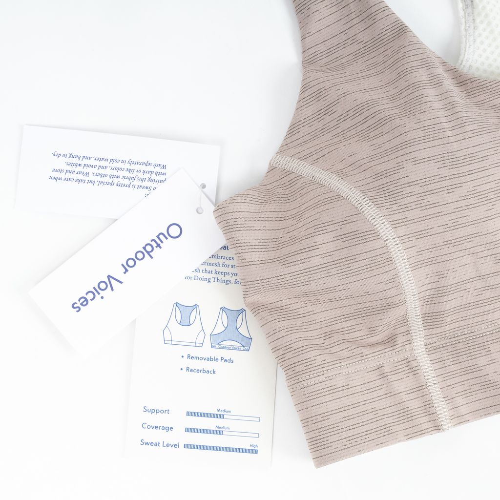 Designed for doing things daily, the Doing Things bra from Outdoor Voices is your new go to for everything from hiking to dog walking. Features scoop shaped neck, Y-shaped back with mesh fabrication, cutout with elastic band in back, and removable padding.