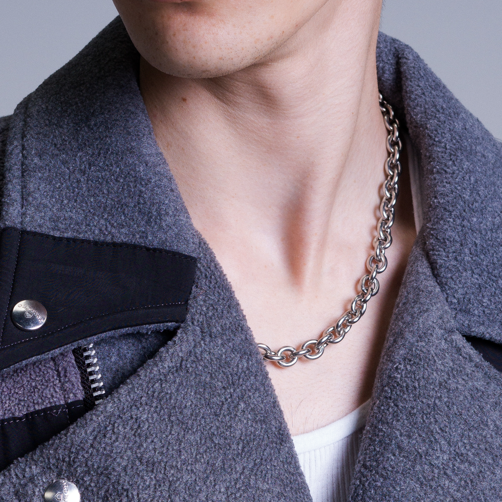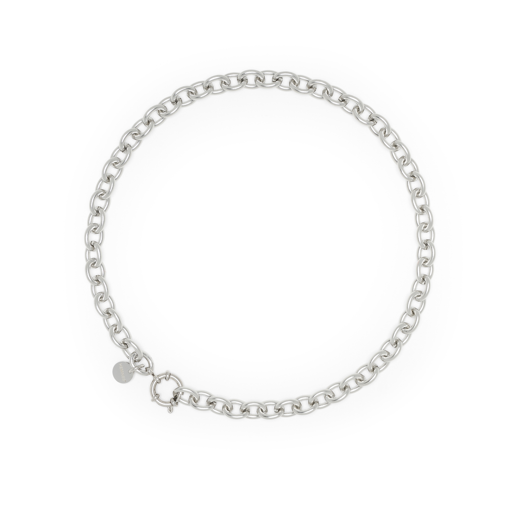 Handcrafted necklace in stainless steel. Spring-ring closure. Logo engraved charm. Made in Los Angeles, CA.
