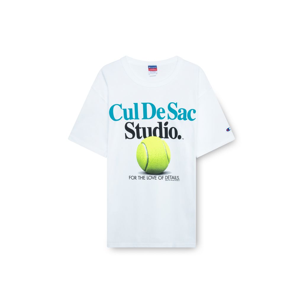 Oversized tennis t-shirt features graphic printed at front, and Champion patch logo at left sleeve.