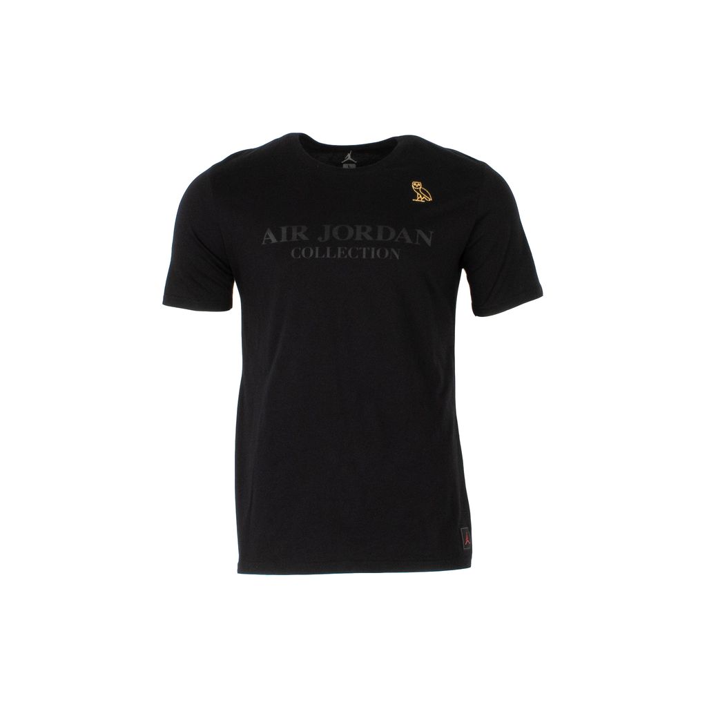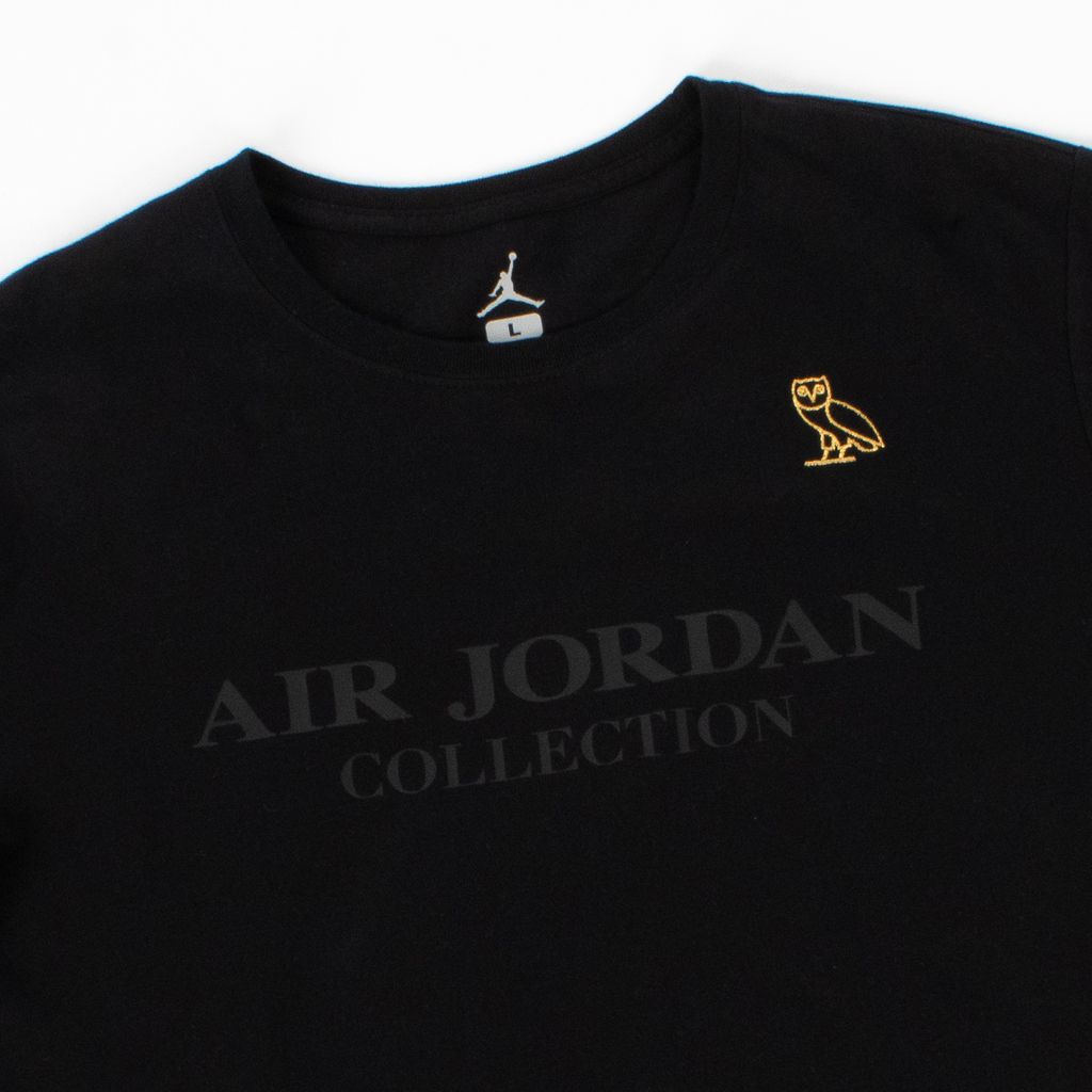 This shirt comes from an exclusive drop between Air Jordan and Drake backed brand OVO. Features shadow "Air Jordan Collection" text on chest, crew shaped neck, and OVO owl embroidered in gold on left side of chest.