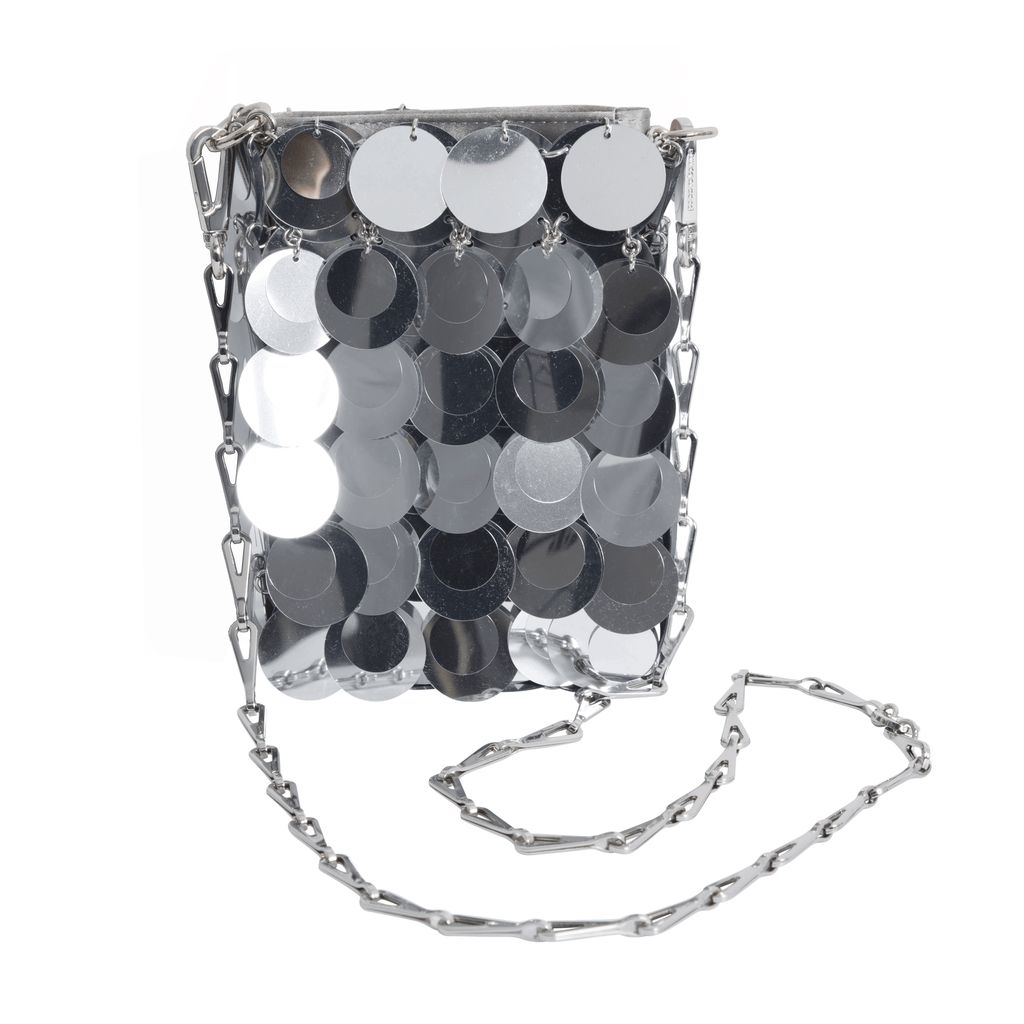 Paco Rabanne 1969 Iconic Sparkle Sequin Crossbody Bag in Silver features magnetic closure and the Paco Rabanne logo.