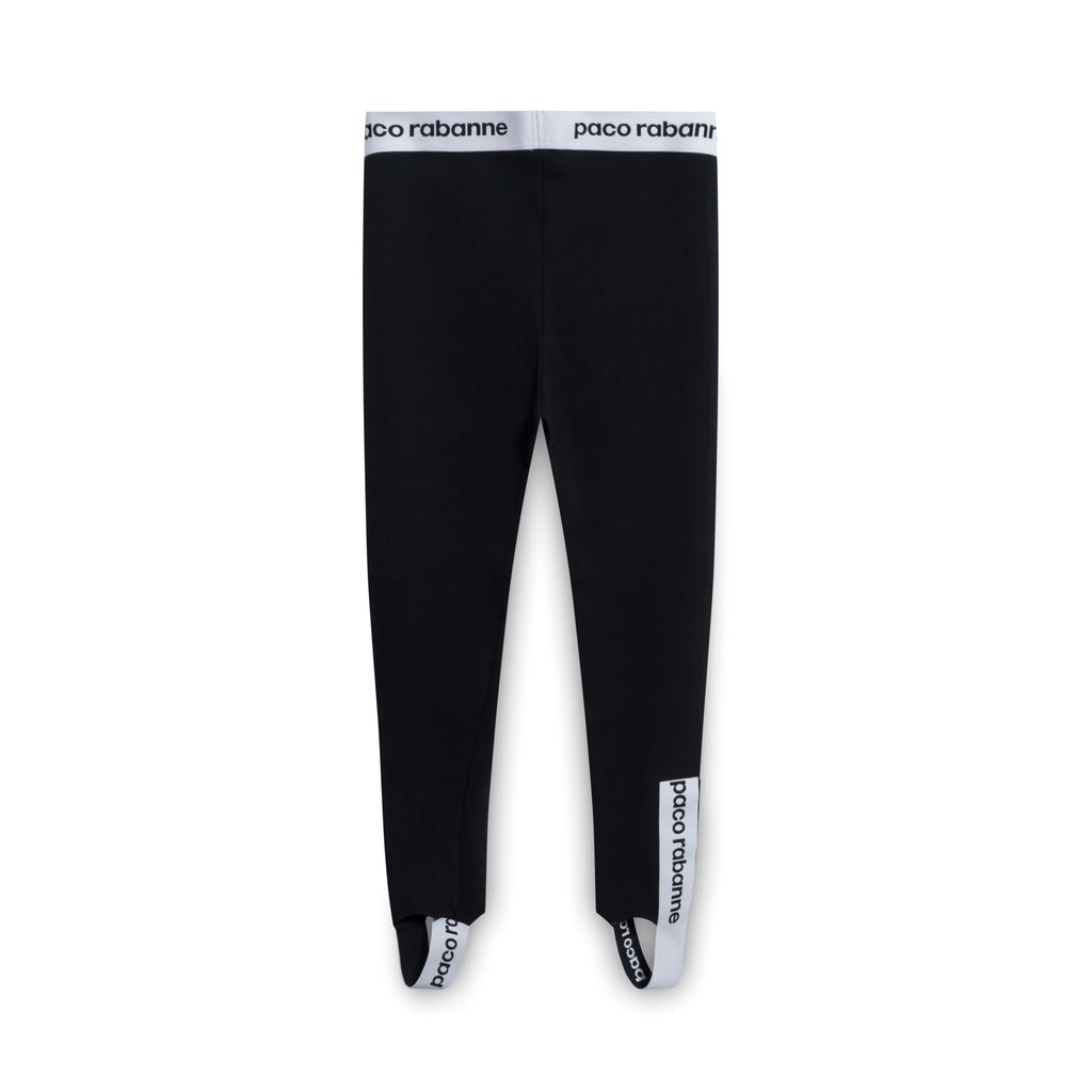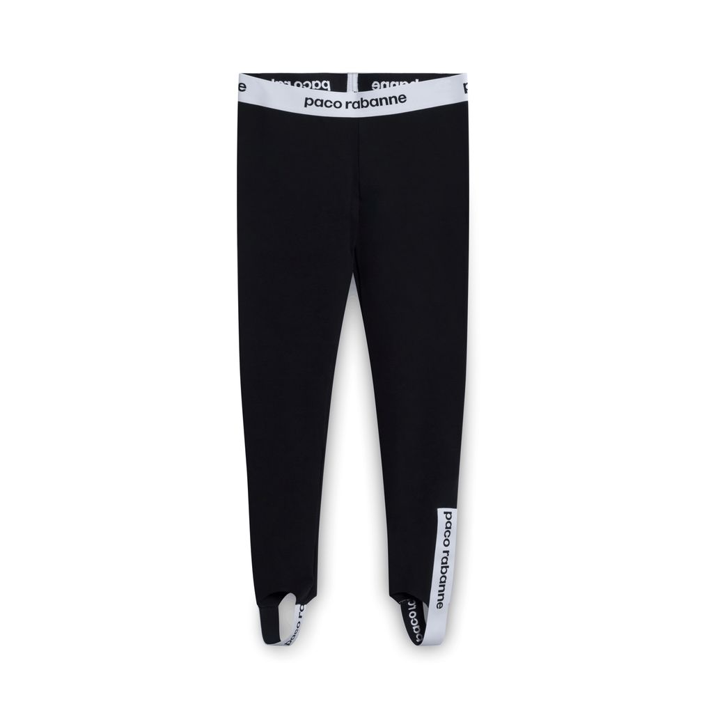 Paco Rabanne Contrast Logo-Stripe Stirrup Leggings - Black feature white band with embroidered Paco Rabanne brand logo on the waist and stirrups.
