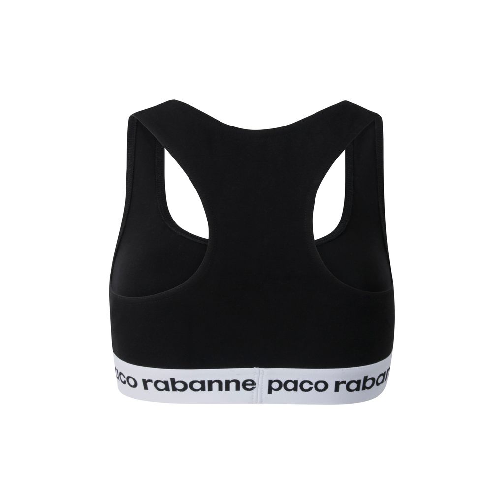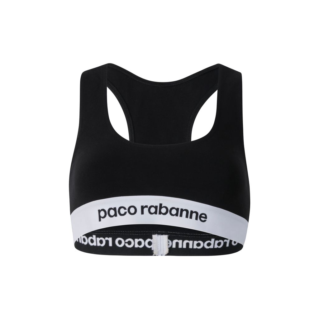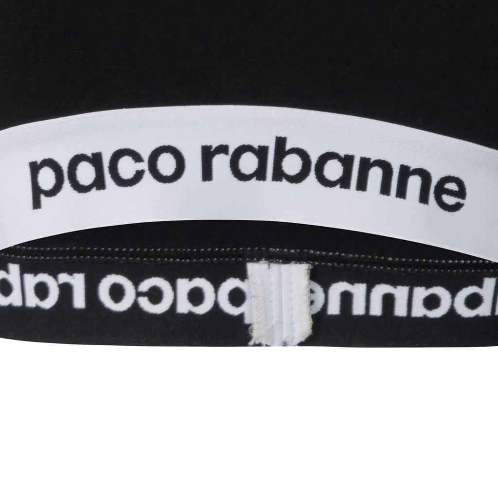 This sports bra from Paco Rabanne's Bodyline collection features black stretch tech jersey fabric, wide racerback straps, and elastic stretch white logo trim detail at the hem. In excellent condition, no signs of wear.