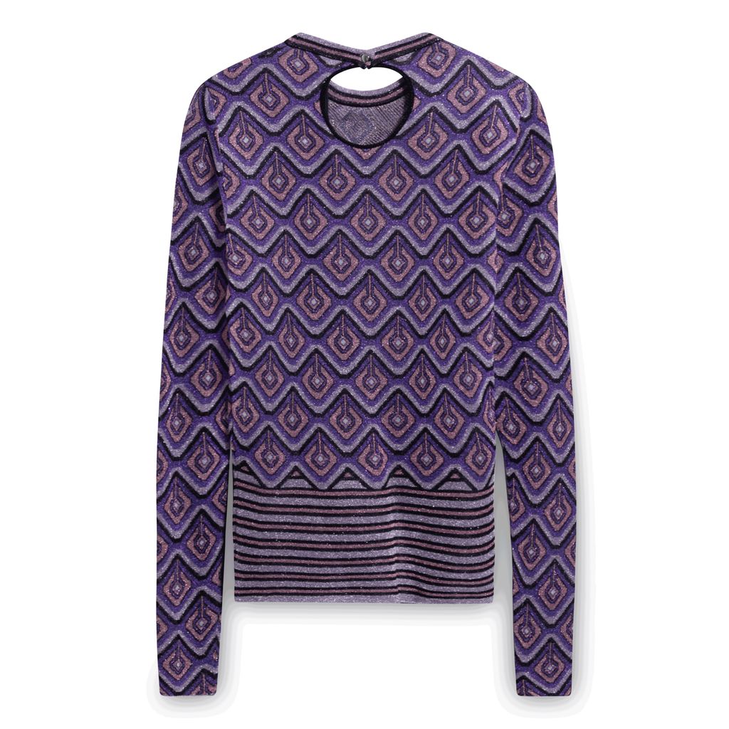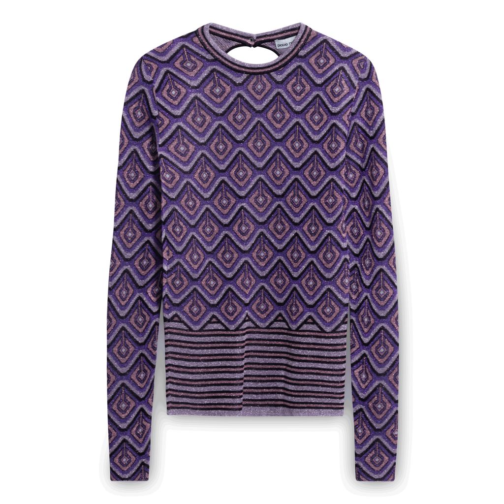 This long sleeve knit cupro and Lurex-blend purple top from Paco Rabanne features graphic pattern and stripes throughout. Accented with crewneck collar, press-stud fastening at open back, and silver-tone hardware. New with tags.