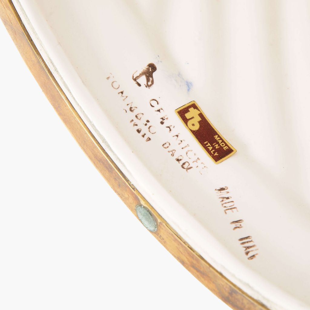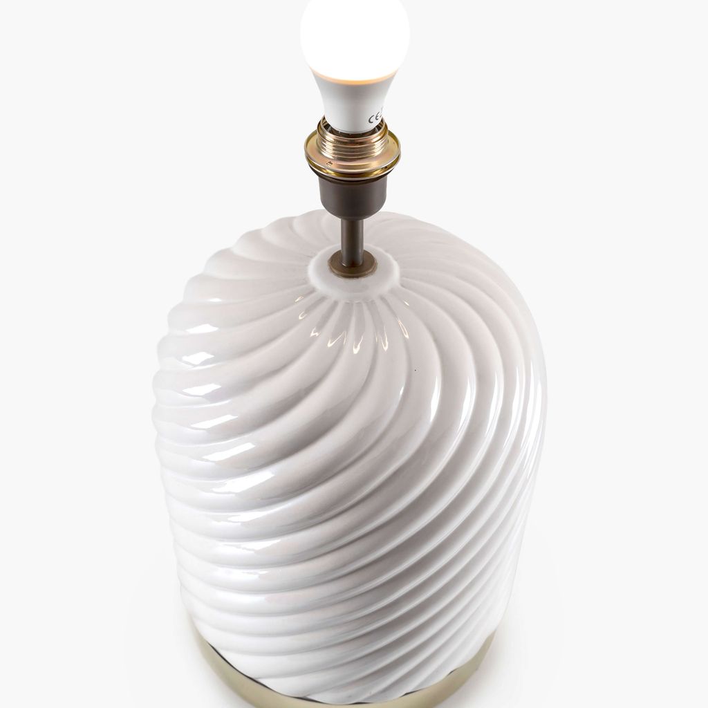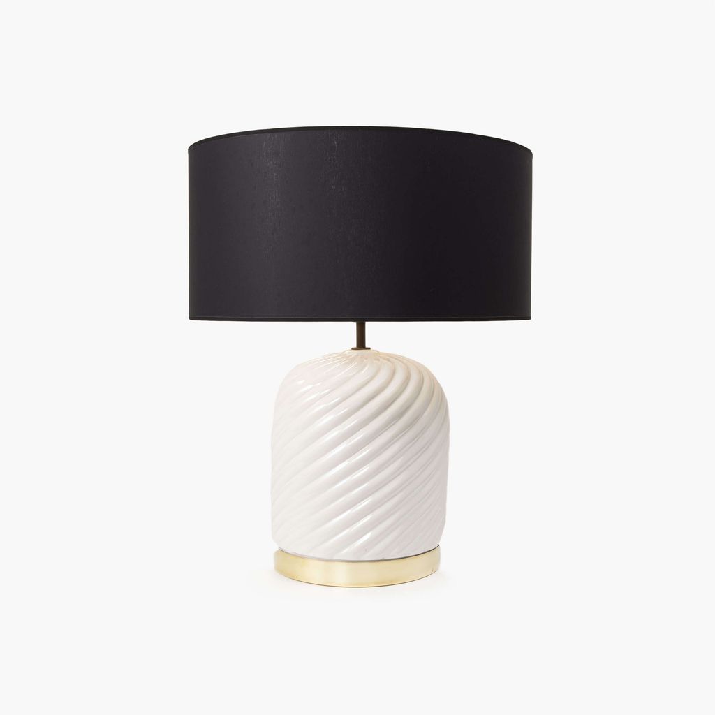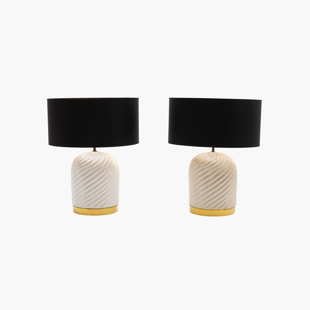 This elegant pair of table lamps by Italian designer Tommaso Barbi features an ivory-colored ceramic base with horizontal spiral shaping grounded by a brass ring. The almost sculptural form of Barbi's table lamp is an excellent piece to elevate and personalize one's space. There is a slight variance in the natural tone of the ivory glaze on each lamp.