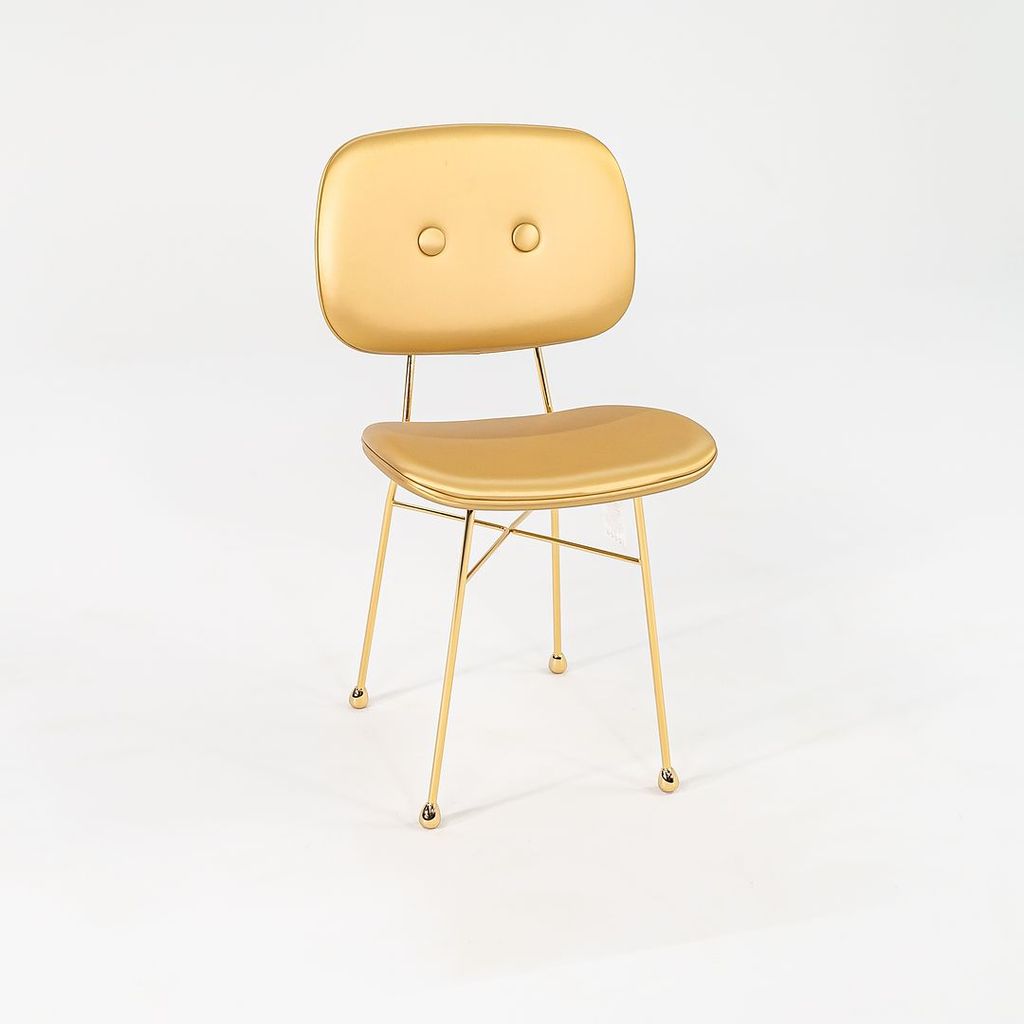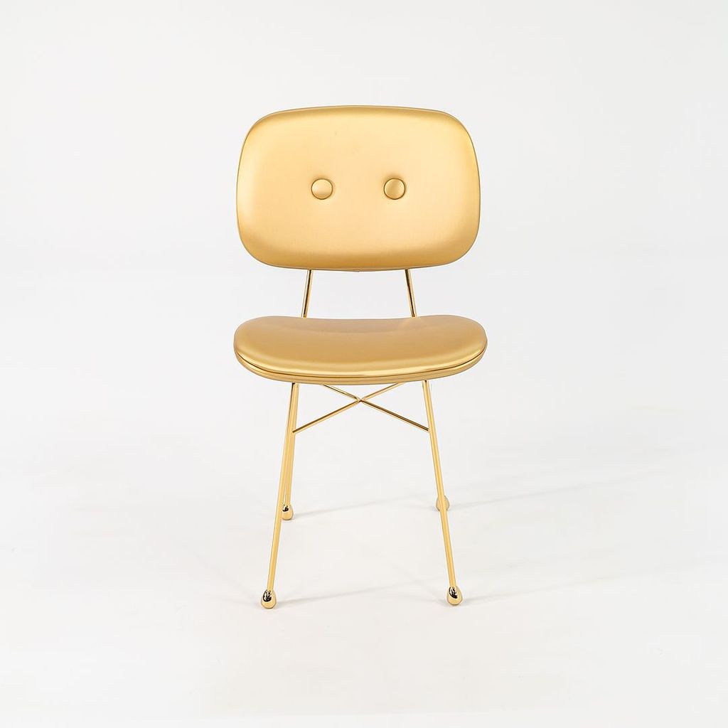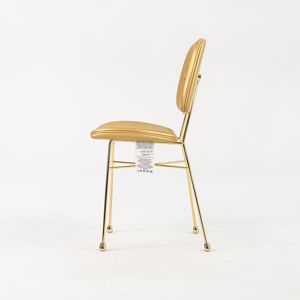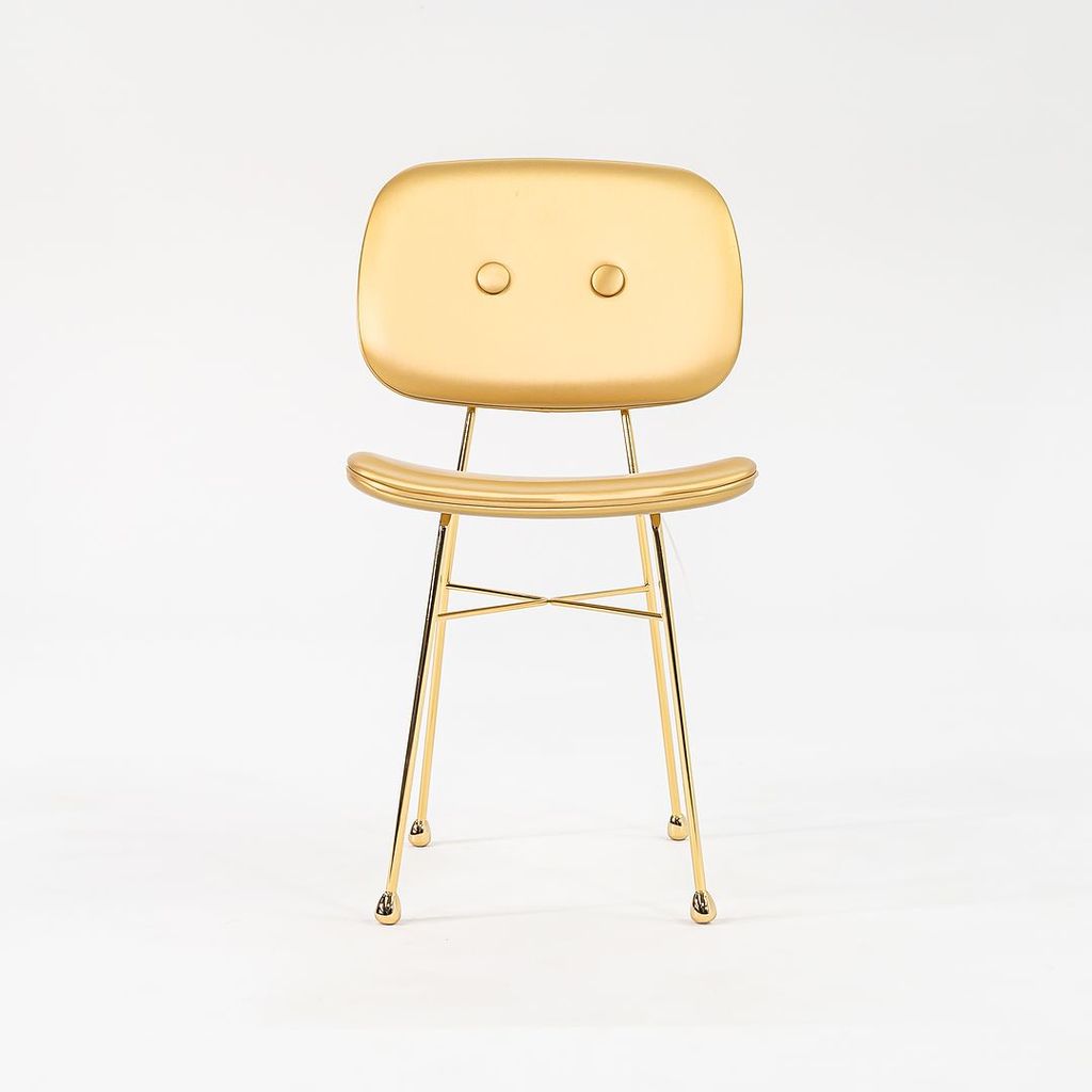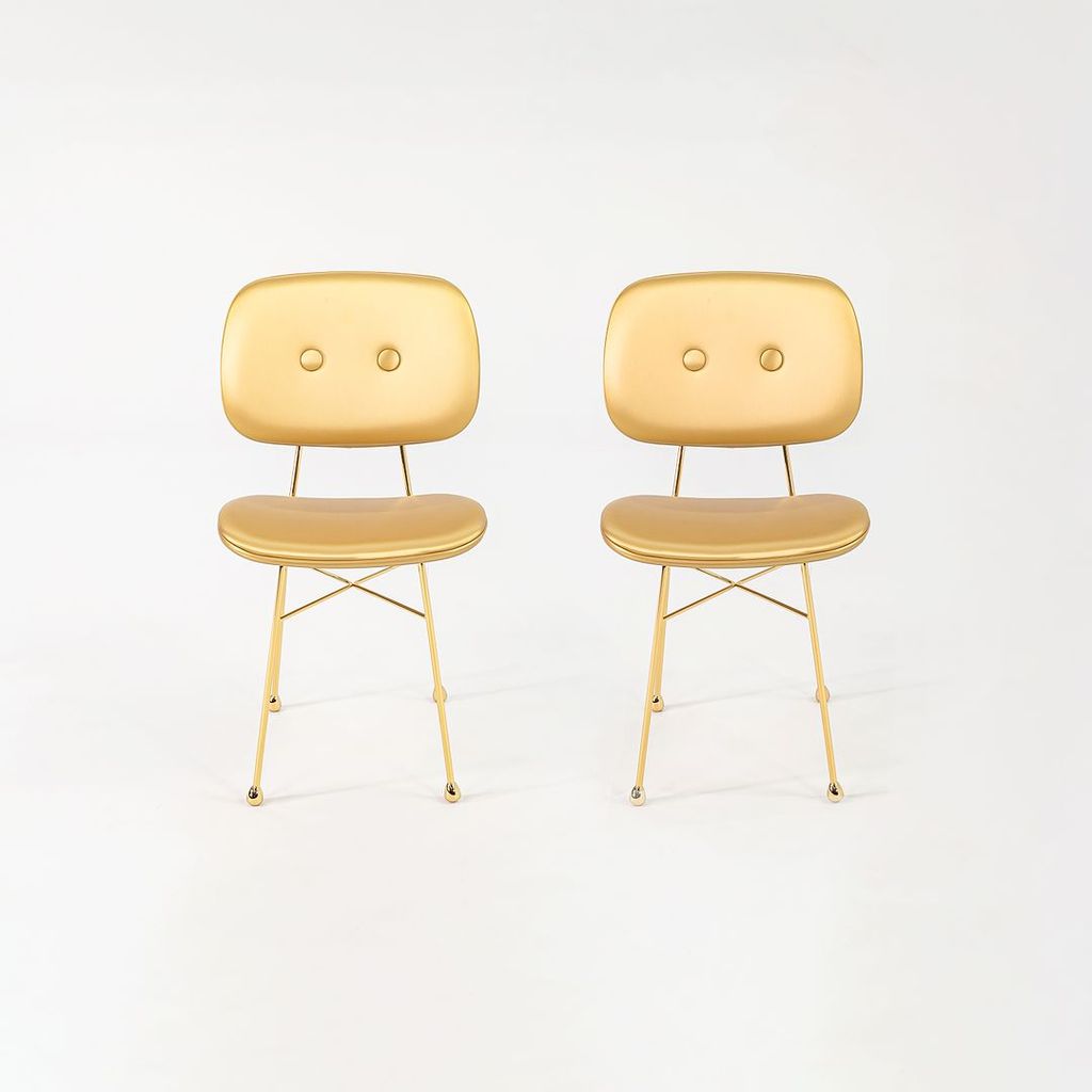 Listed for sale is a pair of Golden Dining Chairs made with a gold tone steel frame and matt gold leather. The chair was designed by Nika Zupanc and produced by Moooi in the Netherlands. The chairs date to circa 2022 and are guaranteed as authentic. Condition is very good to excellent. One chair has some tape residue. See photos.