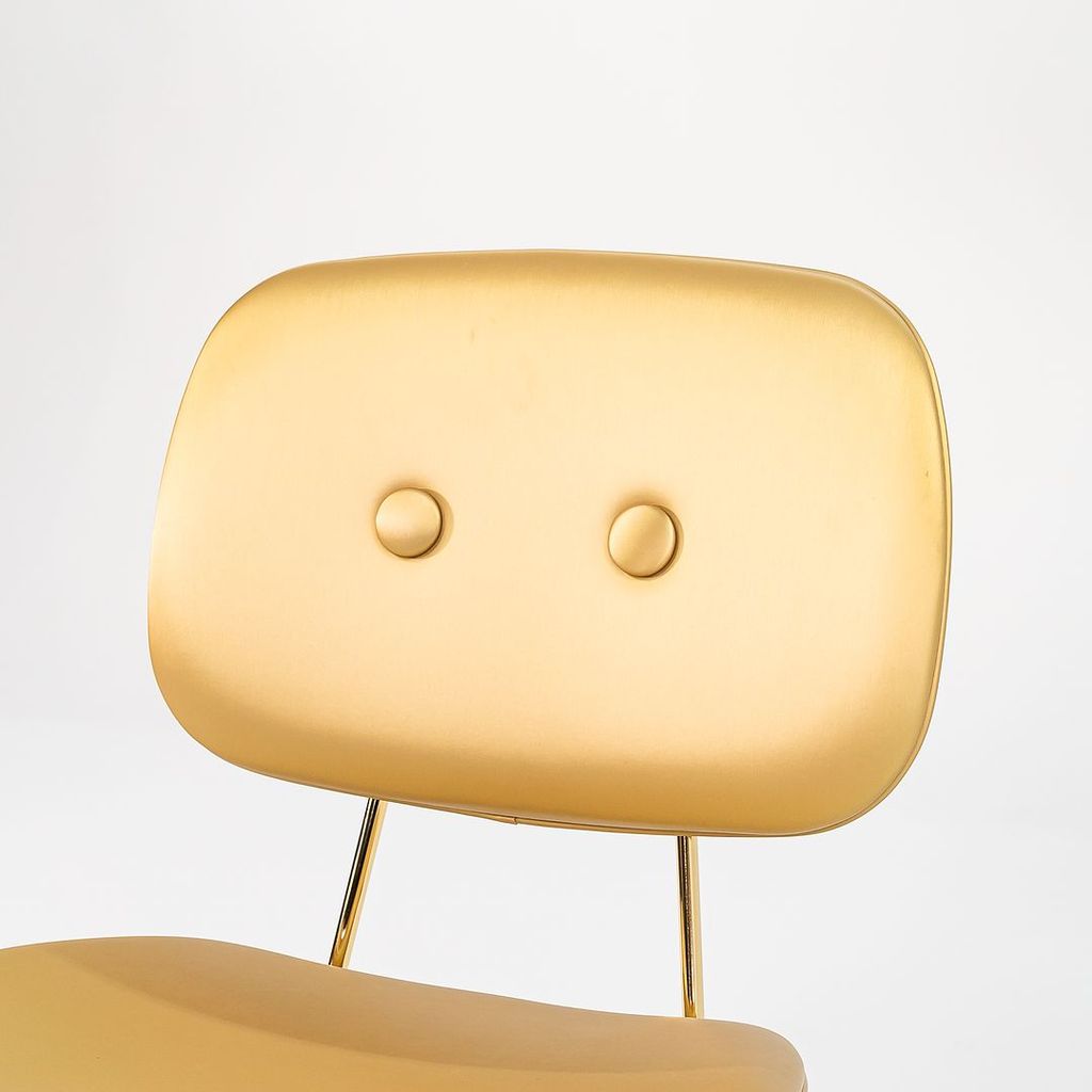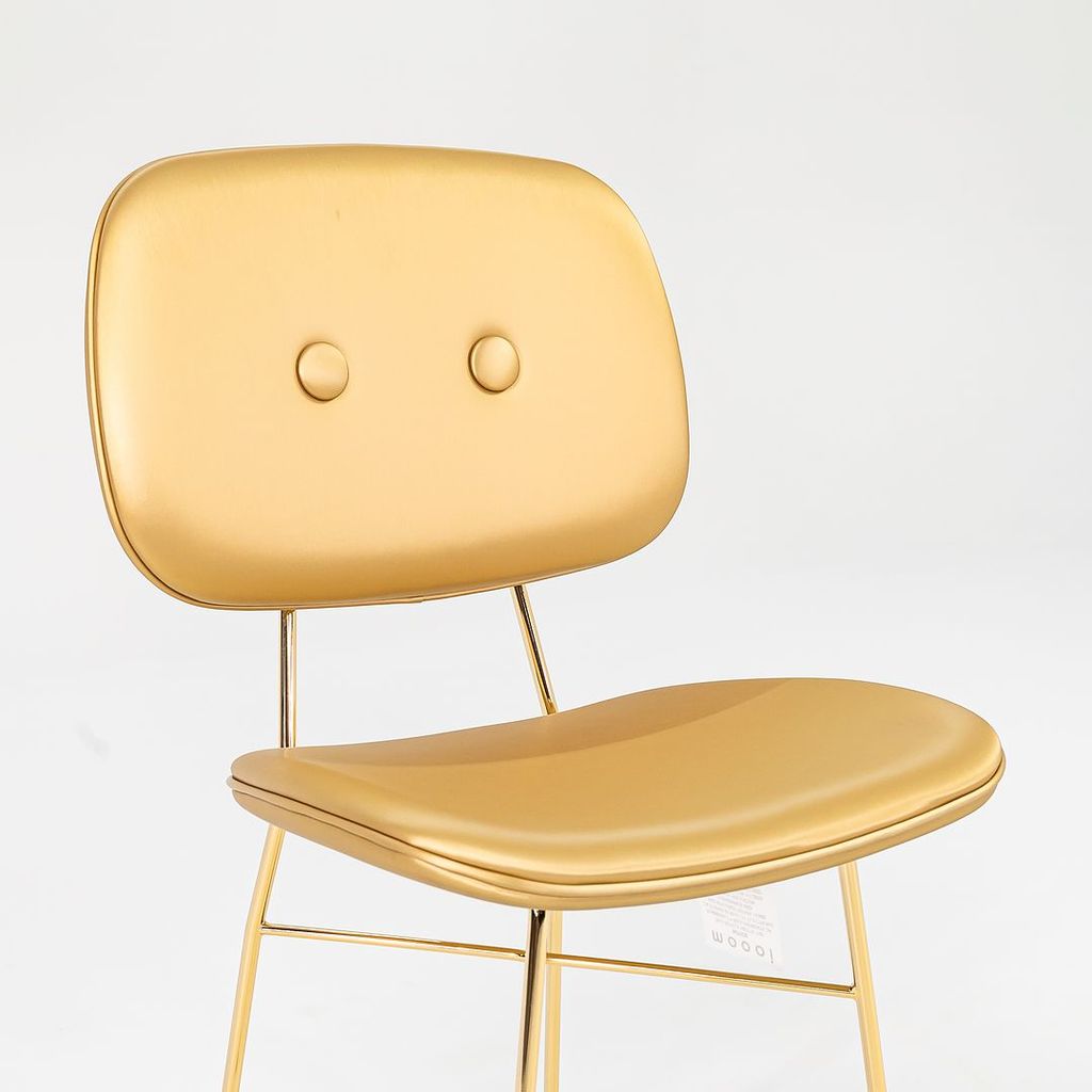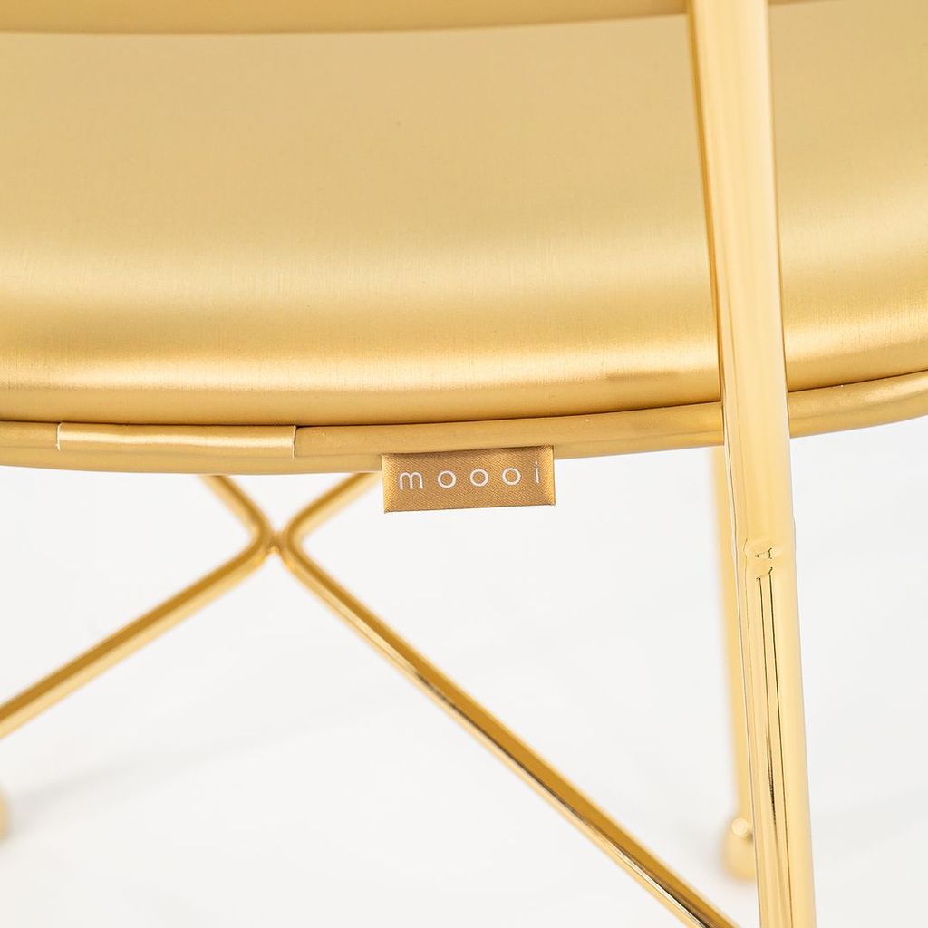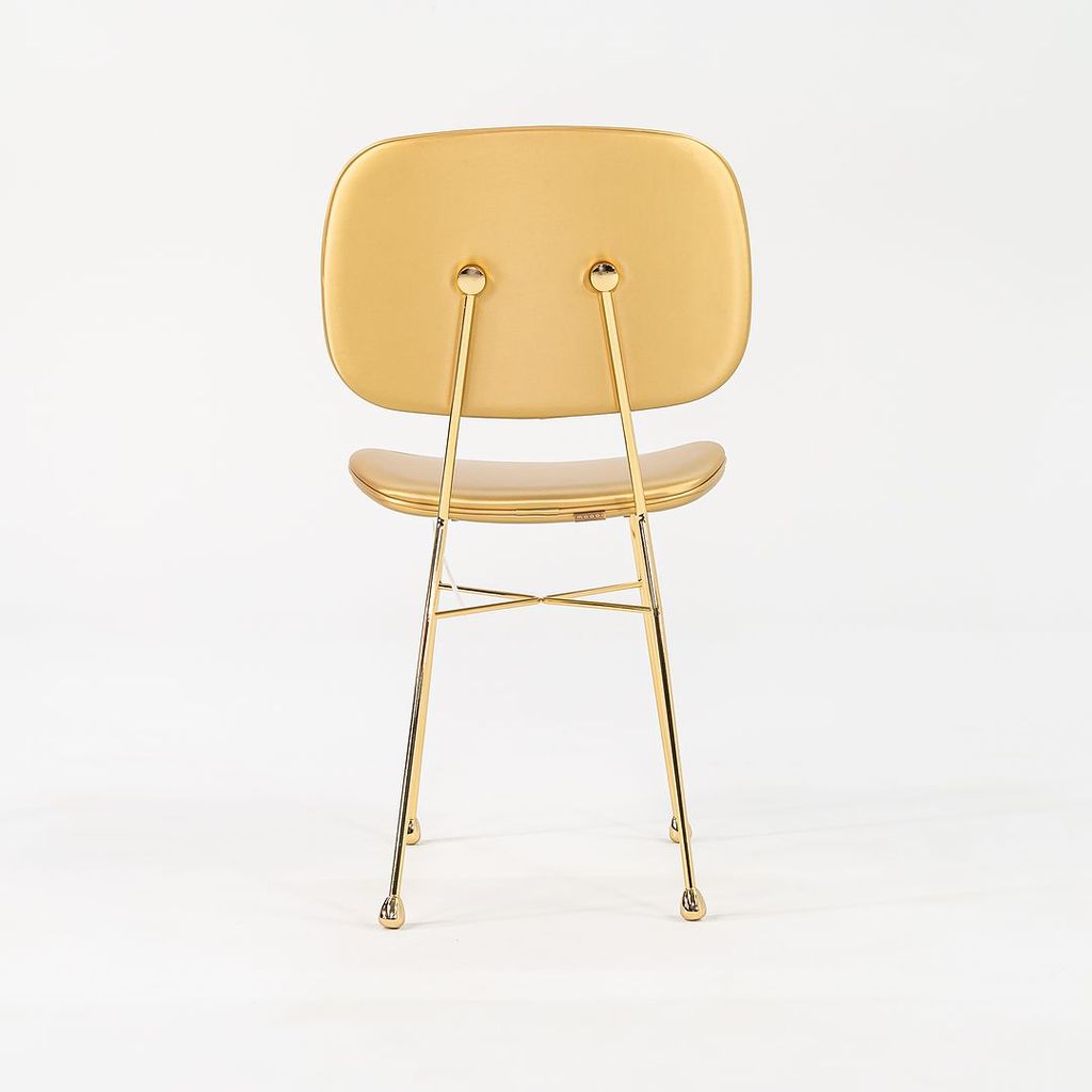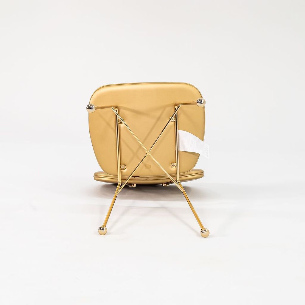Listed for sale is a pair of Golden Dining Chairs made with a gold tone steel frame and matt gold leather. The chair was designed by Nika Zupanc and produced by Moooi in the Netherlands. The chairs date to circa 2022 and are guaranteed as authentic. Condition is very good to excellent. One chair has some tape residue. See photos.