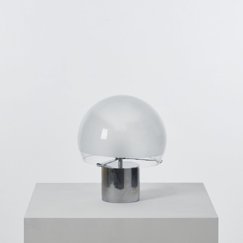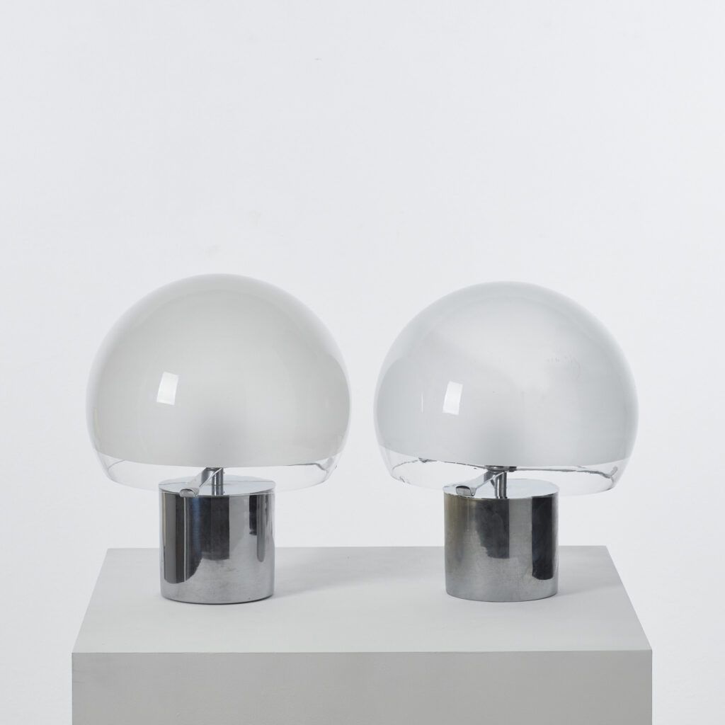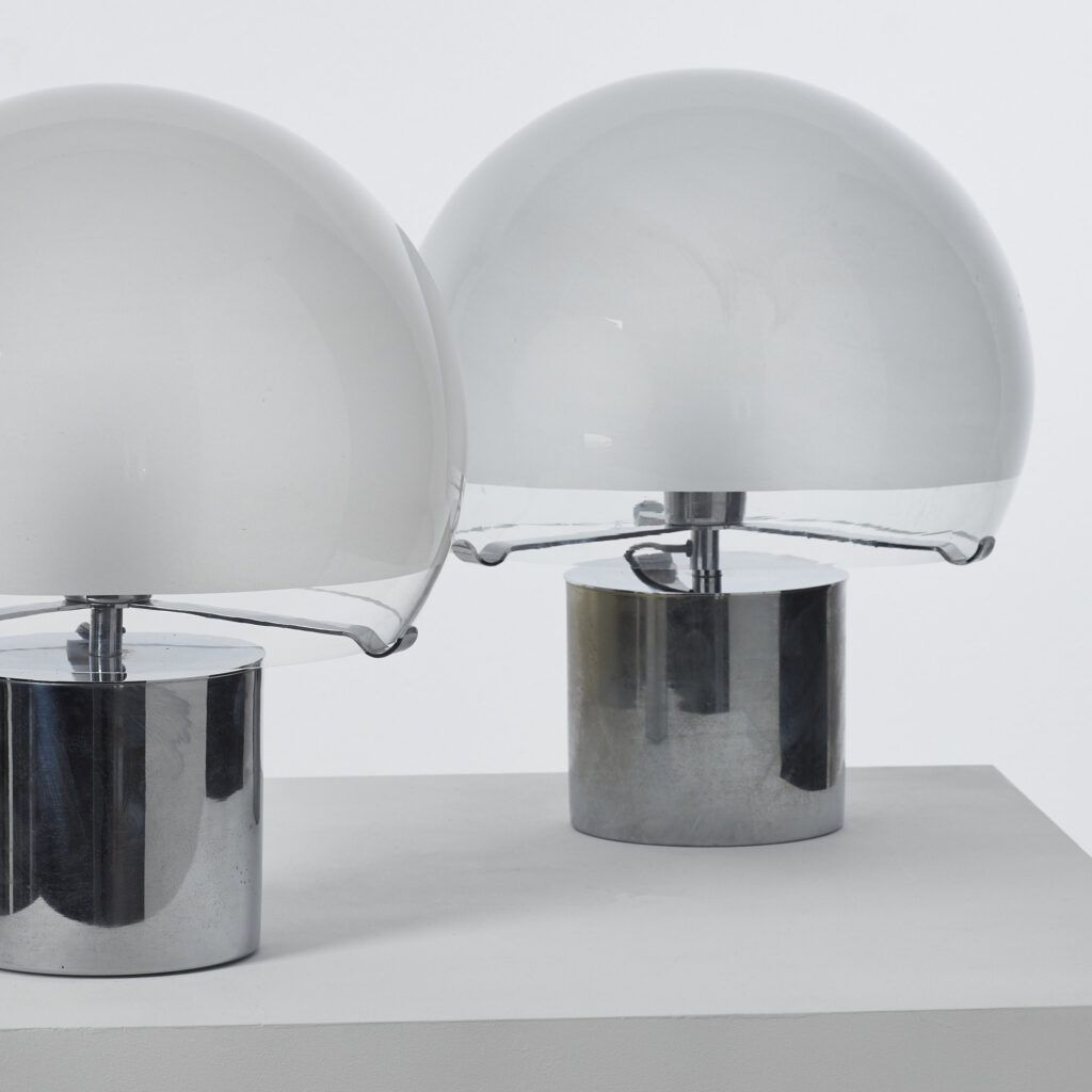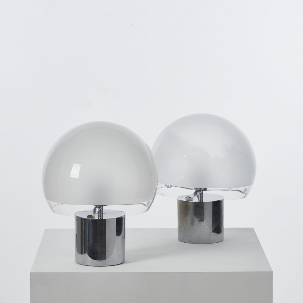 A pair of satinised glass and nickel-plated table lamps by Luigi Caccia Dominioni. The compact silhouette sits somewhere between globe and mushroom in spirit, though the designer clearly had the latter in mind given the ‘Porcino’ moniker. A transparent band at the base of each shade gives the illusion of suspension.