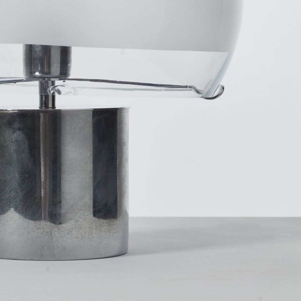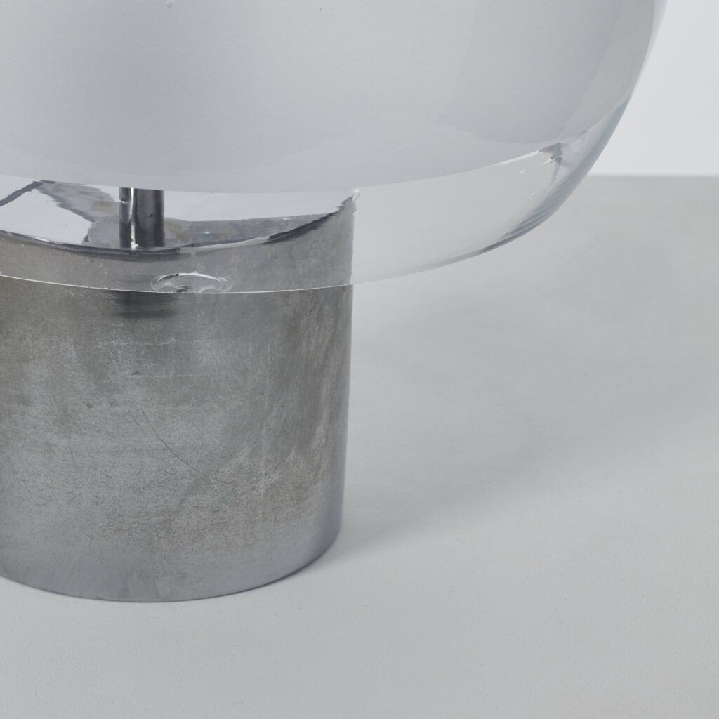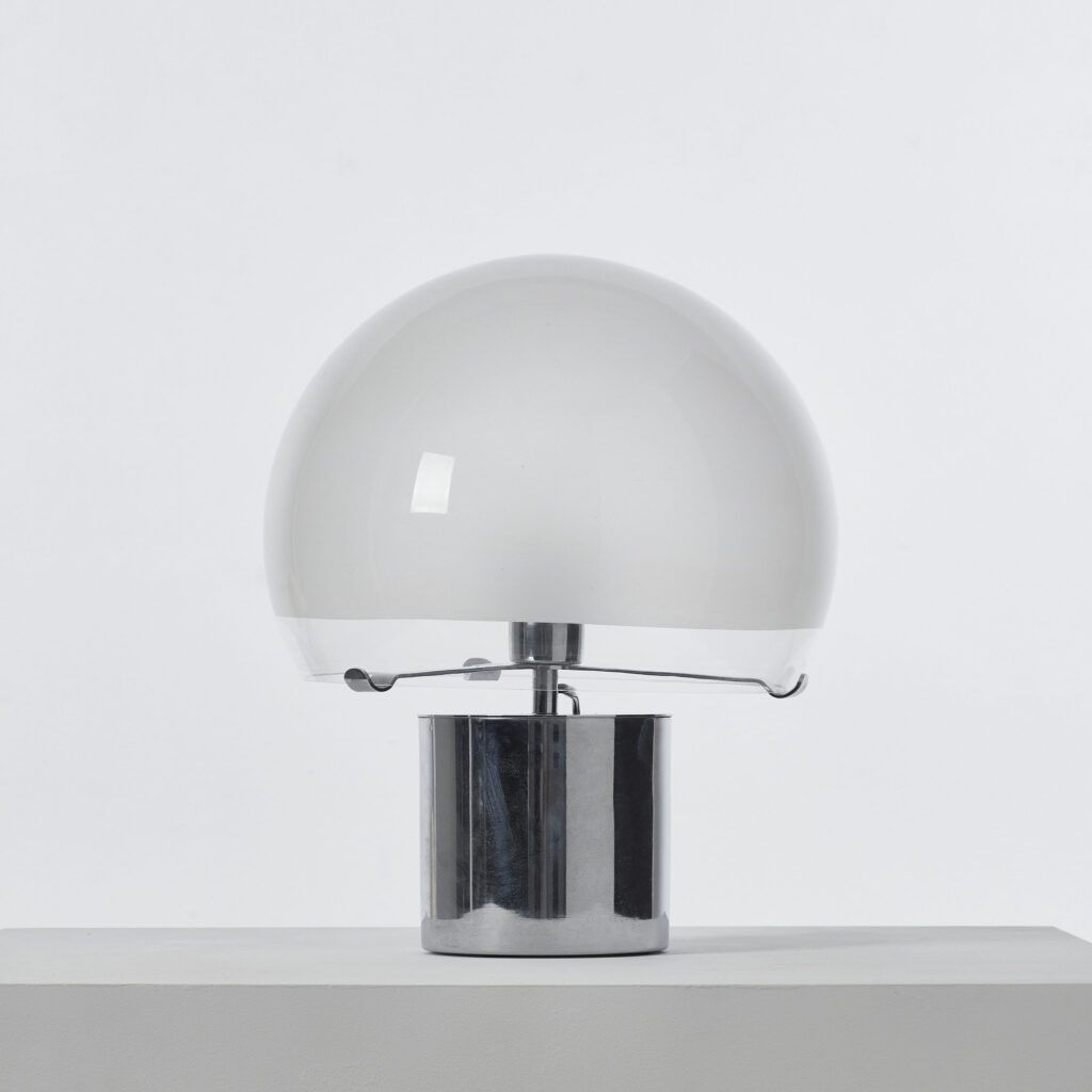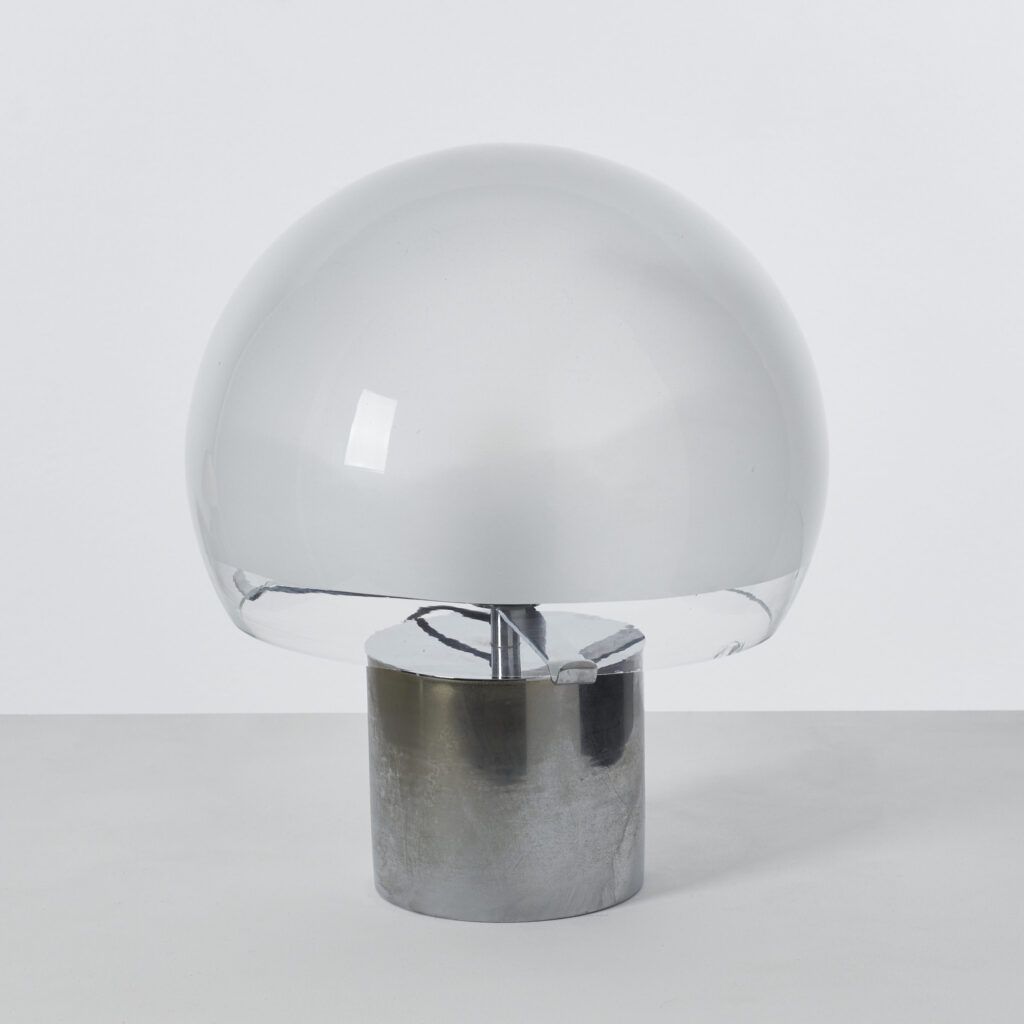A pair of satinised glass and nickel-plated table lamps by Luigi Caccia Dominioni. The compact silhouette sits somewhere between globe and mushroom in spirit, though the designer clearly had the latter in mind given the ‘Porcino’ moniker. A transparent band at the base of each shade gives the illusion of suspension.