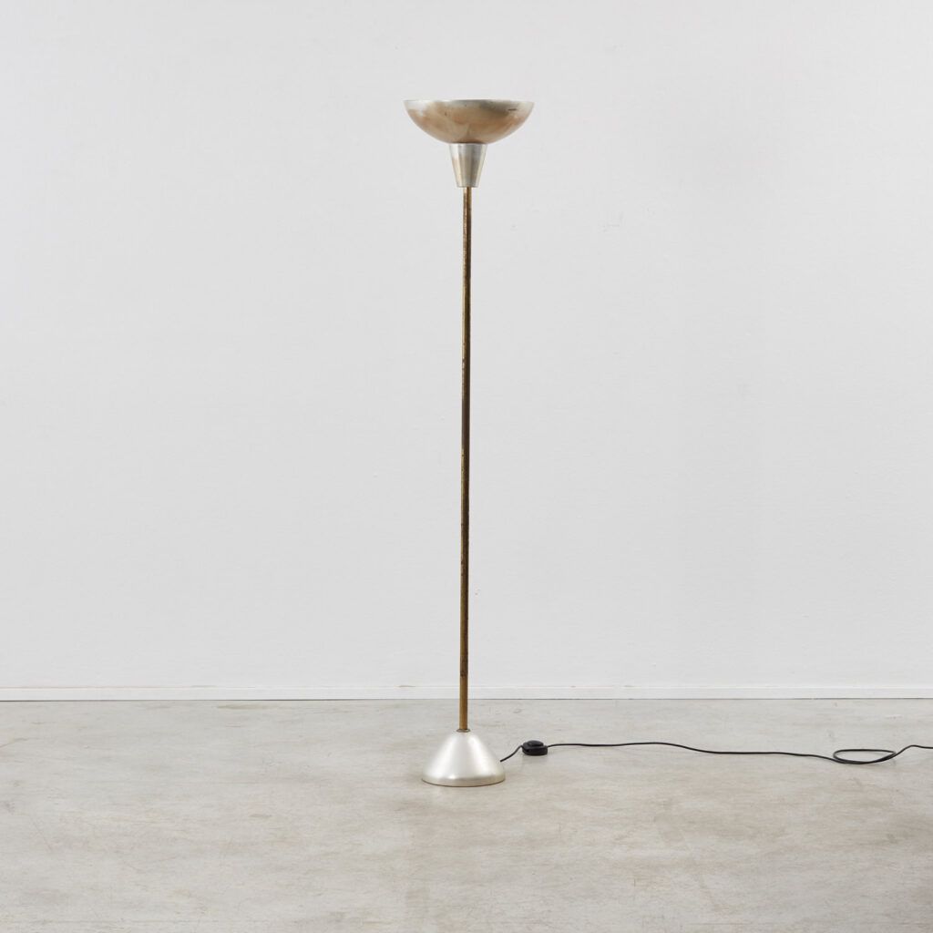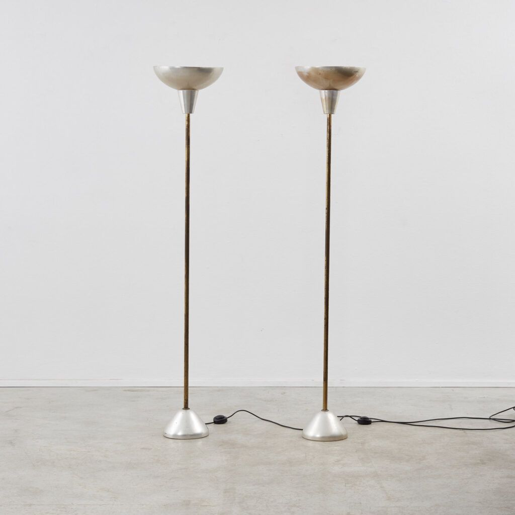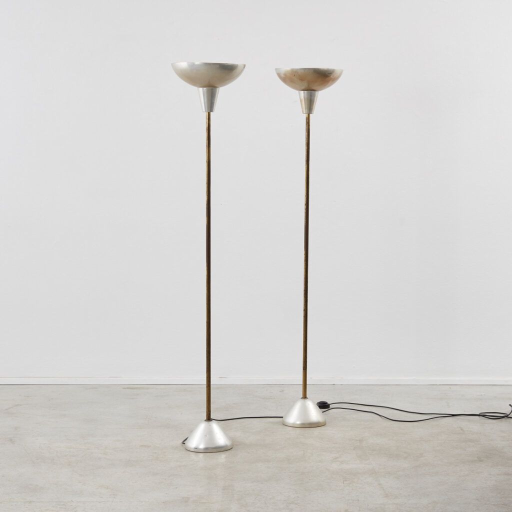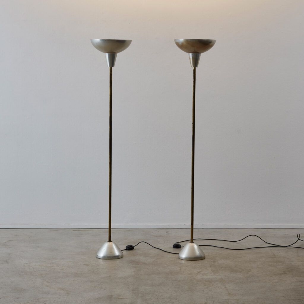 A pair of beautifully restrained LTE1 floor lamps by Luigi Caccia Dominioni. A rounded aluminium base acts as visual counterpoint to the nickel-plated brass uplighter. This early design would herald the conical Imbuto lamp of the following decade.