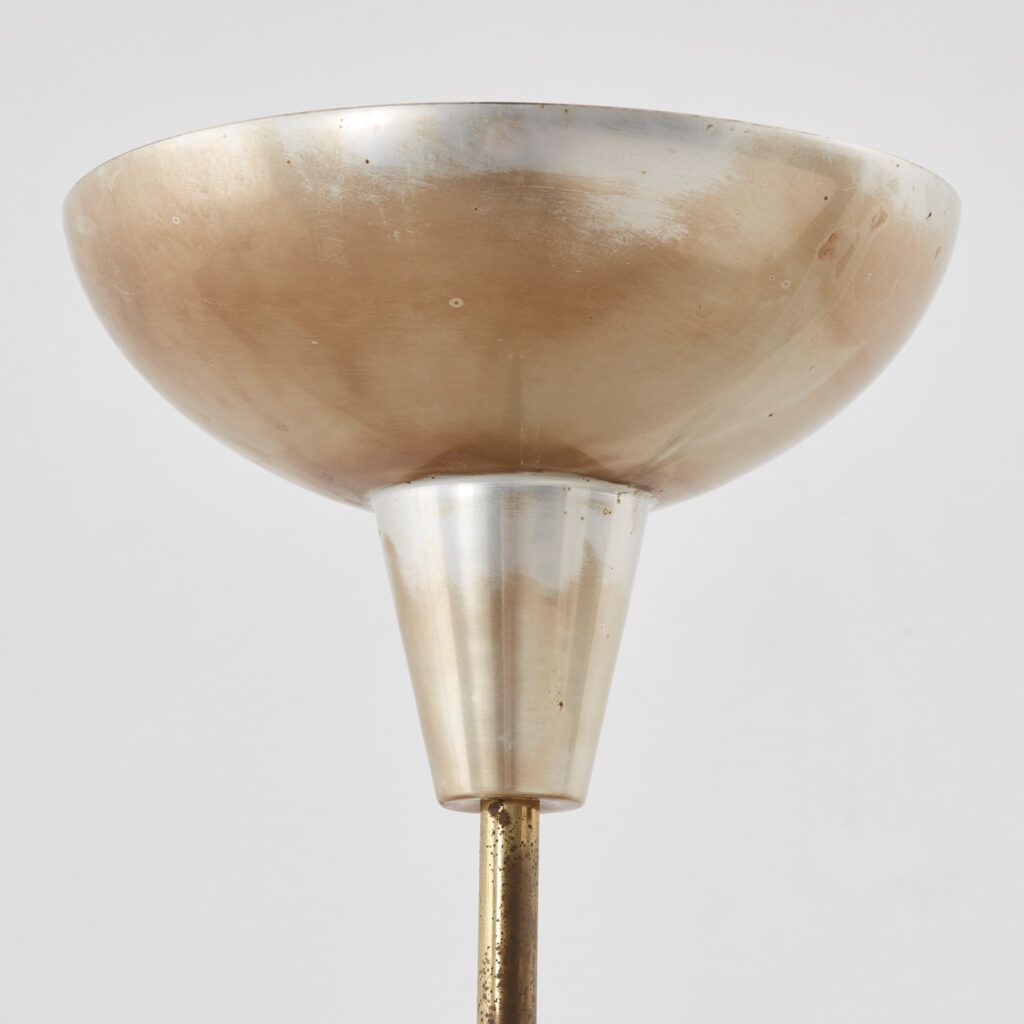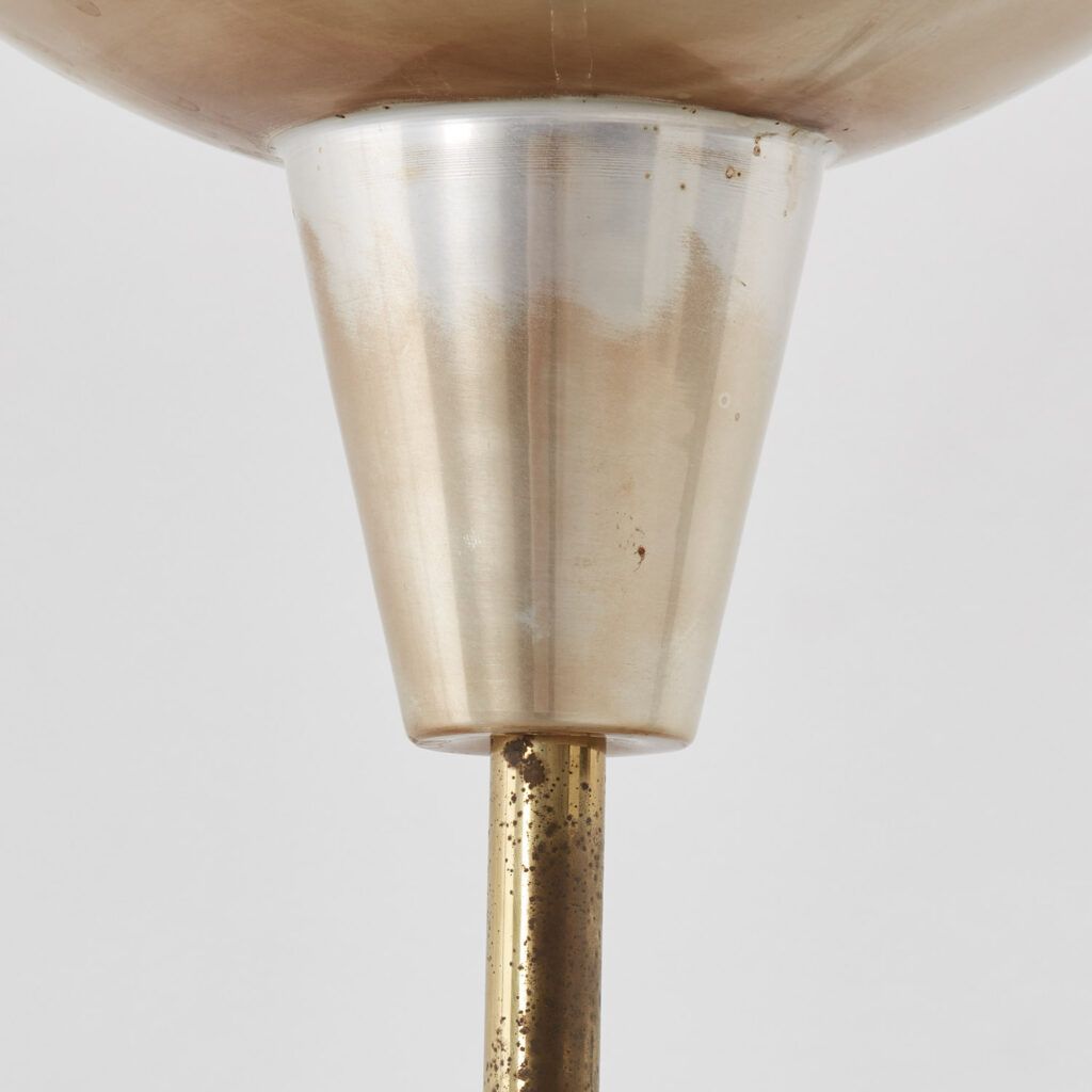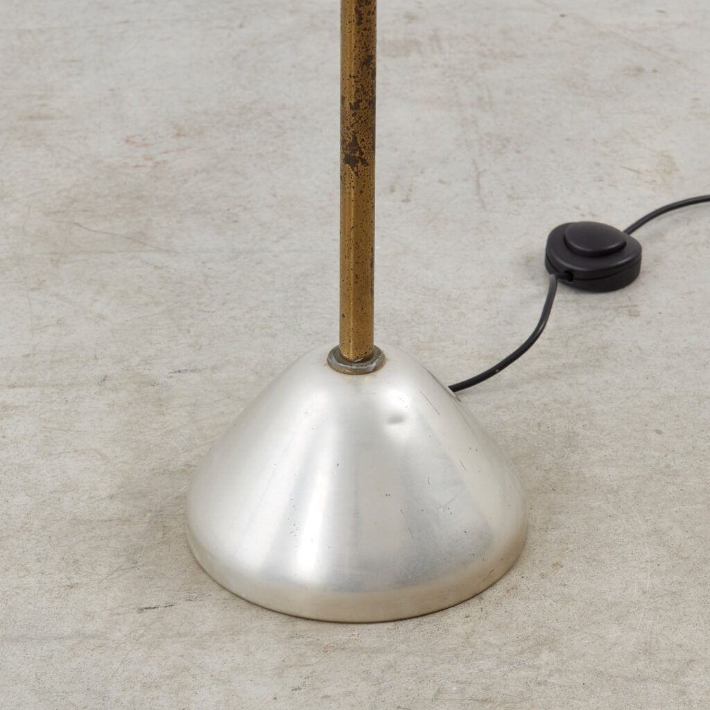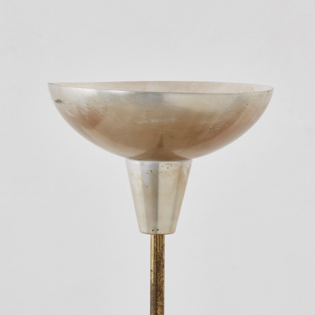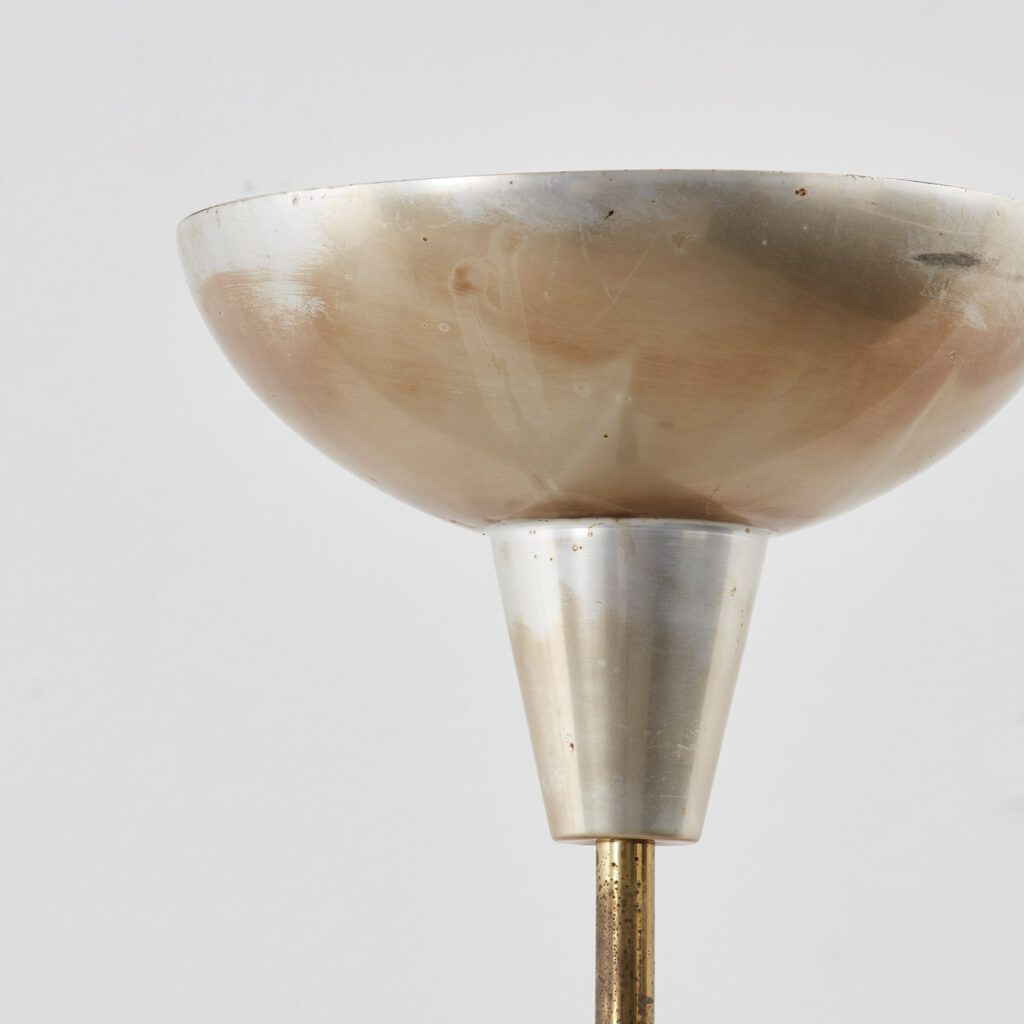 A pair of beautifully restrained LTE1 floor lamps by Luigi Caccia Dominioni. A rounded aluminium base acts as visual counterpoint to the nickel-plated brass uplighter. This early design would herald the conical Imbuto lamp of the following decade.