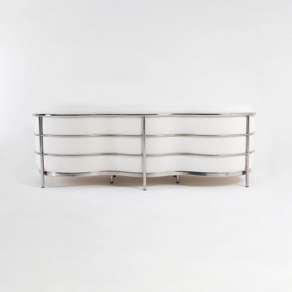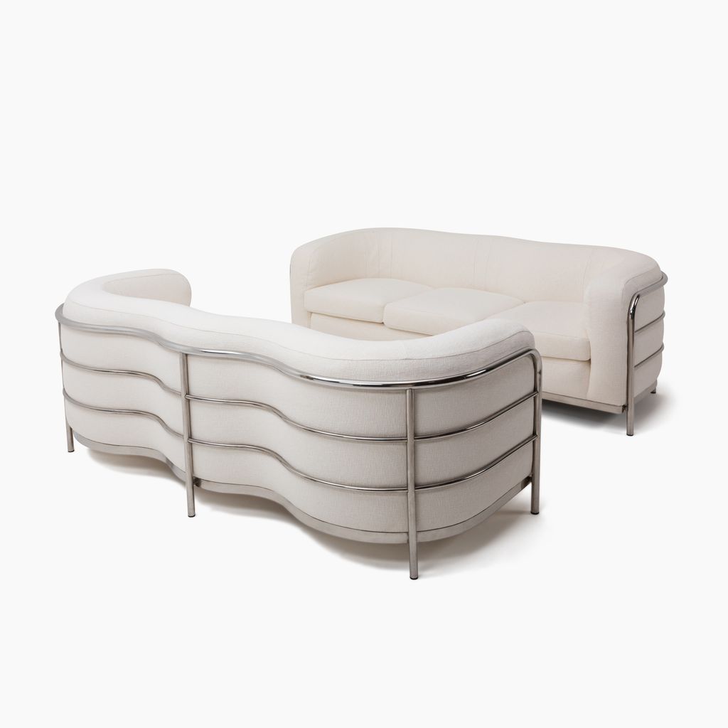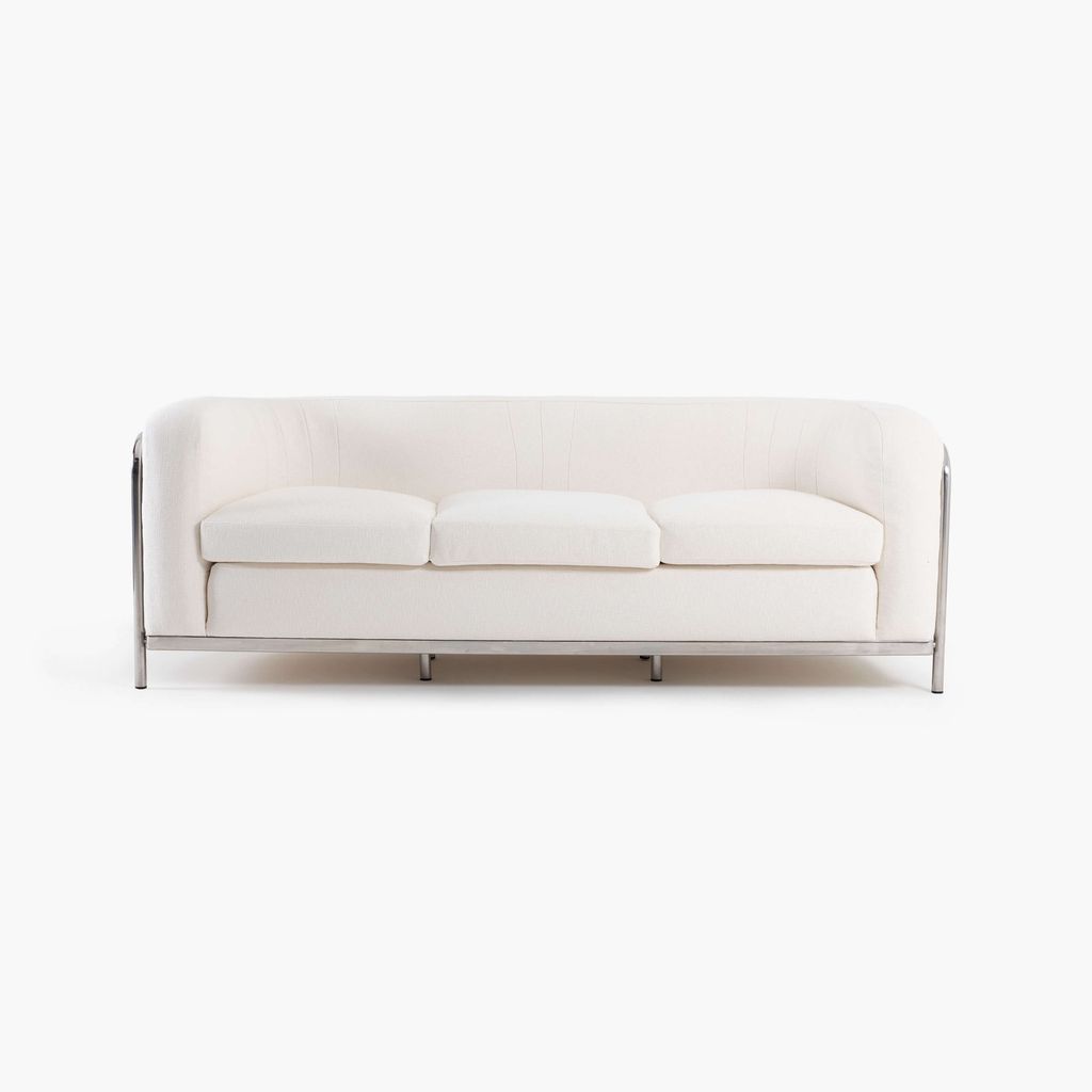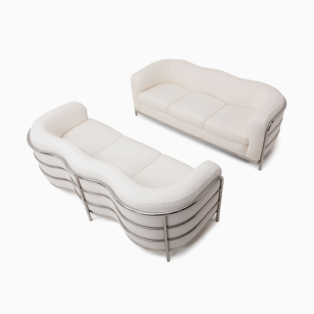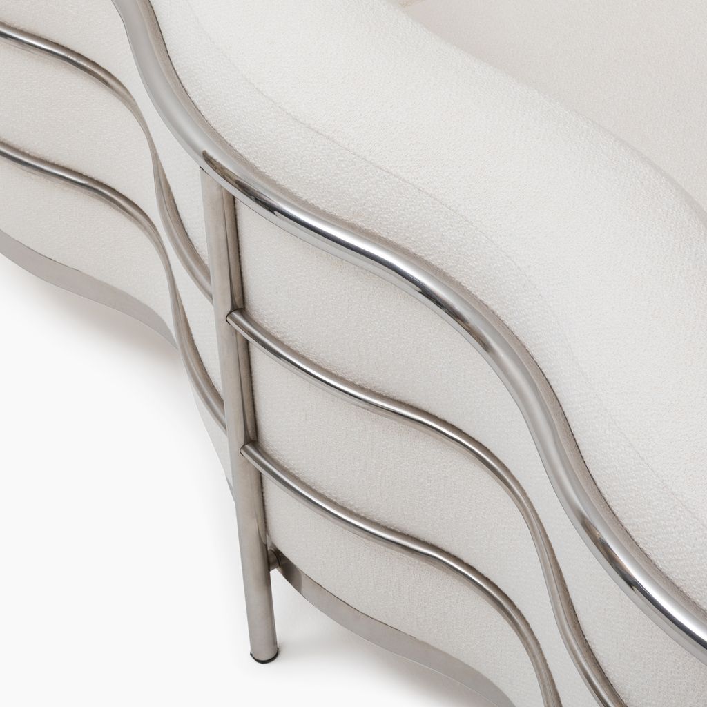 The Onda Three-Seat sofa - onda meaning "wave" in Italian - earns its namesake from the tubular stainless steel frame that forms its support structure, curving in and out along the back of the seat. The monobloc sofa delivers comfort and coziness with white bouclé upholstery and firm cushioning. This sofa comes in a pair.