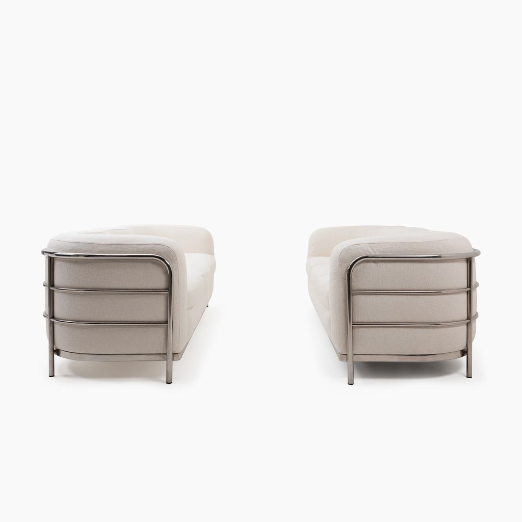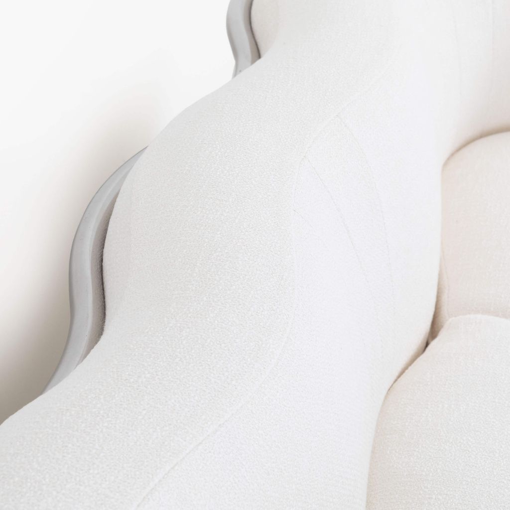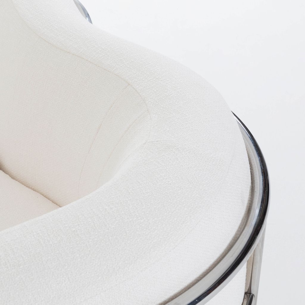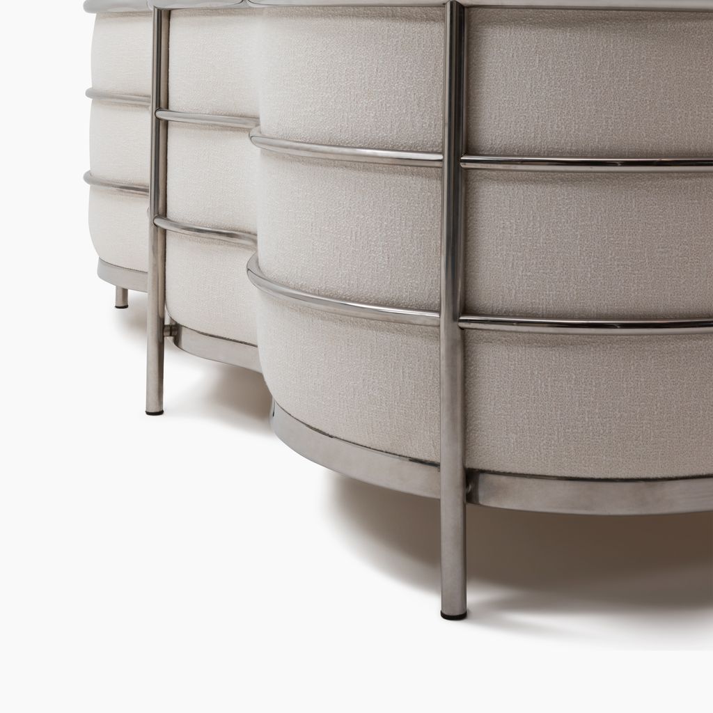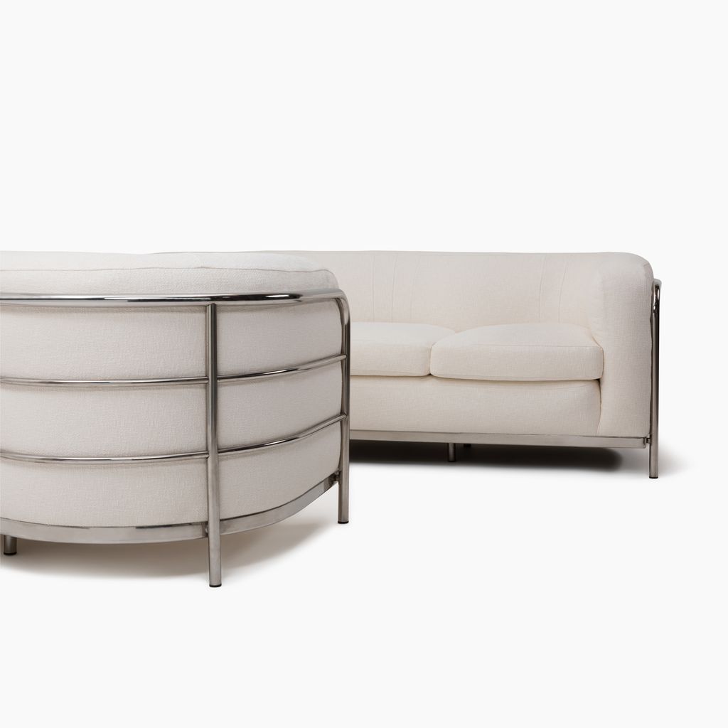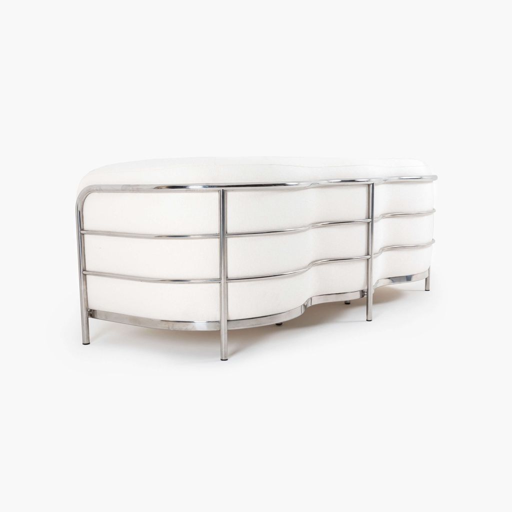The Onda Three-Seat sofa - onda meaning "wave" in Italian - earns its namesake from the tubular stainless steel frame that forms its support structure, curving in and out along the back of the seat. The monobloc sofa delivers comfort and coziness with white bouclé upholstery and firm cushioning. This sofa comes in a pair.