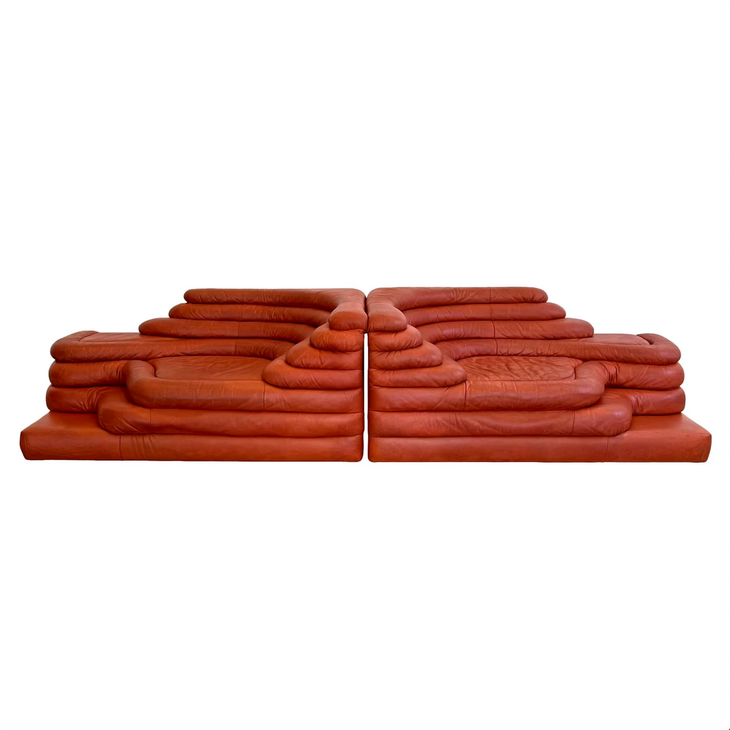Pair of original leather Terrazza sofas by Ubald Klug for De Sede, 1970s Switzerland. Perhaps the single most coveted sofa on the planet. Rich color to leather with exceptional patina. Recently color washed and waxed. Limitless possibilities for arrangement. Ubald Klug came up with the idea for the sofa when looking at the mesas and plateaus that the cows grazing the European mountains created. Multiple layers of earth flattened out. And an icon was created. Very rare color and fantastic condition for its age with wear as shown. Extremely comfortable with multiple places to sit on each sofa. Perfect piece of collectible design. Priced as a pair.
