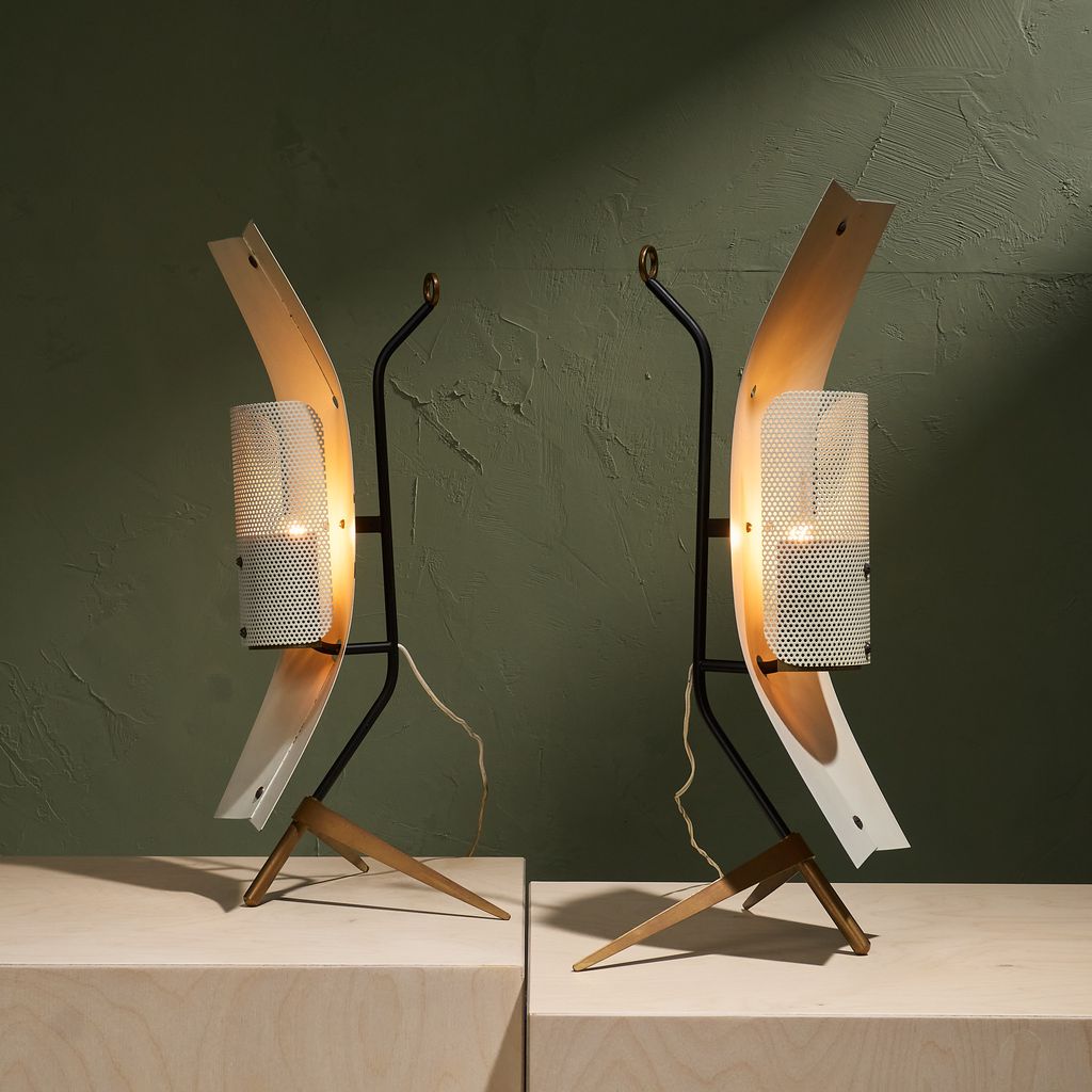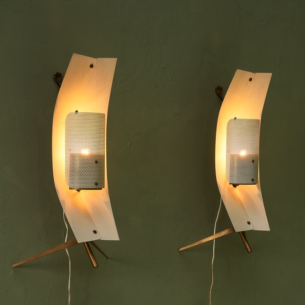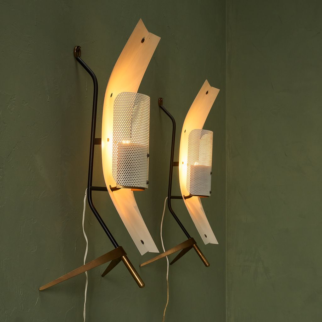 This pair of table or wall lamps was designed by Gastone Colliva and manufactured in Italy in the 1950s. The lamps are made from painted metal and brass. They feature a sculptural form and can be used either as table lamps or wall-mounted lights. Each lamp has a structure that allows for dual functionality. The materials and construction are consistent with mid-century Italian design practices. The lamps have a geometric form and are representative of Colliva's known design style during that period.
