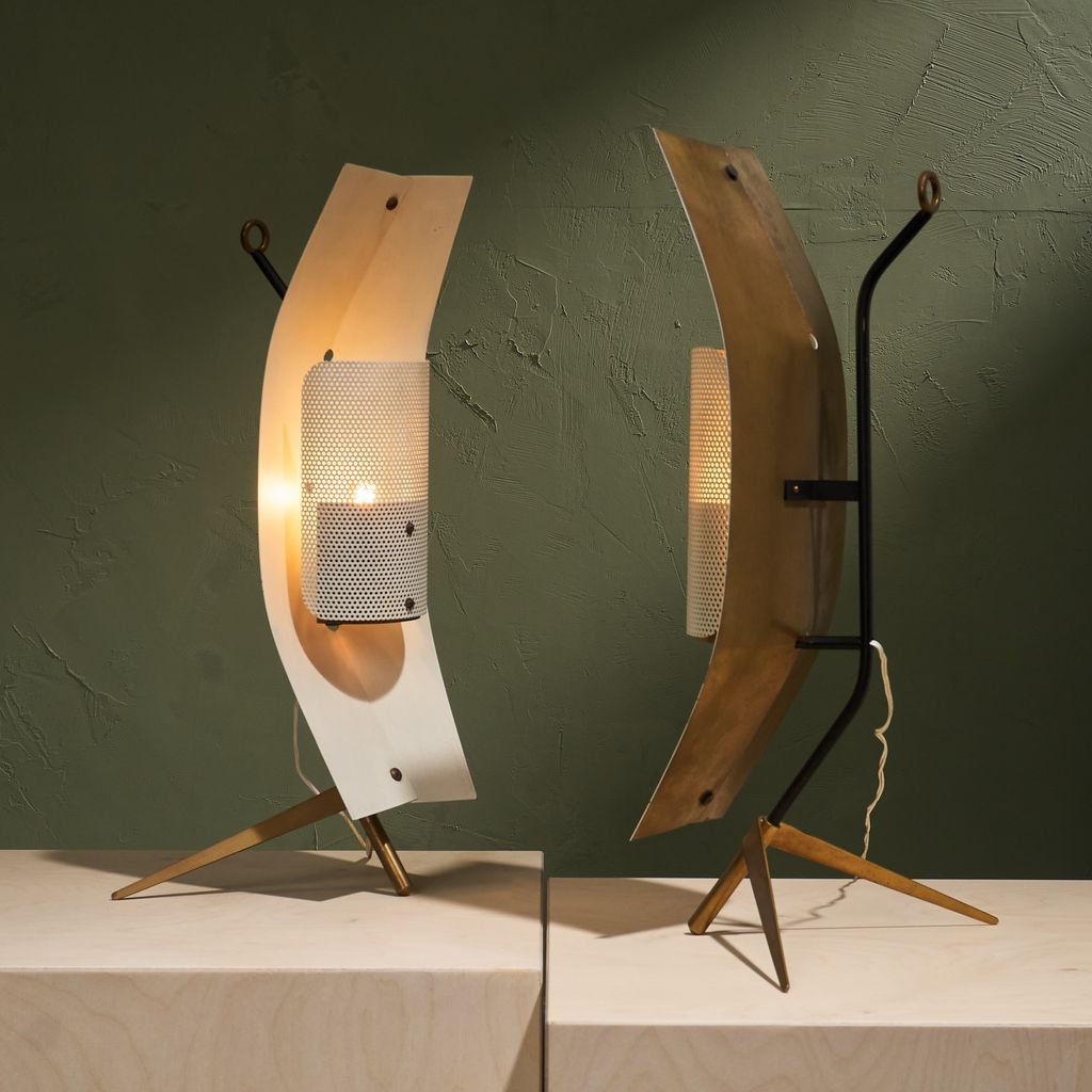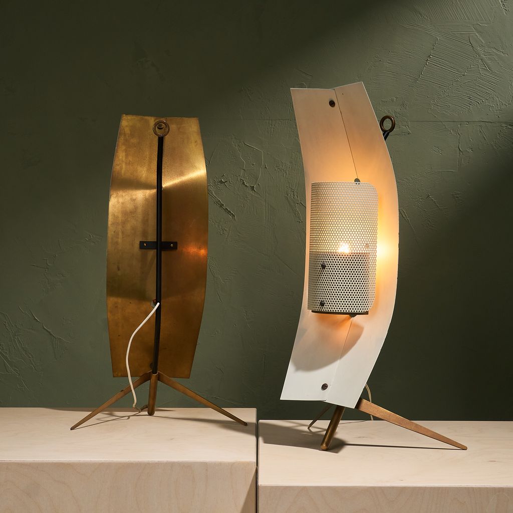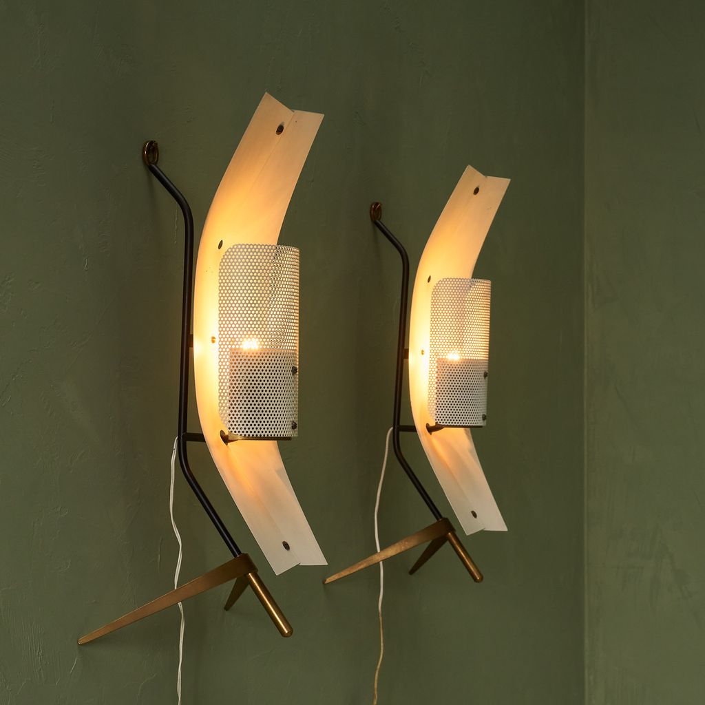 This pair of table or wall lamps was designed by Gastone Colliva and manufactured in Italy in the 1950s. The lamps are made from painted metal and brass. They feature a sculptural form and can be used either as table lamps or wall-mounted lights. Each lamp has a structure that allows for dual functionality. The materials and construction are consistent with mid-century Italian design practices. The lamps have a geometric form and are representative of Colliva's known design style during that period.