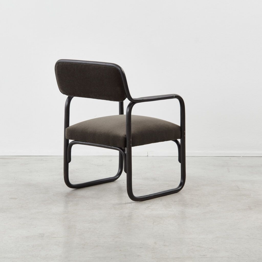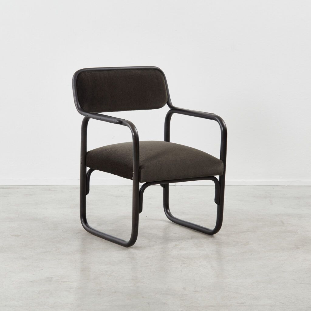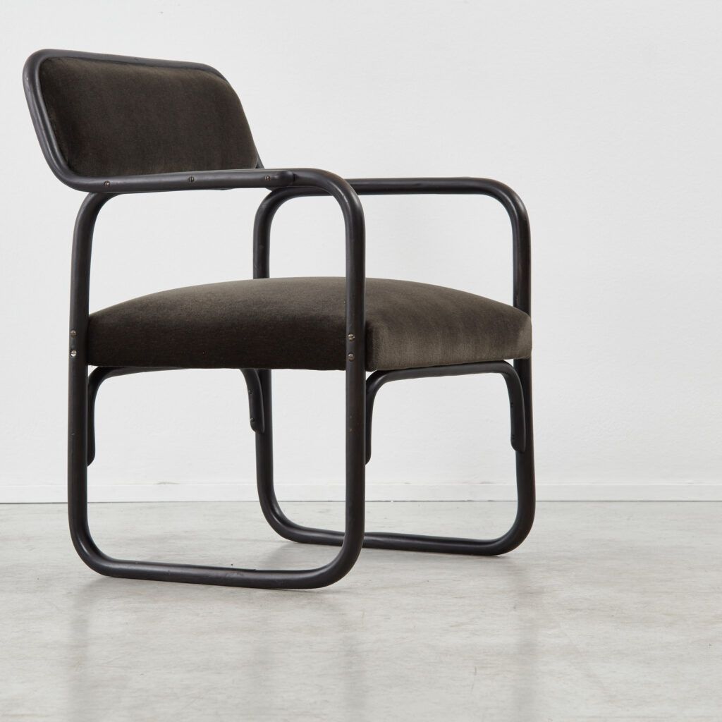 The A 60 series defied expectations with its materiality – its appearance convincingly resembling metal rather than bentwood. Only a year prior, the steel furniture company L. & C. Arnold showcased a near-identical design in tubular steel by architect Arthur Korn in their catalogue. This armchair is a rare specimen from the series, published in the Thonet-Mundus catalog in 1929.