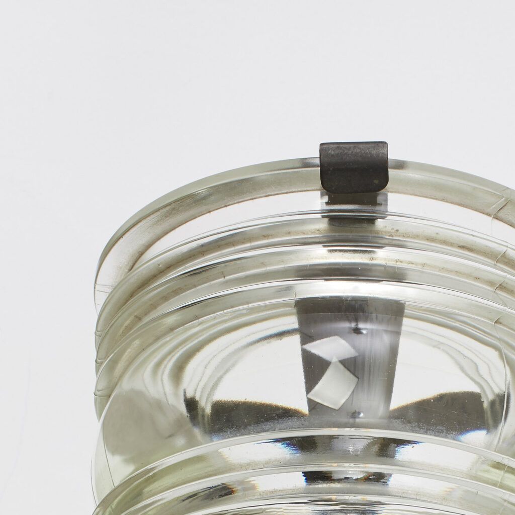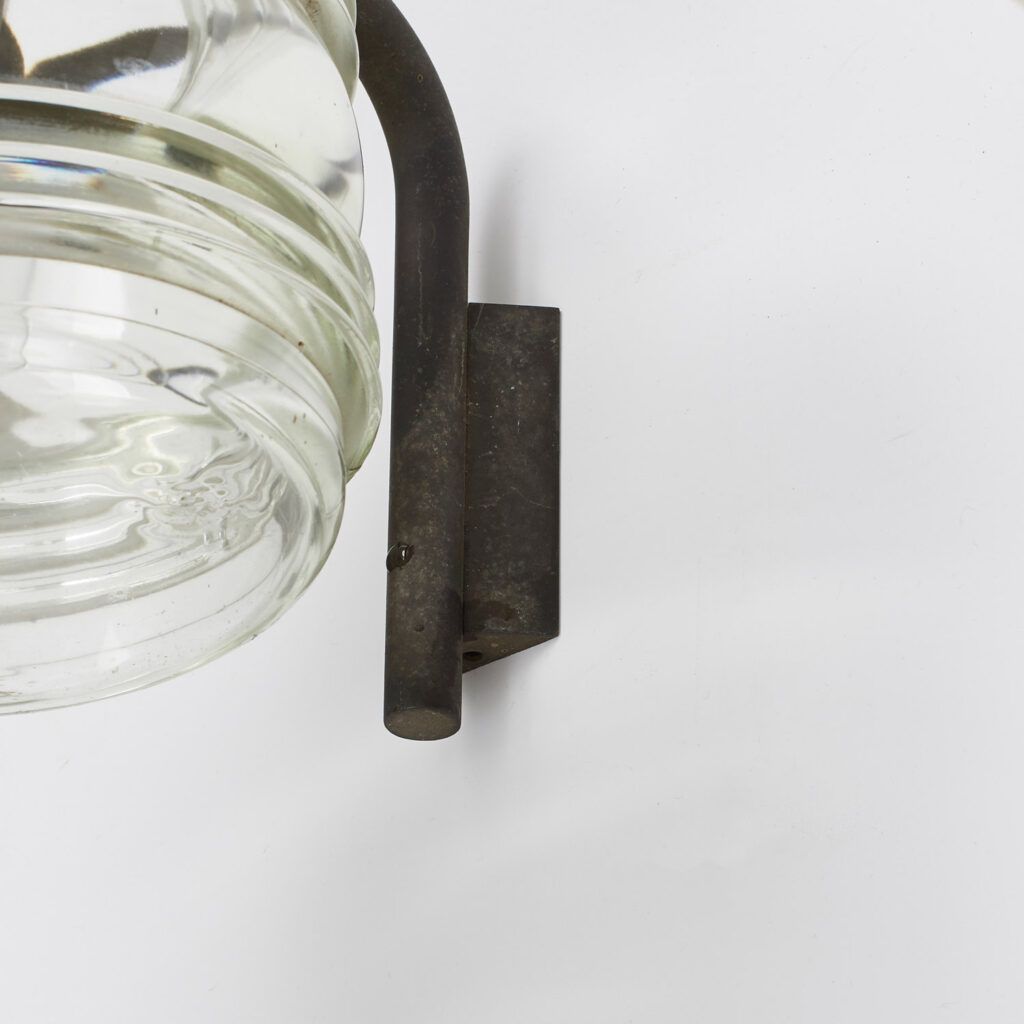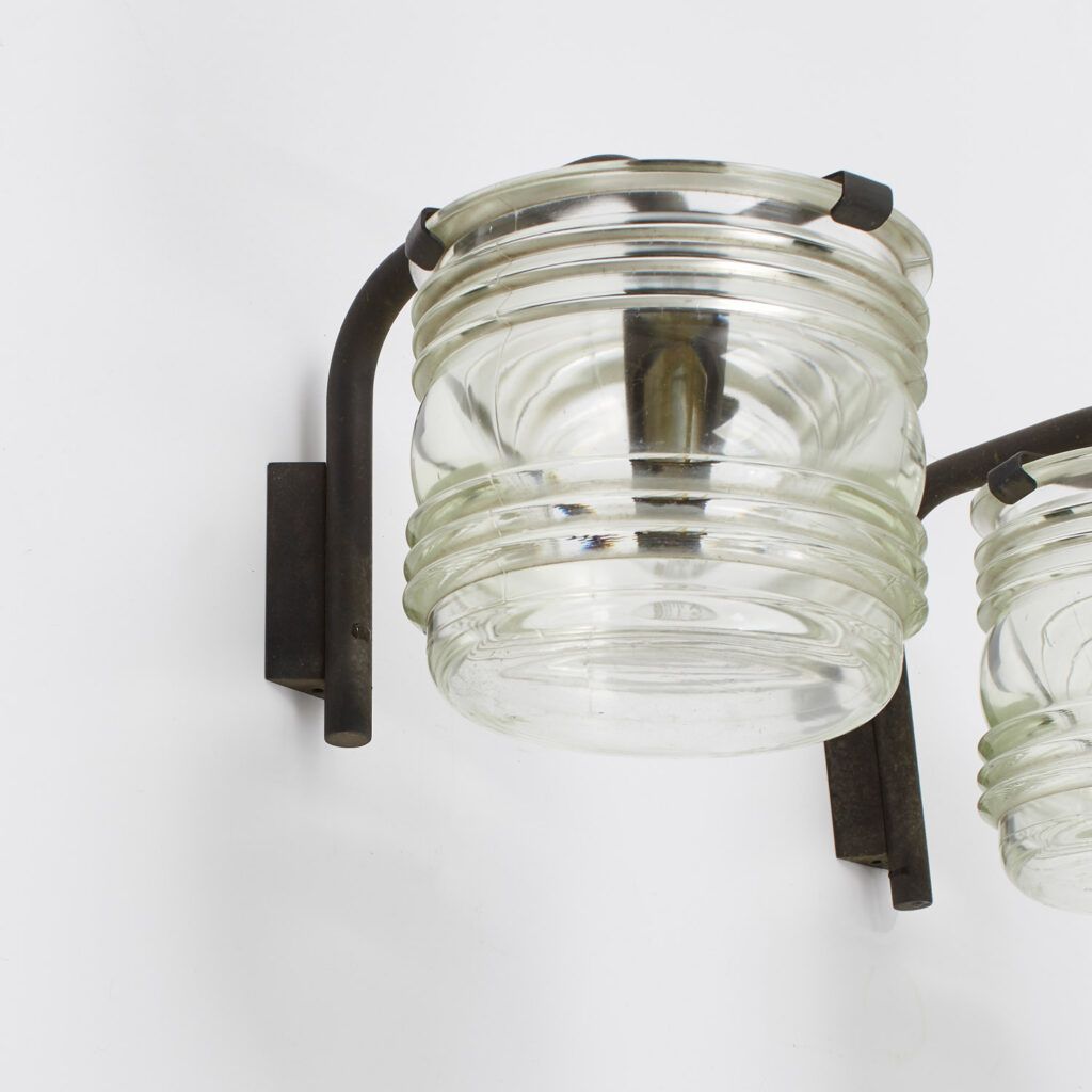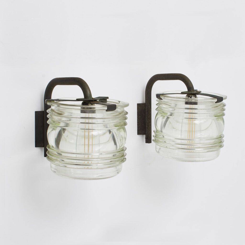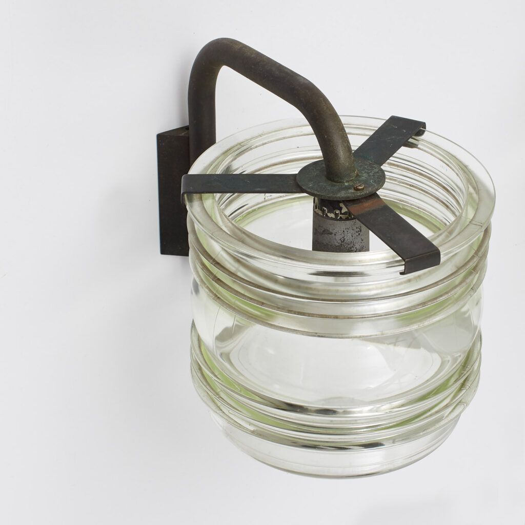 A pair of rare Tito Agnoli wall lamps in metal and ribbed Fresnel-style glass. The use of glass textured in this way is almost anomalous within the designer’s oeuvre, bar a pendant in the same material.