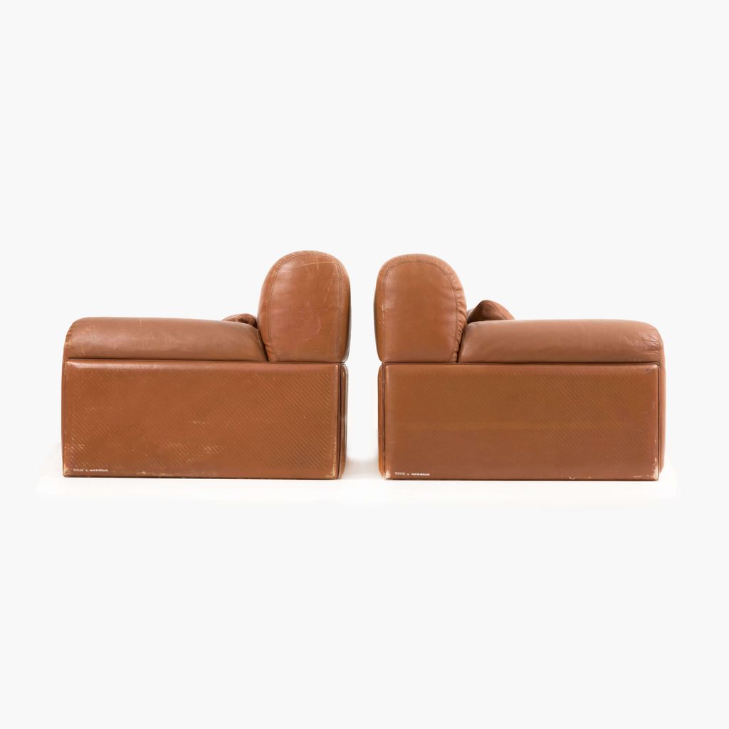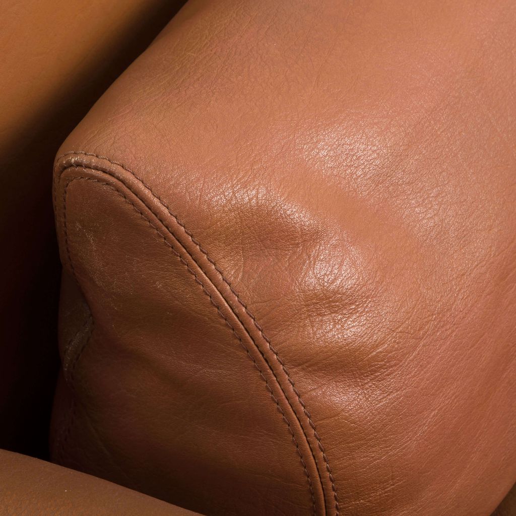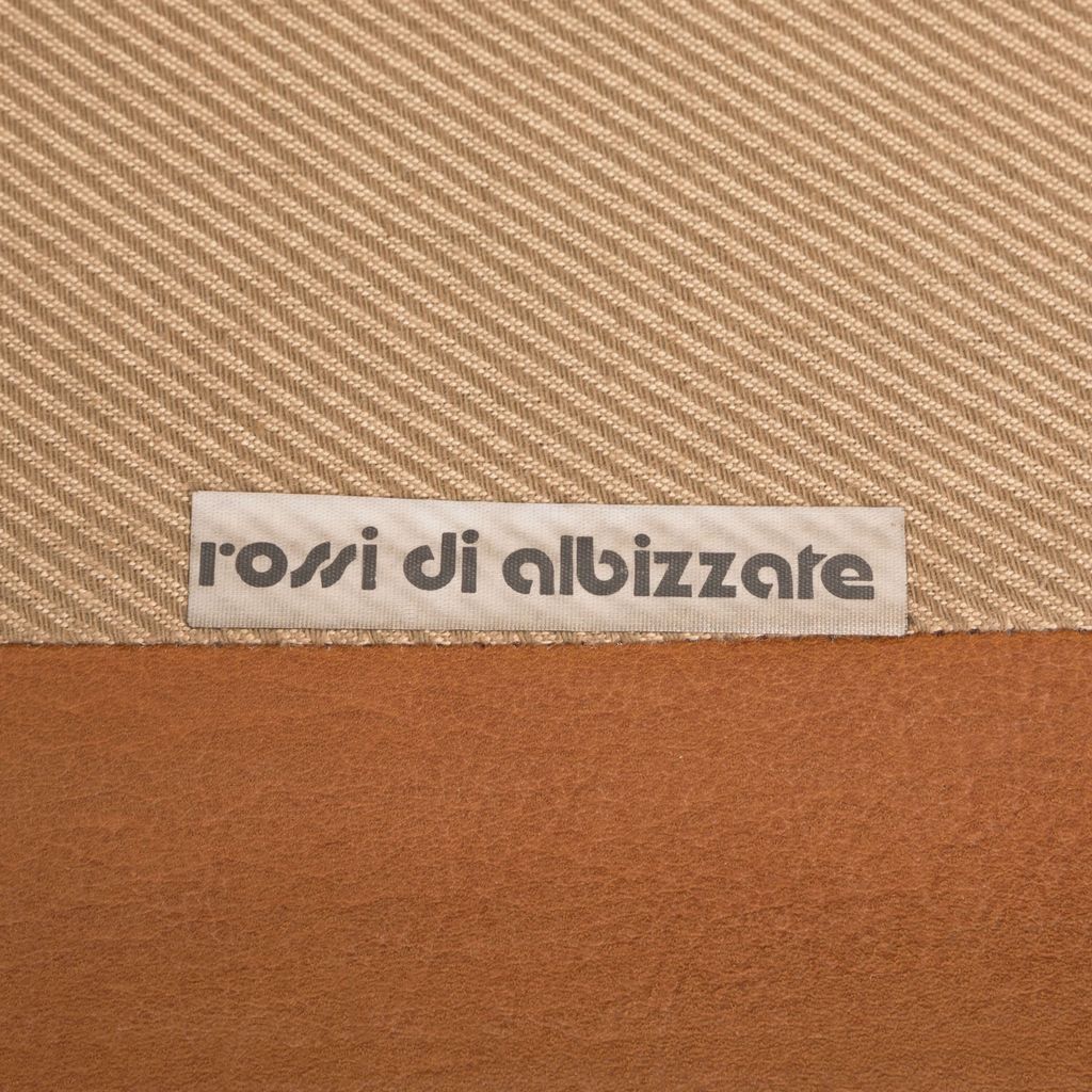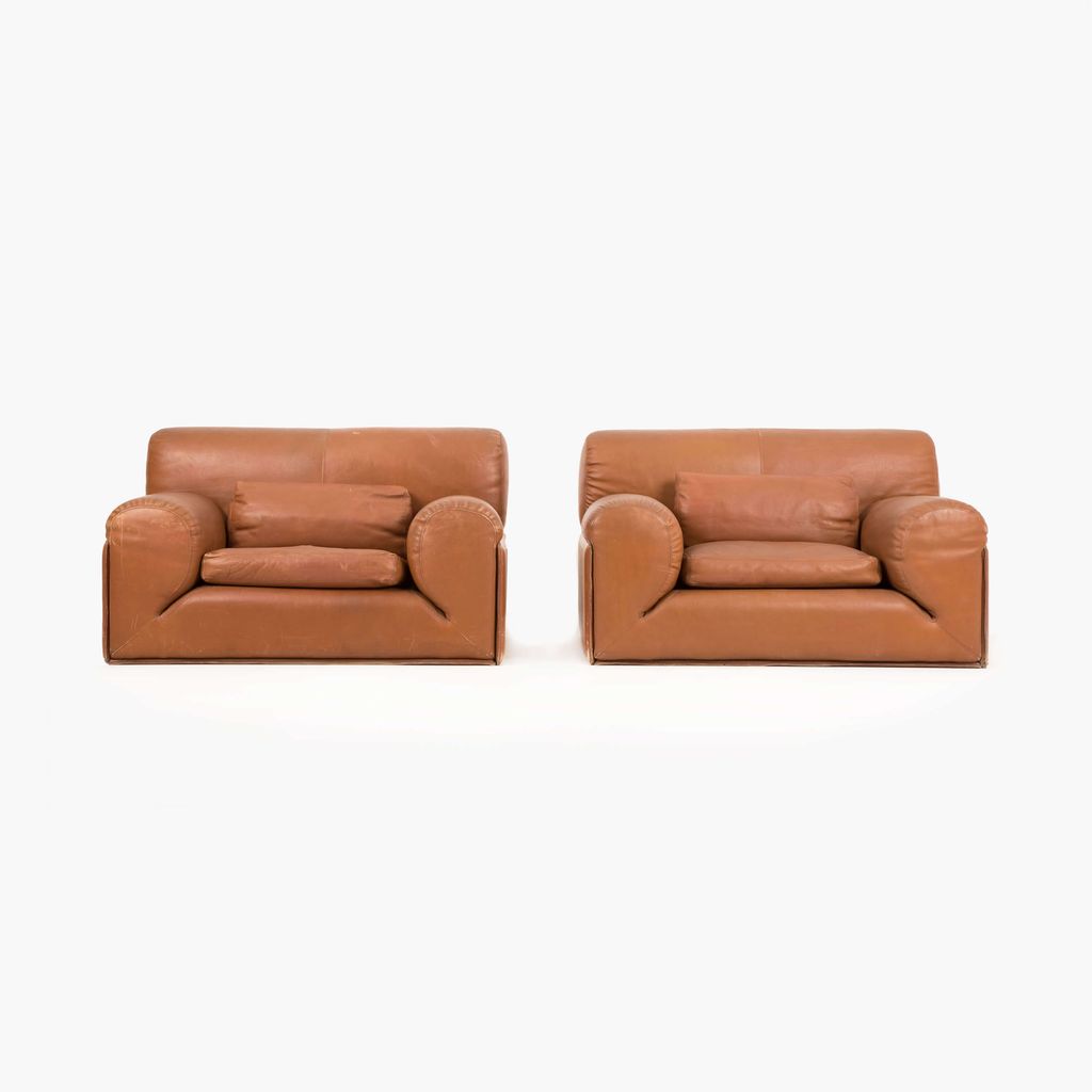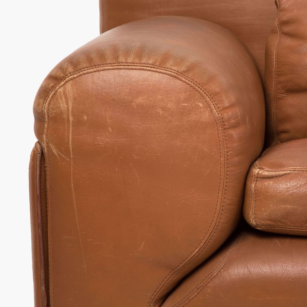 This pair of Touche Leather Armchairs was designed by Giuseppe Rossi for Rossi di Albizzate - one of the most well regarded Italian furniture producers, known for high end contemporary design. The soft, clean lines and well-padded cushions offer luxurious comfort, in original vintage leather upholstery with natural patina and beautiful signs of aging representing the passing of time.