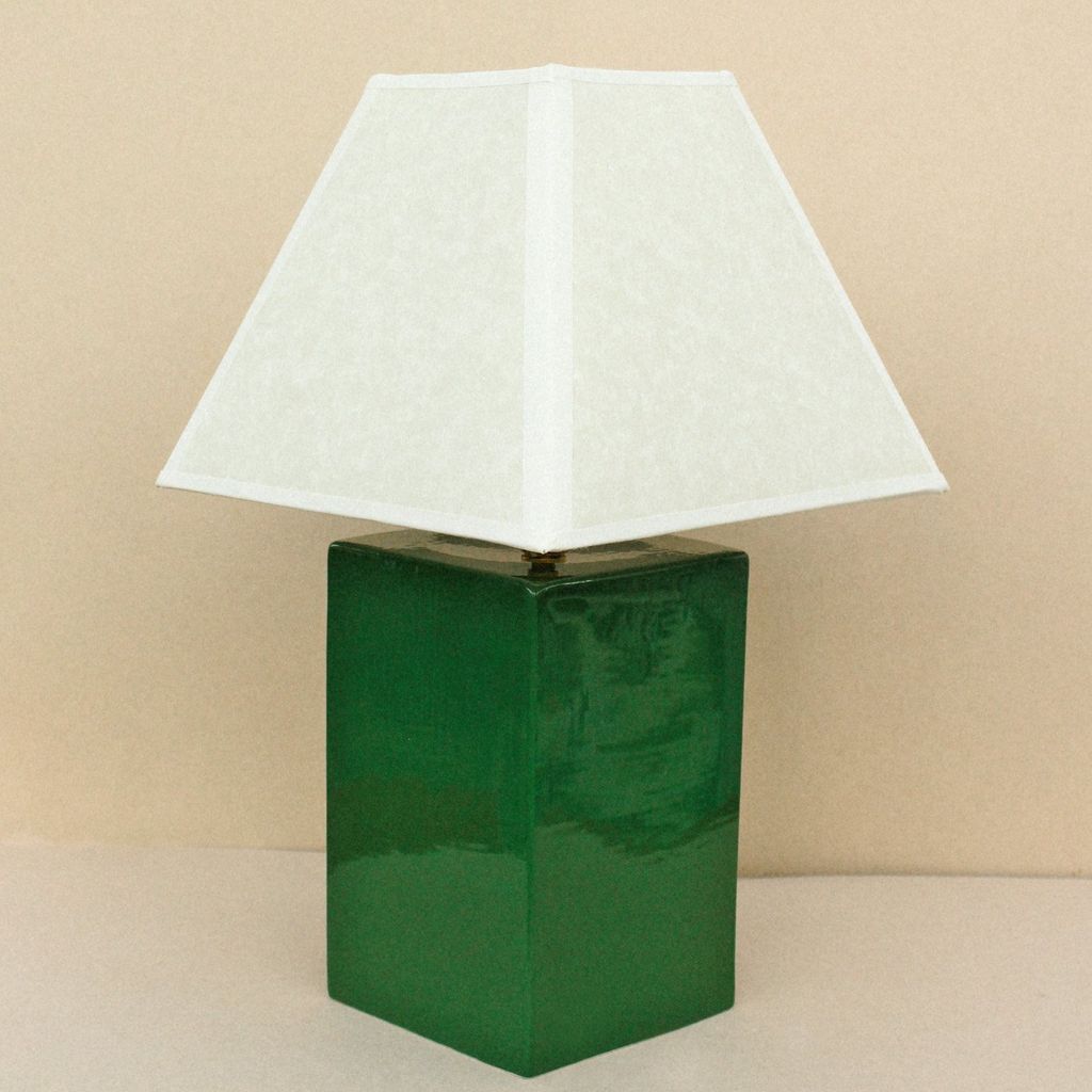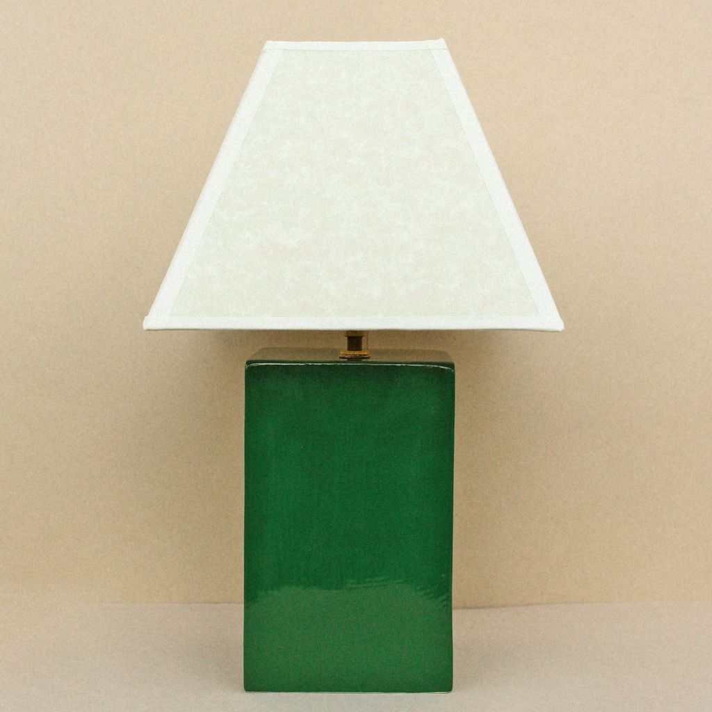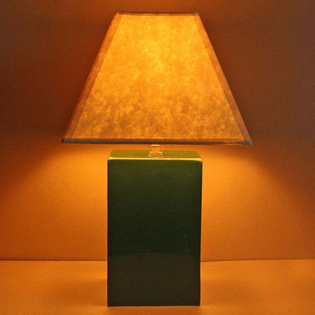 Hand-built and painted ceramic lamp in a dark green glaze; stamped. Custom square lampshade in natural paper parchment; brass clip-on.