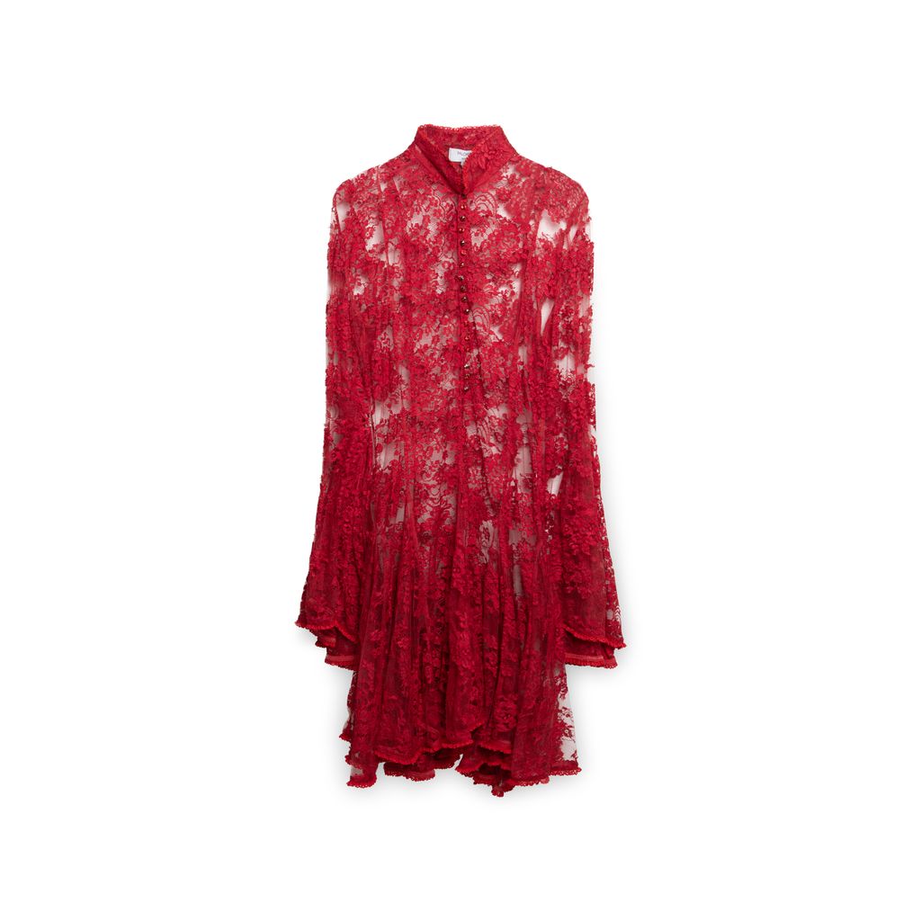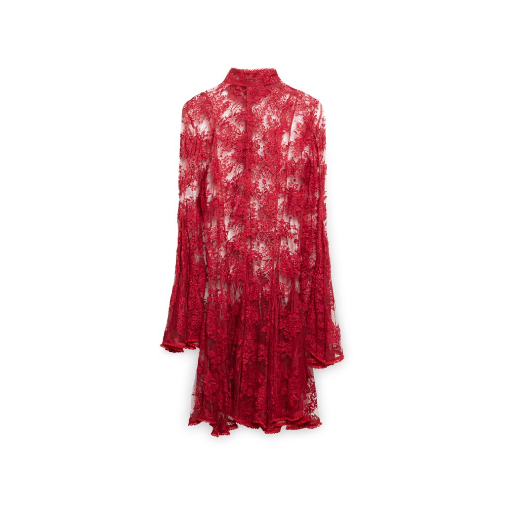 Palomo Spain Red Lace Dress features front snap button closure, bell sleeves, round collar, and red lace trim.