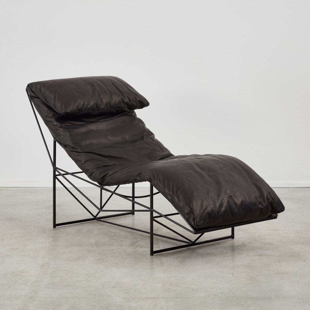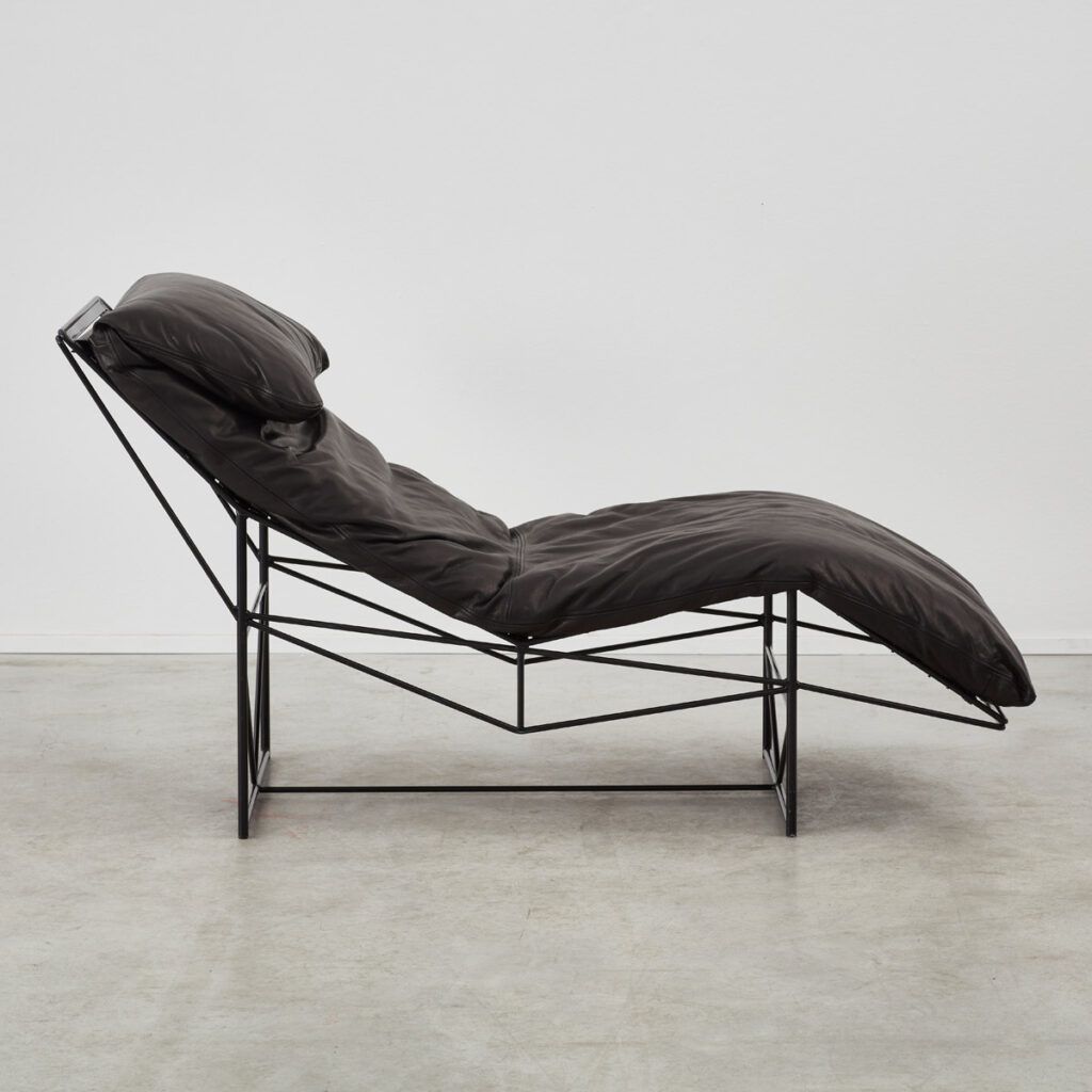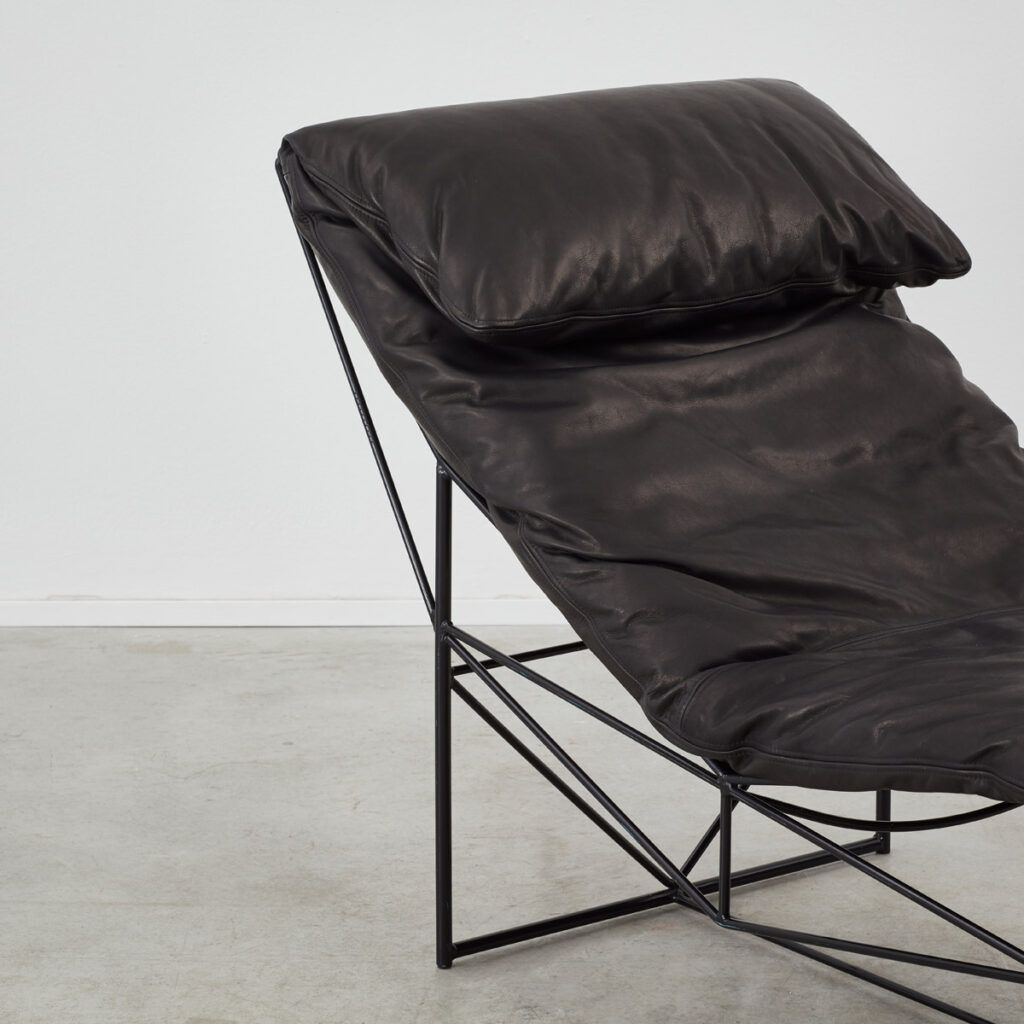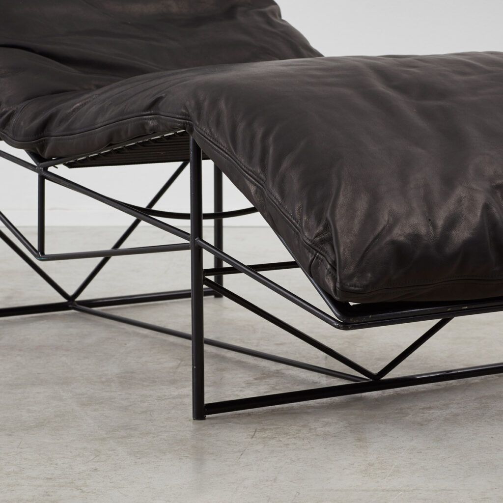 Sculptural chaise longue by Paolo Passerini. The frame is formed of black iron rods joined at angles, creating an Eiffel-structure which supports a buttery leather cushion.