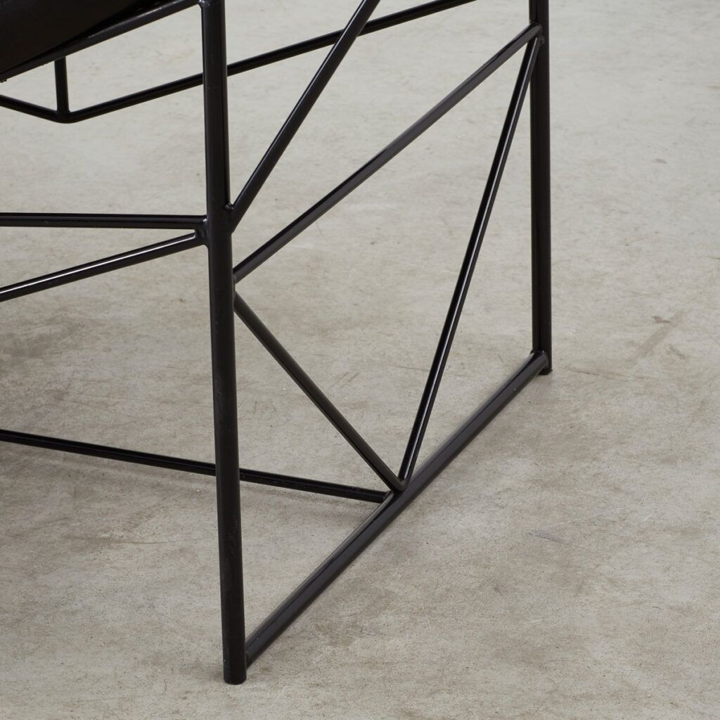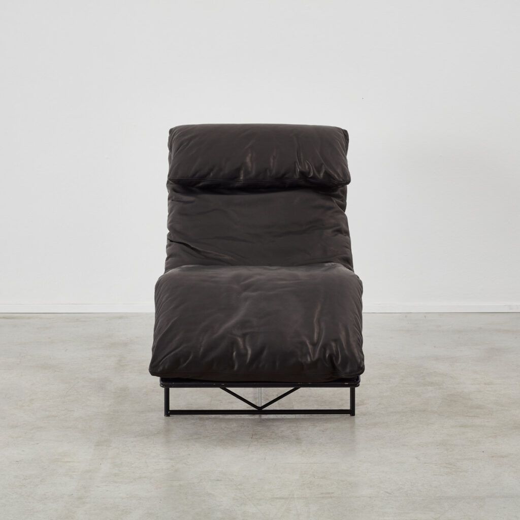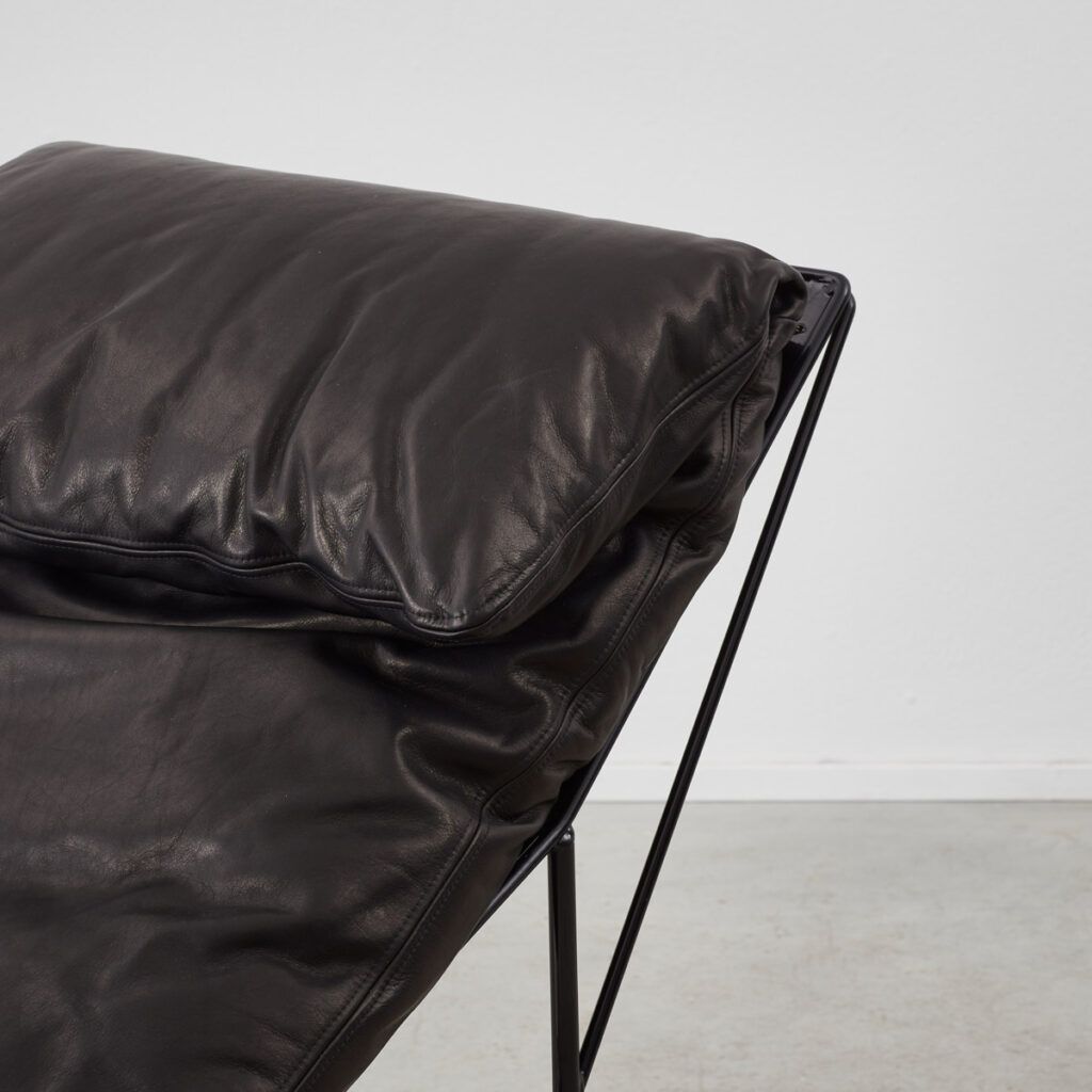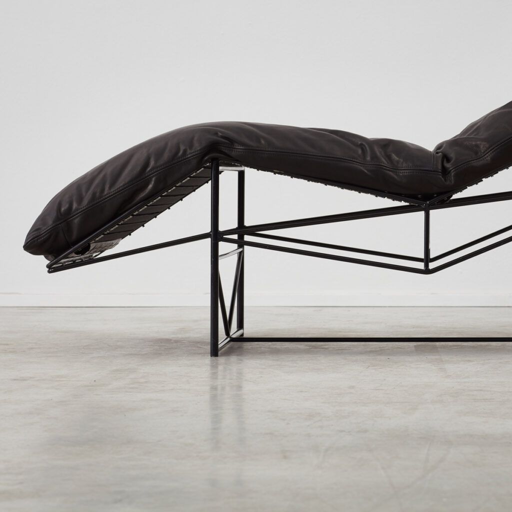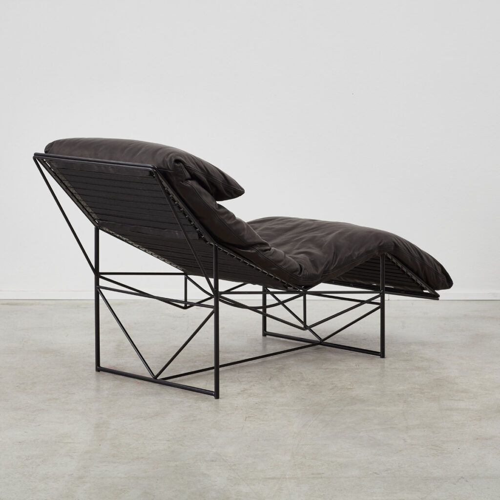 Sculptural chaise longue by Paolo Passerini. The frame is formed of black iron rods joined at angles, creating an Eiffel-structure which supports a buttery leather cushion.