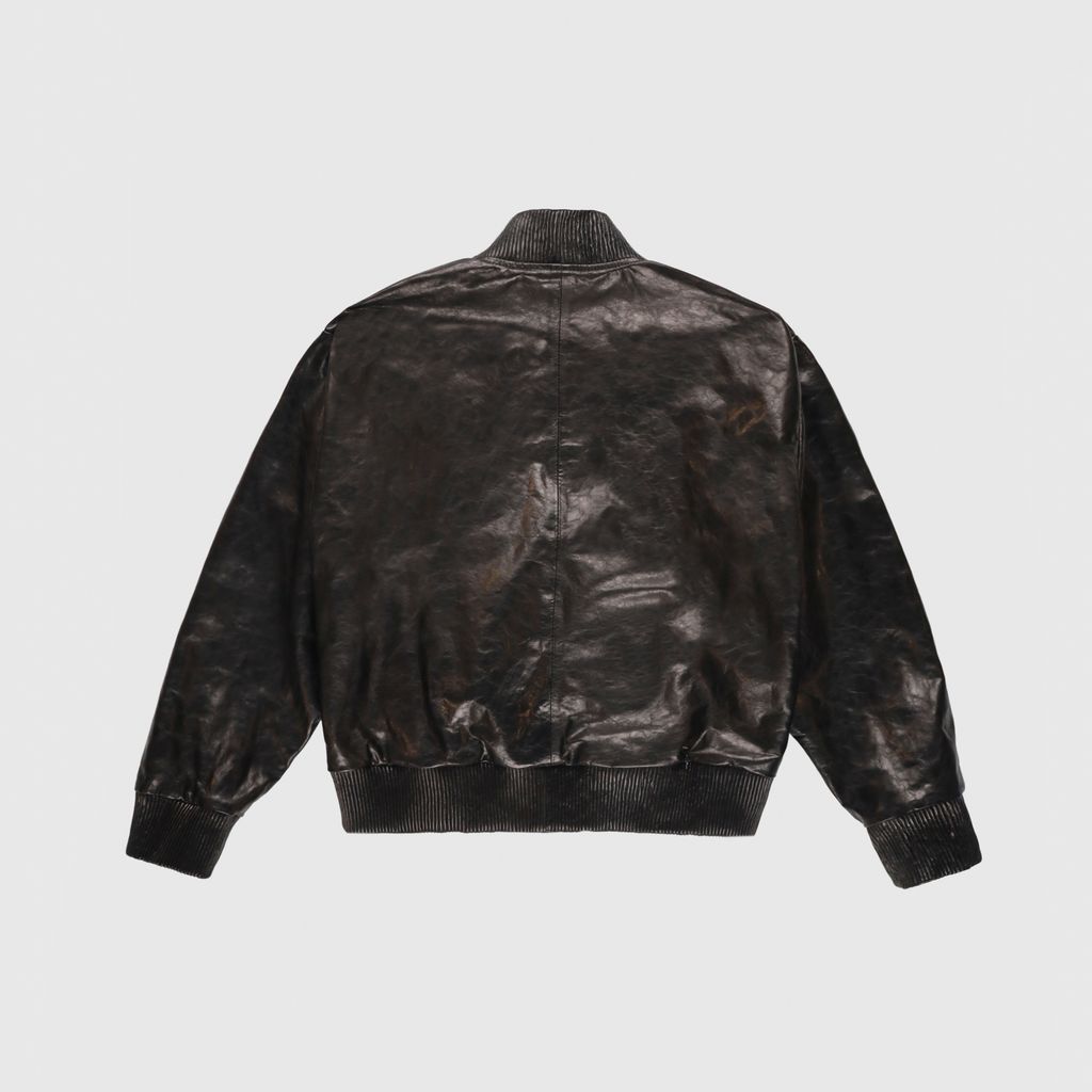 424 Leather City Jacket features Lamb skin leather, crinkle paper effect, ribbed detailing, and button snap closure.