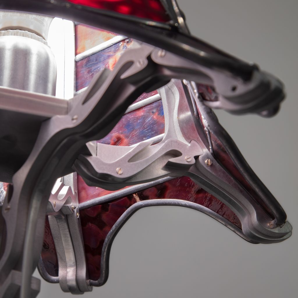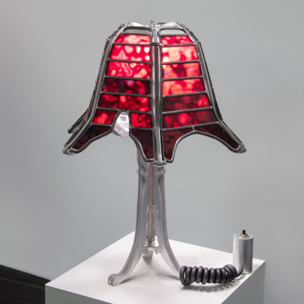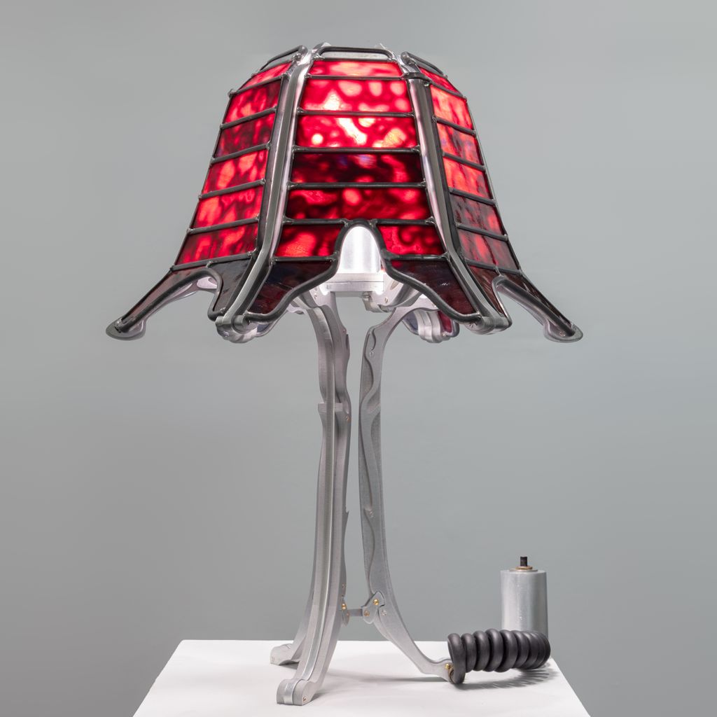 Aluminum, stained glass, solder, electrical components.