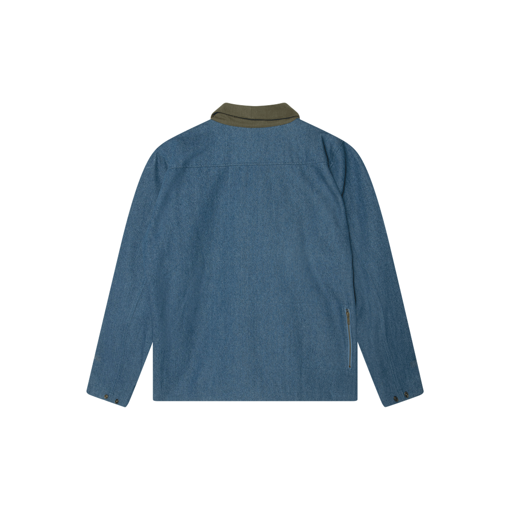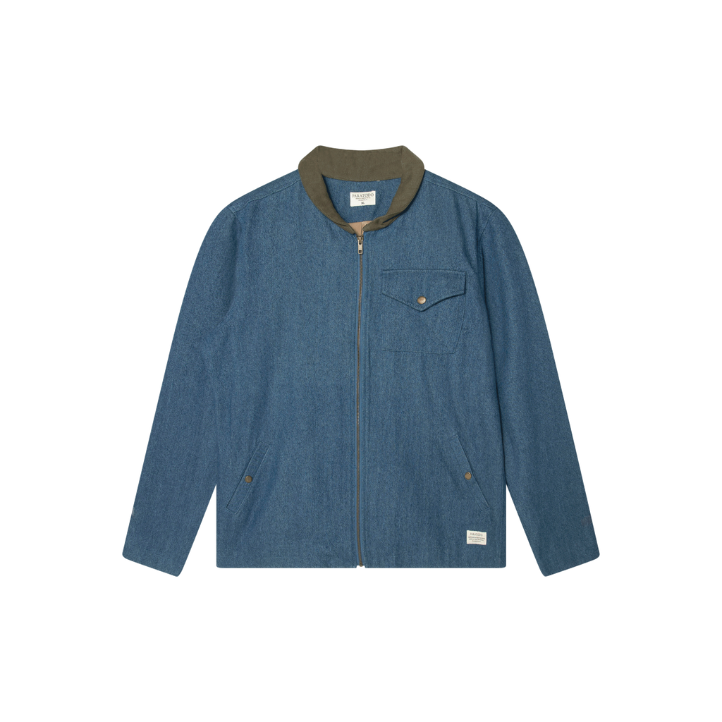 Paratodo Denim Zip Up Jacket features front zip closure, olive green collar, chest patch pocket, and 2 side pockets.