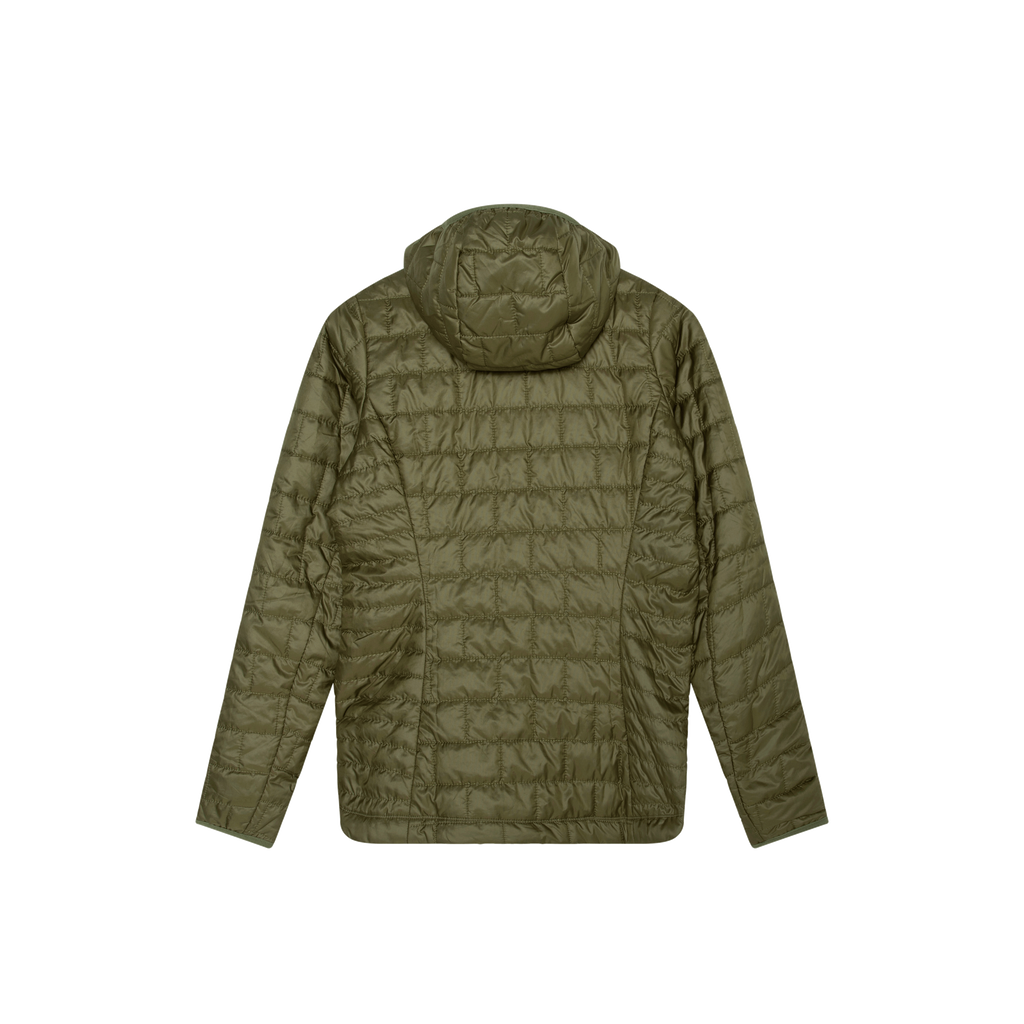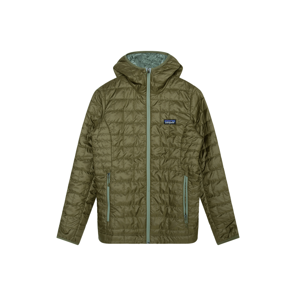 Patagonia Green Nano Puff Hoody features lightweight and highly compressible 60-g PrimaLoft Gold Insulation Eco 100% postconsumer recycled polyester with P.U.R.E. (Produced Using Reduced Emissions) technology, wrapped in a 100% recycled polyester shell and lining.