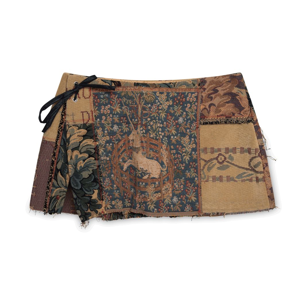 Patch Unicorn Skirt is made from upcycled vintage upholstery fabrics with vintage unicorn tapestry front. With silk facing and ties at the waist.