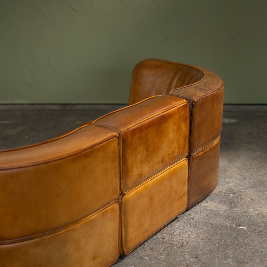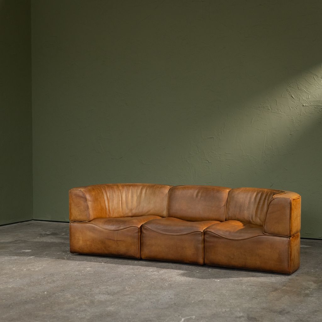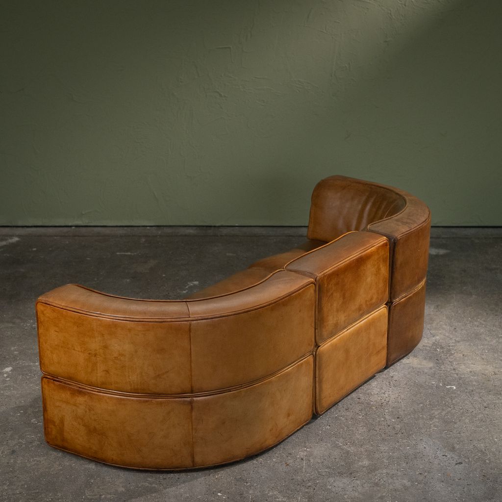 This Original Patinated Cognac Leather DS-15 modular sofa was produced by De Sede in Switzerland during the 1970s. It consists of three individual elements: two curved end sections and one straight middle section, forming a three-seat configuration. The sofa is upholstered in original cognac-colored leather with natural patina developed through use and time. The modular structure allows the elements to be arranged in different compositions, either as a continuous seating line or separated as individual lounge units. De Sede developed the DS-15 series with a focus on ergonomic construction and high-quality leatherwork, manufactured by skilled craftsmen in Klingnau, Switzerland. This model represents the company’s approach to adaptable furniture systems that respond to various interior layouts while maintaining consistent proportions, material continuity, and structural integrity.