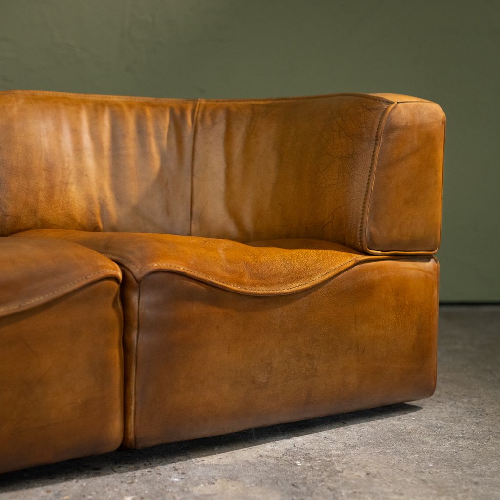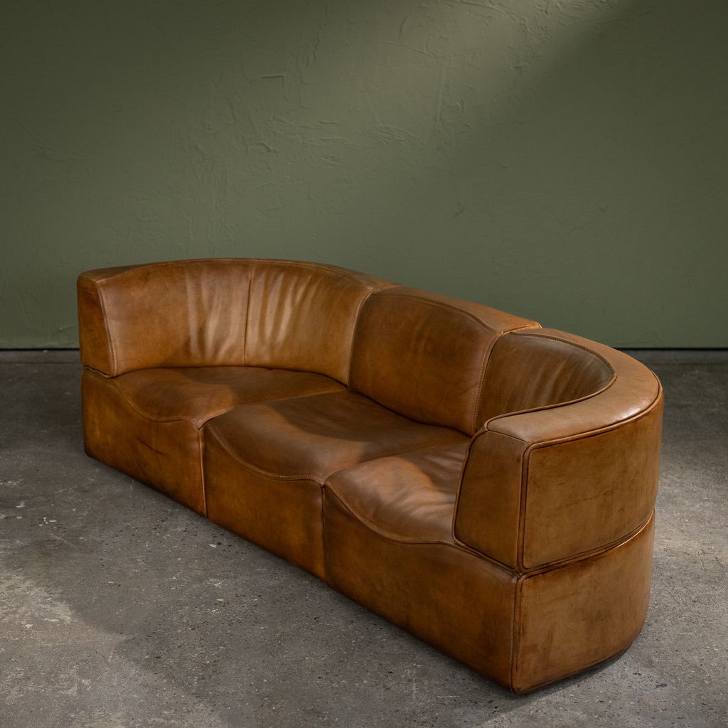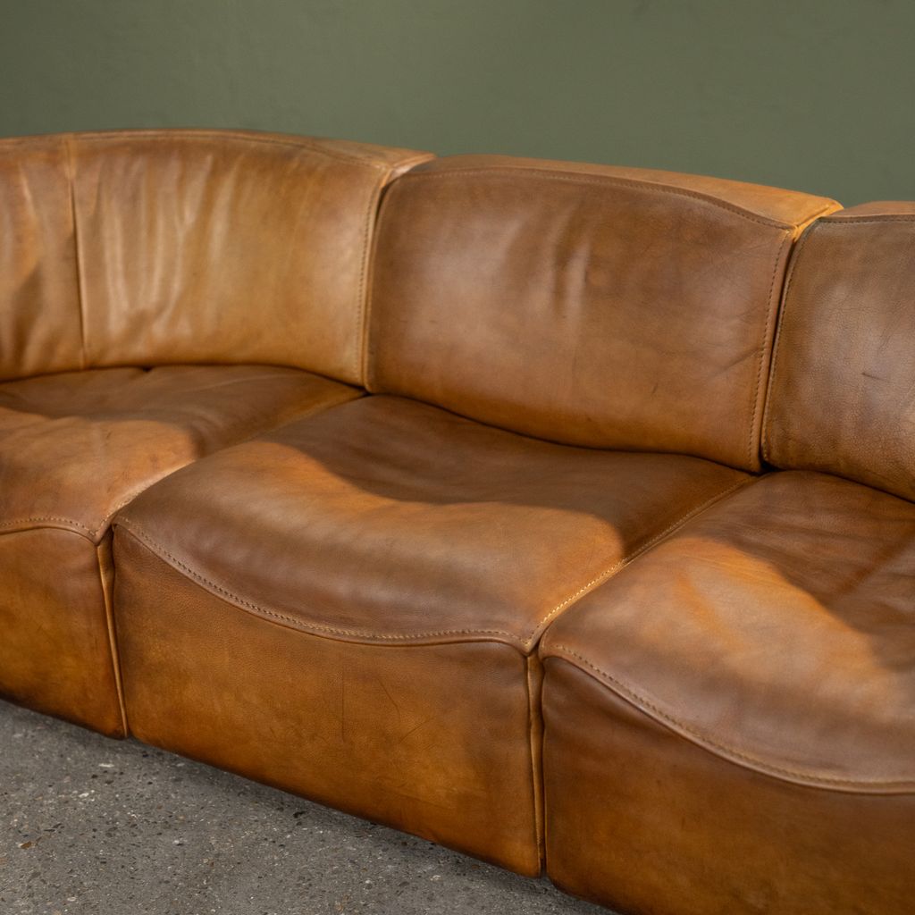 This Original Patinated Cognac Leather DS-15 modular sofa was produced by De Sede in Switzerland during the 1970s. It consists of three individual elements: two curved end sections and one straight middle section, forming a three-seat configuration. The sofa is upholstered in original cognac-colored leather with natural patina developed through use and time. The modular structure allows the elements to be arranged in different compositions, either as a continuous seating line or separated as individual lounge units. De Sede developed the DS-15 series with a focus on ergonomic construction and high-quality leatherwork, manufactured by skilled craftsmen in Klingnau, Switzerland. This model represents the company’s approach to adaptable furniture systems that respond to various interior layouts while maintaining consistent proportions, material continuity, and structural integrity.