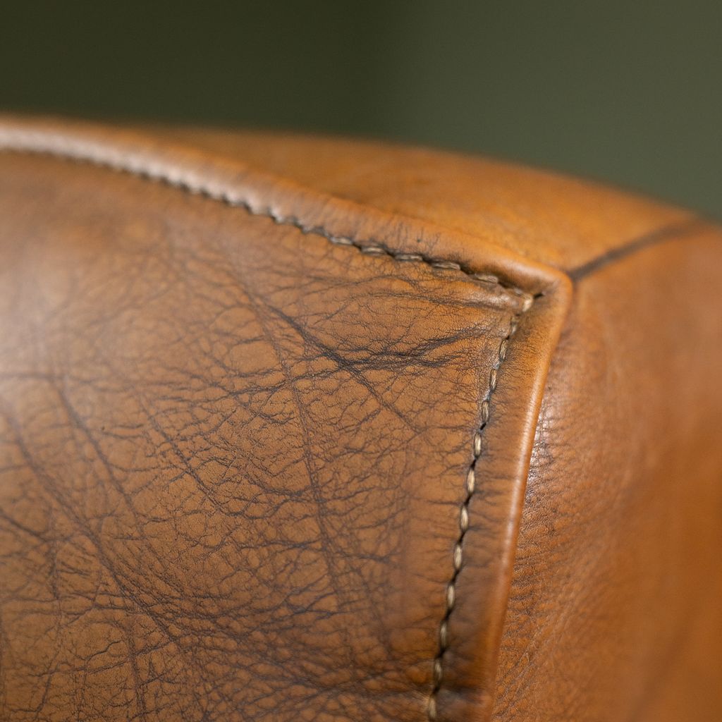 Condition: The sofa is upholstered in original cognac leather showing a strong patina developed through use over time. The leather has been cleaned, treated and nourished with a natural beeswax finish to preserve and strengthen its condition. Signs of wear and aging are present. The back of one element has a slightly darker patina than the other two elements due to less exposure to sunlight in their previous home. The seating remains structurally sound and maintains its original comfort level.