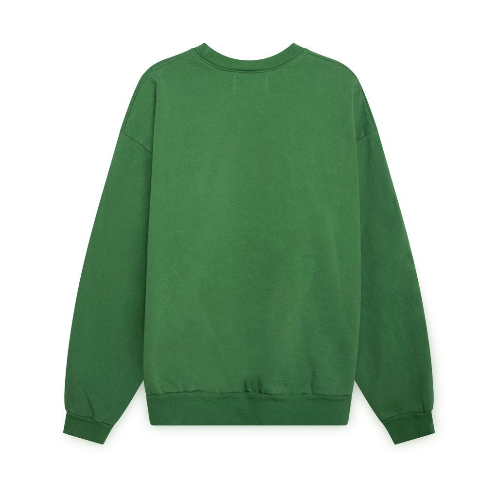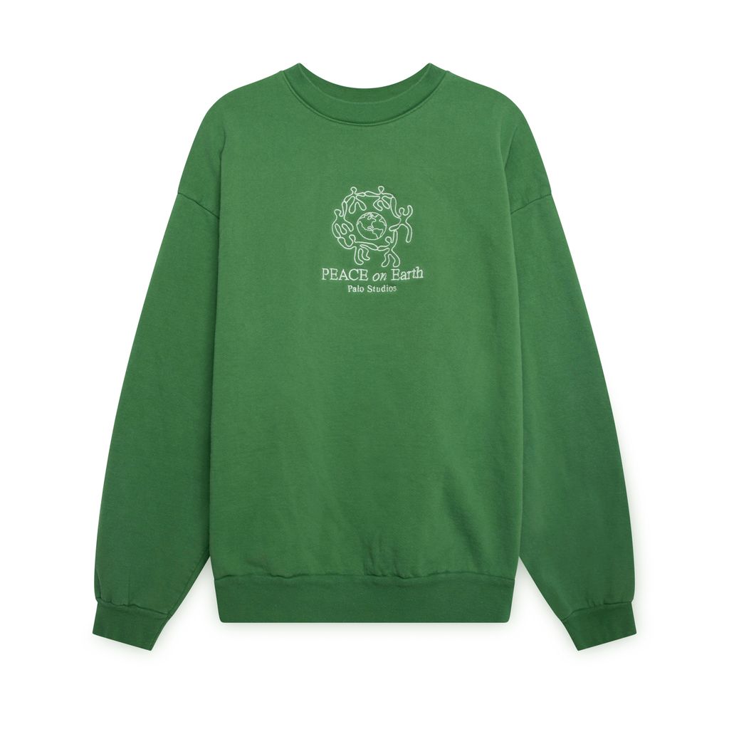 Peace on Earth Crewneck features white embroidered text on the chest and ribbed edging.