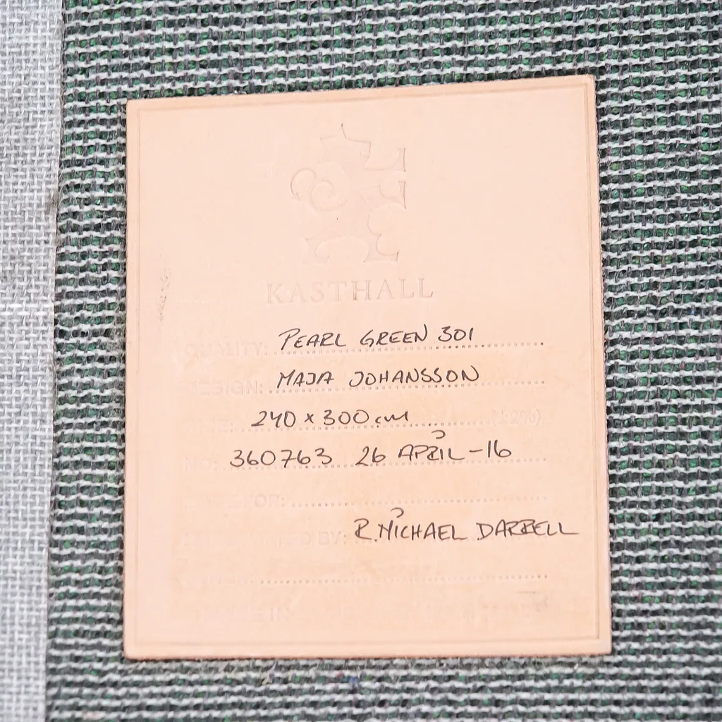This is a Kasthall area rug woven with pure wool and linen in green. The rug was designed by Maja Johansson Starander and produced by Kasthall in Sweden. It dates to circa 2016 and is guaranteed as authentic. Condition is very good to excellent. See photos.