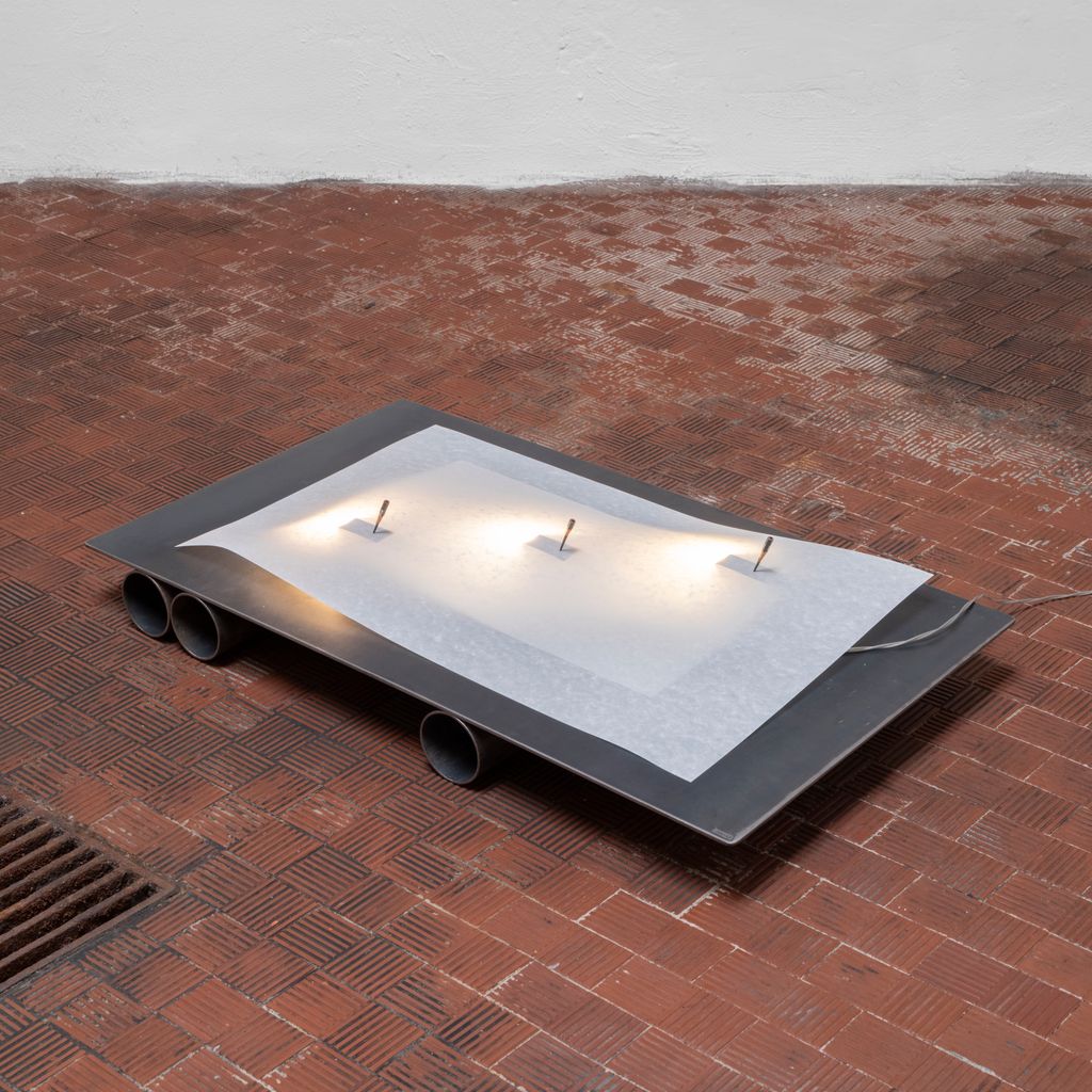 Pencil, bronze, paper, hardwood, electrical components.