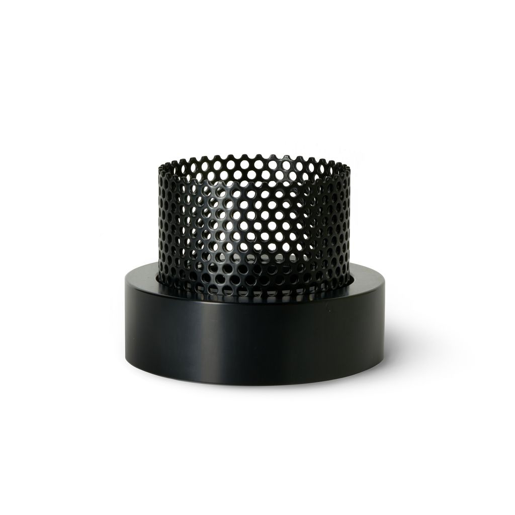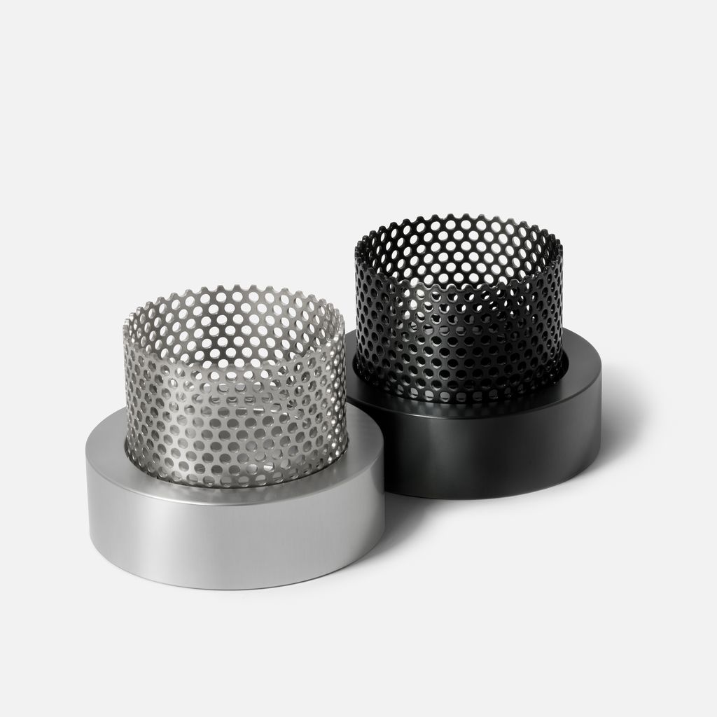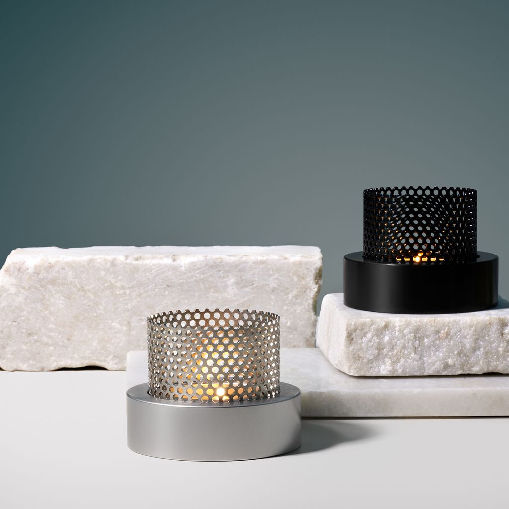 Perform is a solid metal candle holder in two parts, a CNC-milled base in aluminium and a perforated steel tube made in a factory in Sweden.