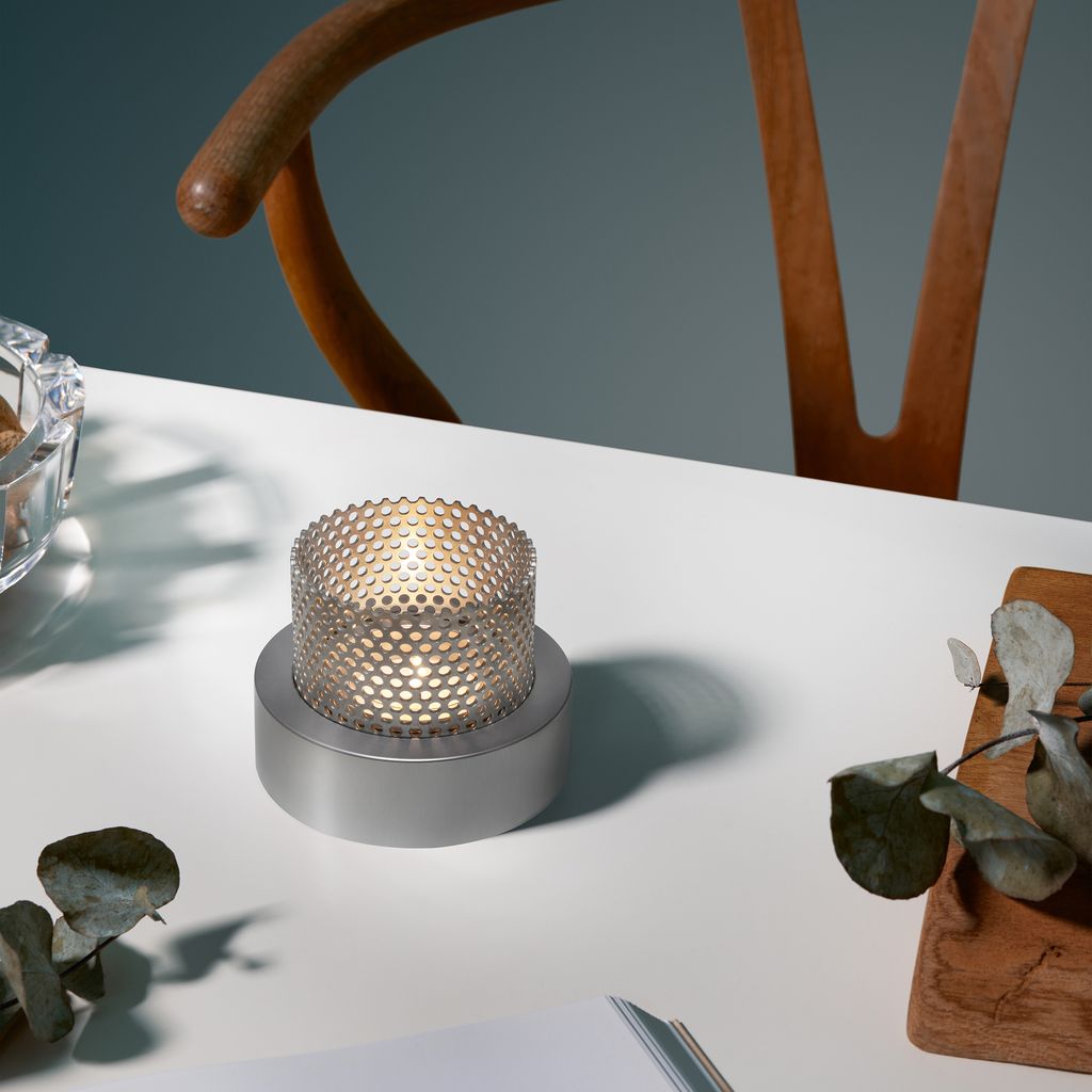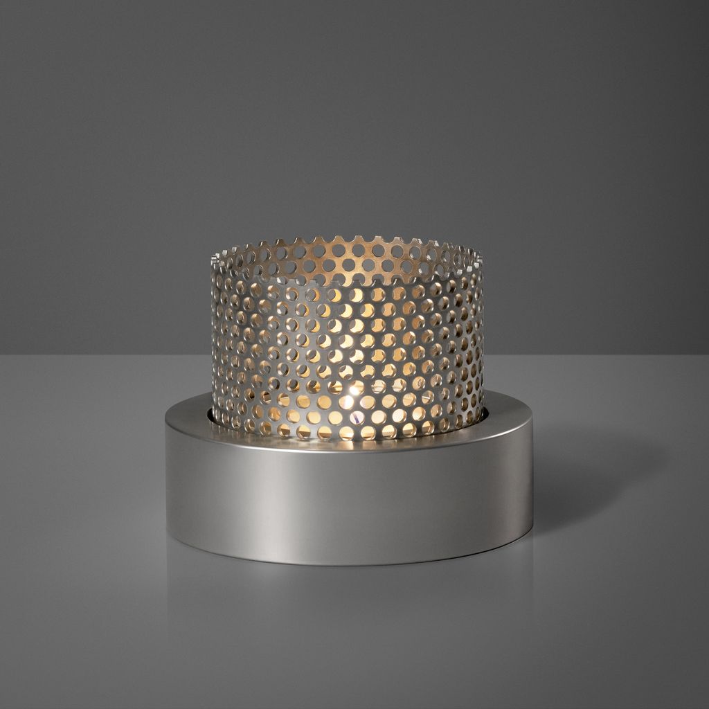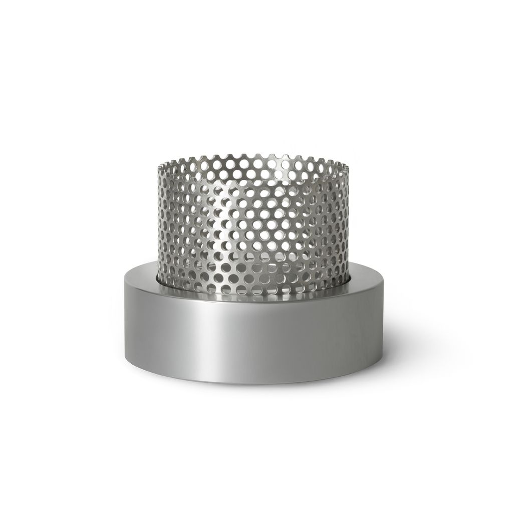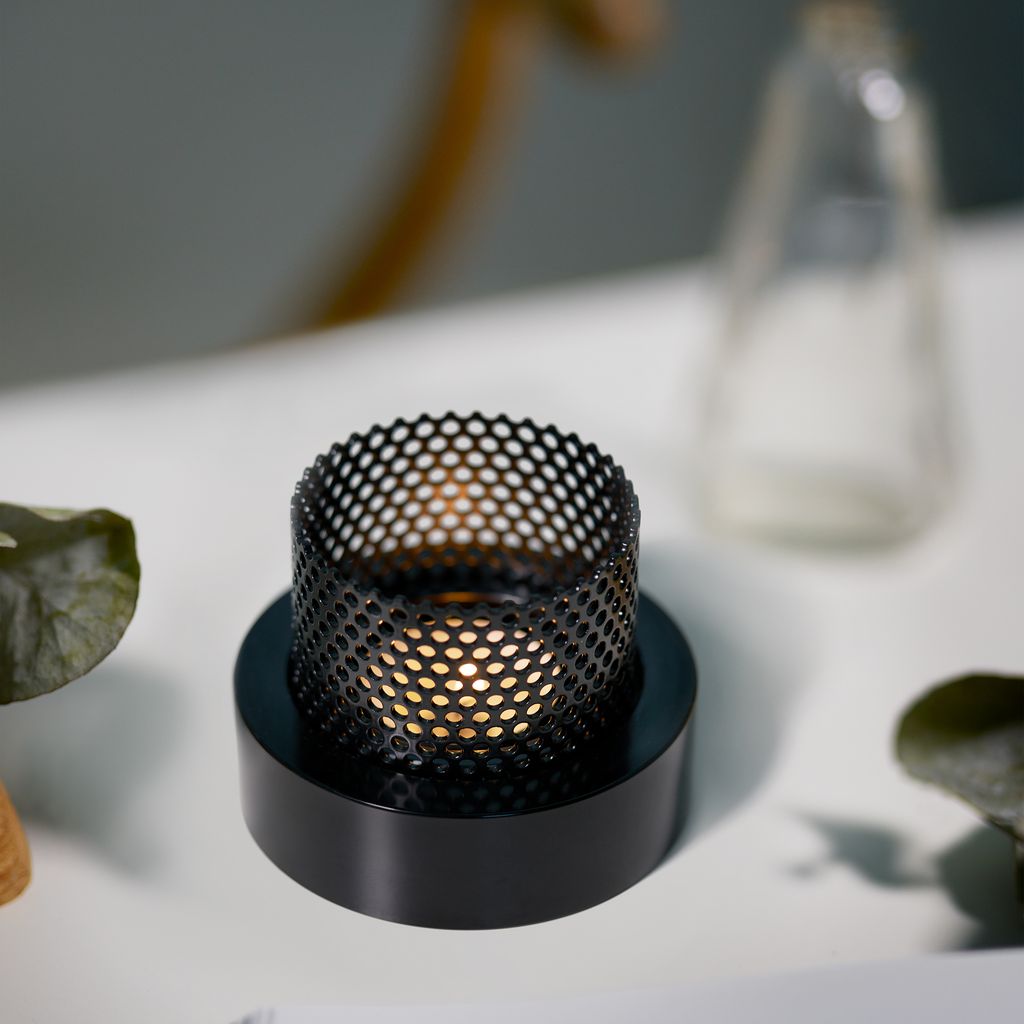 Perform is a solid metal candle holder in two parts, a CNC-milled base in aluminium and a perforated steel tube made in a factory in Sweden.